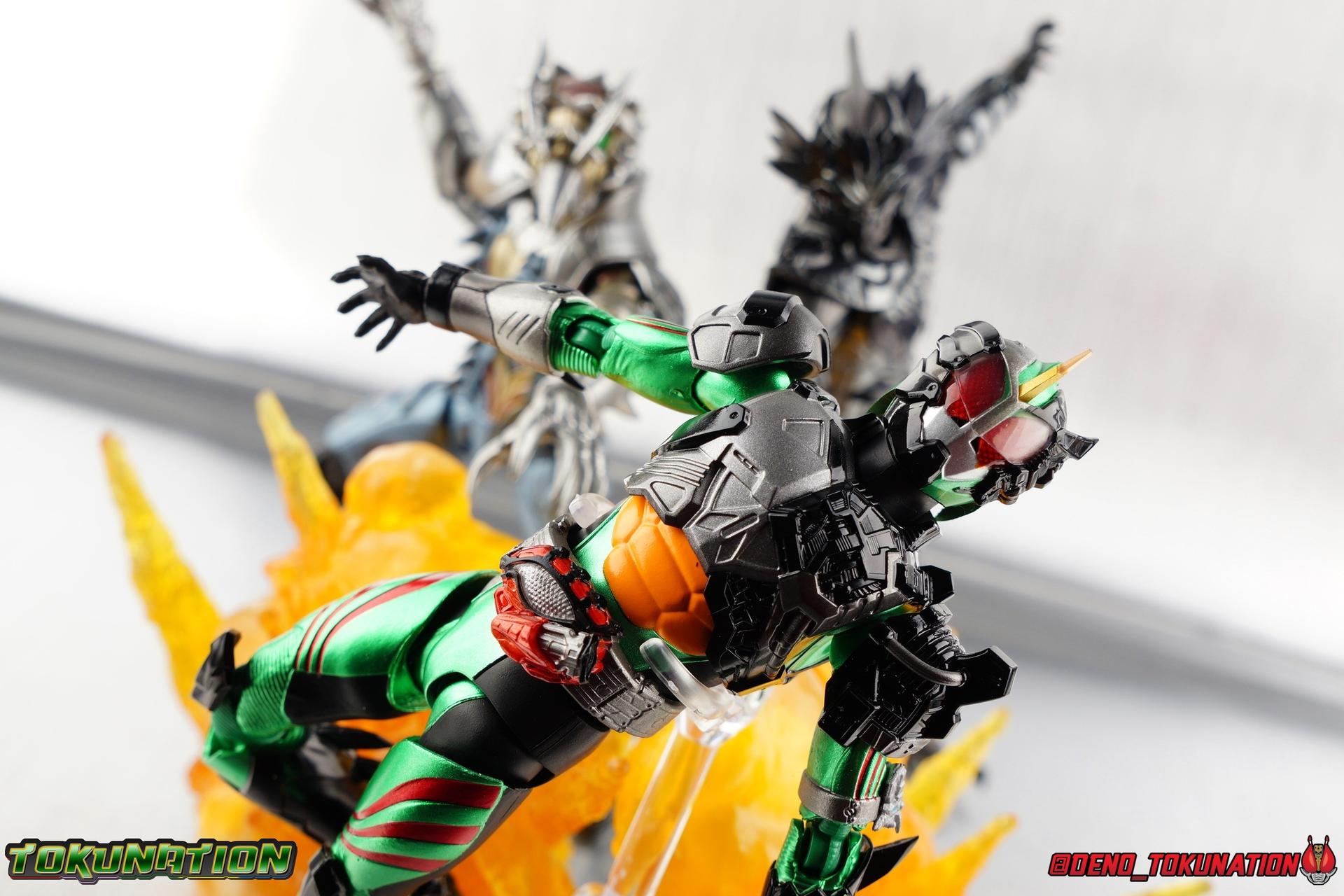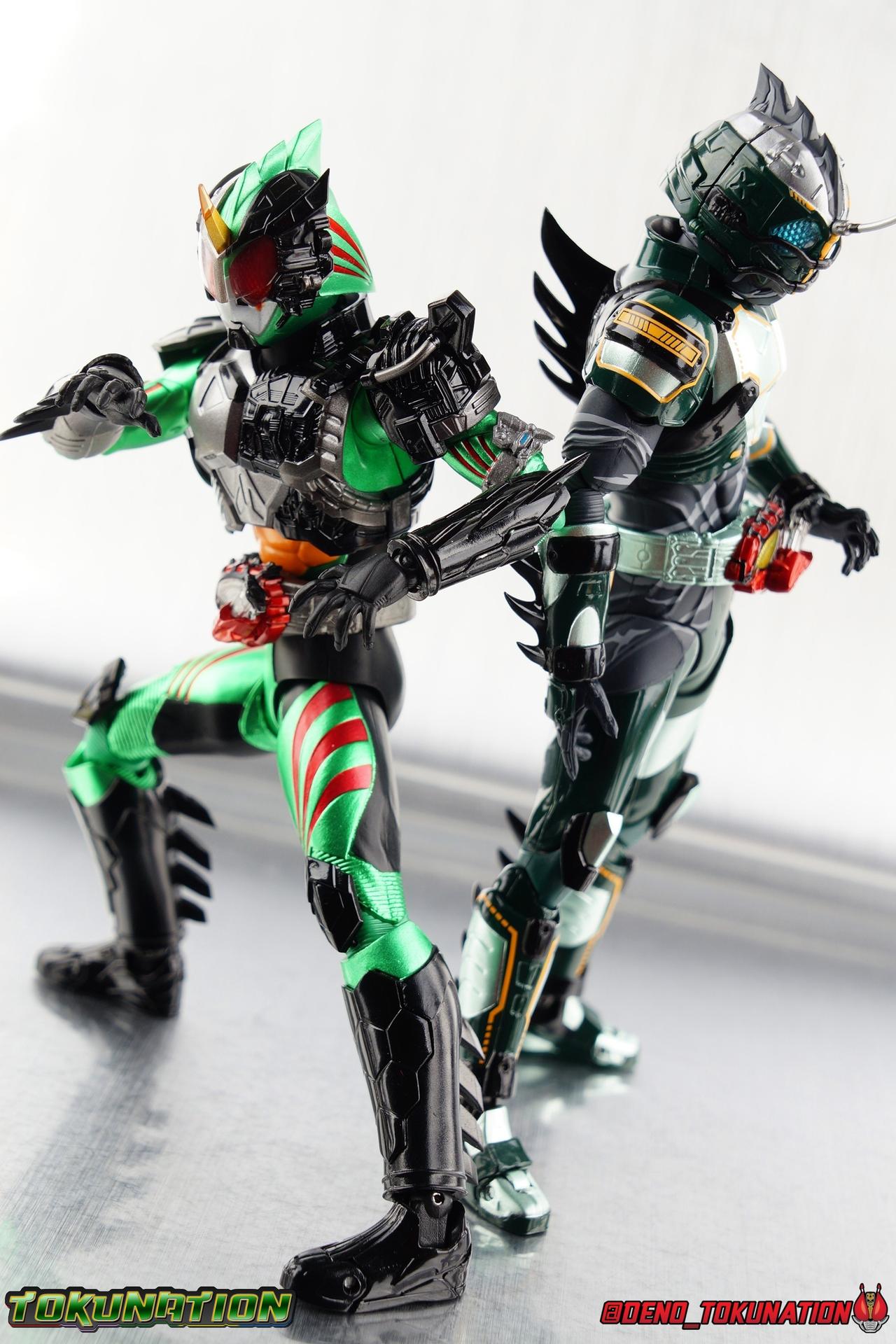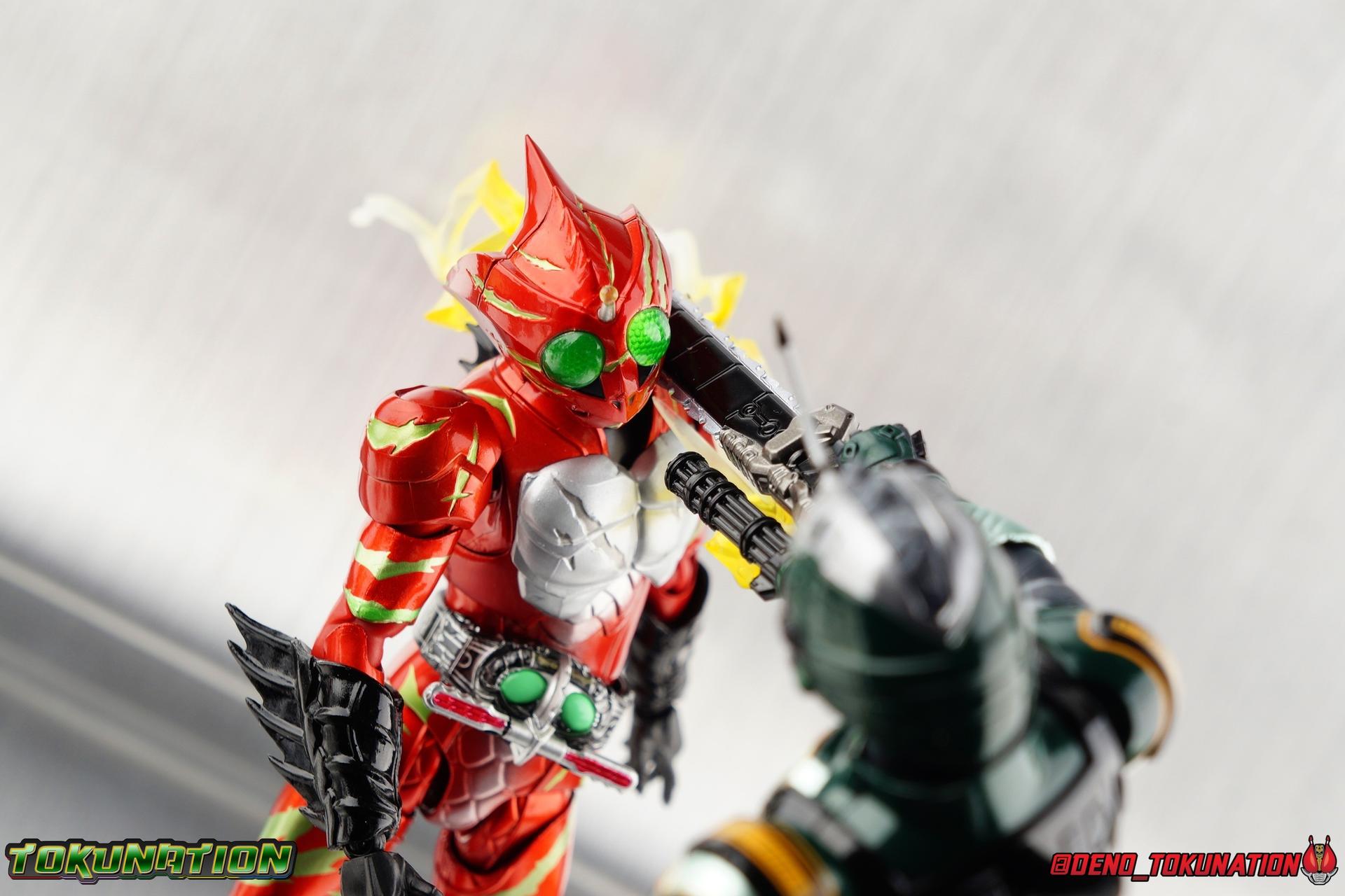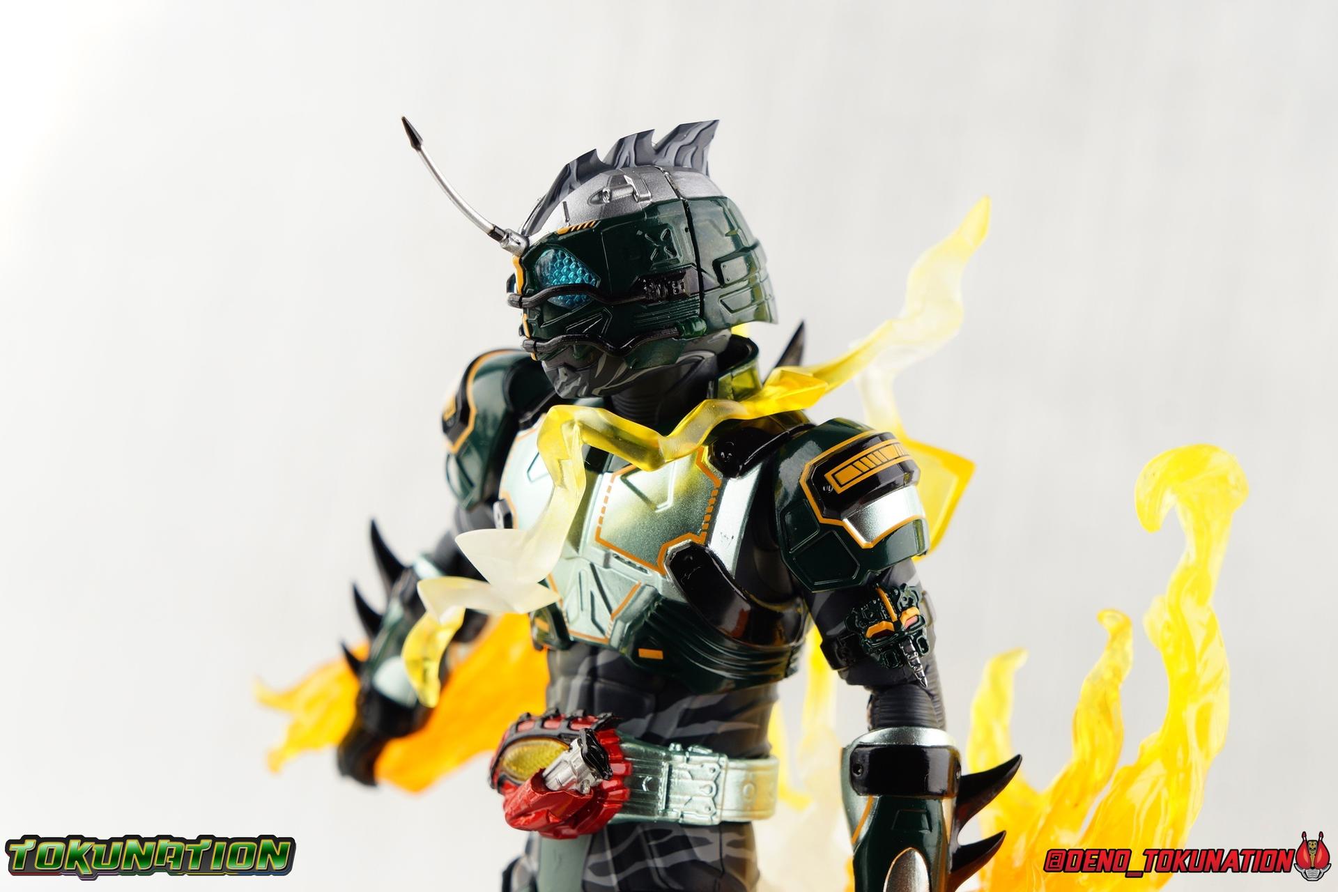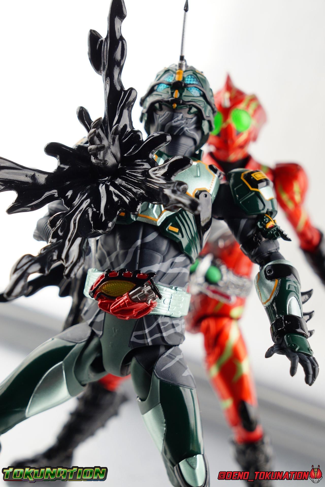 ** Spoilers for Amazons The Last Judgement abound in this review. Read at your own risk! Two years on from Neo's death, Omega is hunted. Haruka and Mizuki have barely escaped 4C when they cross paths with an unusual home for children and a man named Midou. Little do they know, this place is merely a buffet, but not for Amazons. For humans. A new terrifying iteration of the Sigma Project has been undertaken, and the discovery of what keeps it going, will shake Haruka to his core. As the hunters become the hunted, the man named Midou proclaims himself Neo Alpha, the one to surpass Jin Takayama and the original madness of the Amazon Cells. Packaging Just as the Amazons that preceded him, Neo Alpha comes in a pretty dark box with some great stock photos. Alpha's color scheme is pretty dark as well however so everything tends to blend together a lot unfortunately. As with regular Alpha, the name is spelled as "Alfa" on the box. In Jin/Alpha's case the name Alpha is relative to Haruka's Omega. Midou sees himself as the better version of Jin, hence his self naming as Neo Alpha. Regardless, it should be "Alpha" not "Alfa". It's just a bad romanization. Main Figure The end is nigh for the creatures known as Amazons. And sadly, it would seem the same can be said for their figuarts as well. As of the writing of this review, no further Amazons figures have been confirmed for release. In fact the only displayed prototypes seen since the dual reveal of Crow Amazon & Neo Alpha, were the Last Judgement Ver. Alpha & Omega. Neither of which have been seen for some time. So it's fitting that Neo Alpha ends the line as it currently stands, especially considering his well, violent, death. You're probably familiar with this figure already, that is if you own Amazon Neo. Neo was absolutely one of my favorite release in the Amazons line. It was a really great mold that changed things up from previous releases, and it helped that the design deviated to a more armored & cybernetic look. I also enjoyed how elements of the design were borrowed for New Omega. Neo Alpha takes the Neo mold and really militarizes the design. Which in the context of the film's story, makes so much sense when you think about the job Midou is tasked with. In the same way that Neo was decked out in some gorgeous metallic blue and brushed silver, a color scheme that really sold me on the figure, Neo Alpha sells me so hard with the finer details of the paint scheme. Using quite a few more paint applications than usual, Neo Alpha features 4 distinct shades of green both metallic and glossy. There's some bright yellow pin-striping that really offsets the varying greens and glossy blacks nicely as well. The best details however are the alternating gray camo stripes that cover the abdomen hips and arms. These bits are patterned the same way as Neo's red and blue, but the subtlety of the grays really works well with the various greens and yellows of the suit. The various Alpha & Omega releases, and to a lesser extent Sigma as well as Mole & Crow all had faults that irked me. But the Neo mold was a real winner to me. Unlike the others, most of the articulation is solidly intact with this design. Despite the bulk of the armor carried over to Neo Alpha, the figure is very free to move. The ankles are unobstructed so you can get nice solid balance from them. Their forward motion is limited only by the bottom of the shin armor, but not terribly so. The knees are really perfect. Unlike with Omega where the leg fins limited the legs to 90 degree angles, Neo Alpha is free to move because the shin armor can rotate the fins away from the back of the leg. I'm still not super in love with the drop down hips the two Neo's feature, but they aren't a huge detractor in their cases. Now this is a really odd thing for this figure, but more so the character in the film. Neo Alpha has the Neo Amazons Driver attached to his belt, with an Ampule molded into it just like New Omega & Neo. However, in The Last Judgement, Midou only uses his unique Amazons Register attached to the left arm to transform. In much the same way that Iyu/Crow did. Only using the driver to summon his weapon arm. I can only assume a Driver was incorporated into his design simply as a way to set him apart from standard Amazons and make him a rider like the other 4, and I can get that. But he's already a remold of the Neo suit in both mediums, so the Driver was unnecessary to communicate his rider-ness. It's just weird. The upper body is engineered in such a way that it allows you to arch the back up and lean him forward for really savage and animal like poses, though it does expose a gap on his back side when done. The arms are free of most obstruction thanks to some great shoulder pad design, swivel biceps, and rotating forearm guards. My only real gripe with the arms is that the fist pegs are a little tight, and the hands a little difficult to exchange, mostly on the left arm which features the unique Militant Amazons Register. Amazon Neo Alpha does however deviate from the original Neo in one big way, the head. Taking inspiration for this design from a monitor lizard, Neo Alpha has a much more elongated and pronounced head than his predecessor. The new sort of bucket style head features really pretty blue compound eyes, a first for Amazons, and also has some admittedly oddly placed face guards that seem to emulate a football helmet a bit. The most striking piece of the helmet is the very elongated and fragile horn. The figure is packaged sideways in box because of it. So just be careful. As you can see I've assembled all of the Amazons together in this gallery for a big family photo and some comparisons. There's a shot in there as well where you'll notice a silver Amazon Neo as well. Don't let me deceive you, that's not an official figure. It's a custom Amazon Neo Sigma that was made by @Gigabeetle and made it's way to me. I just wanted to give him a brief little spotlight because Neo Sigma is