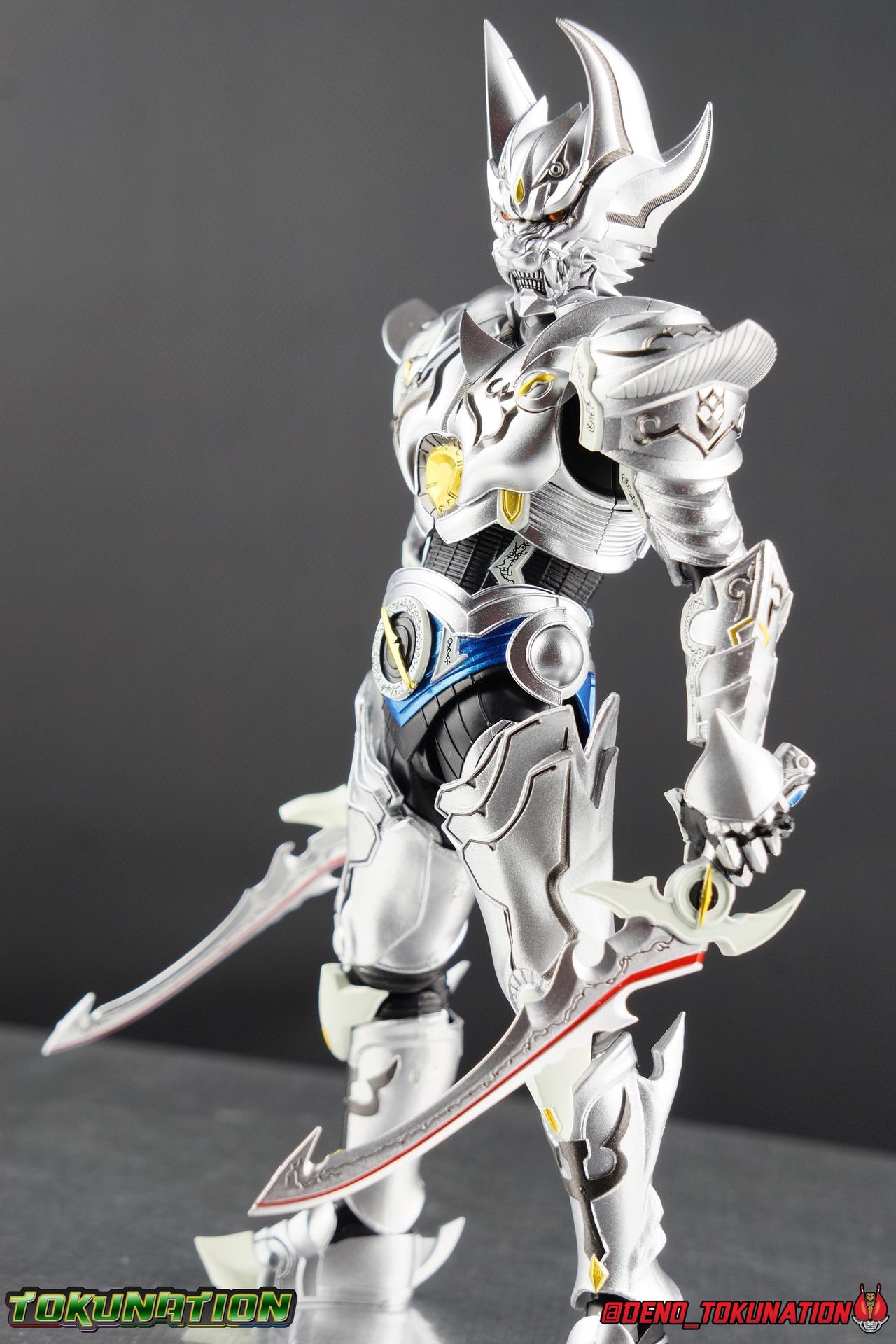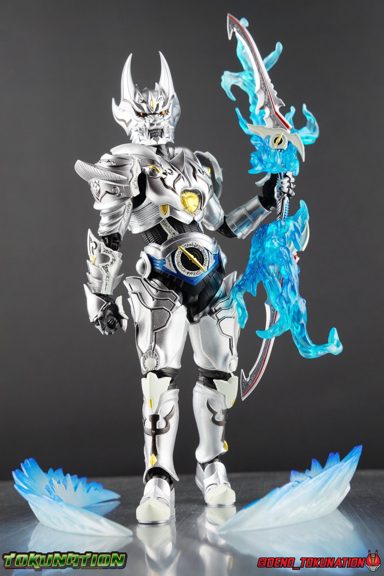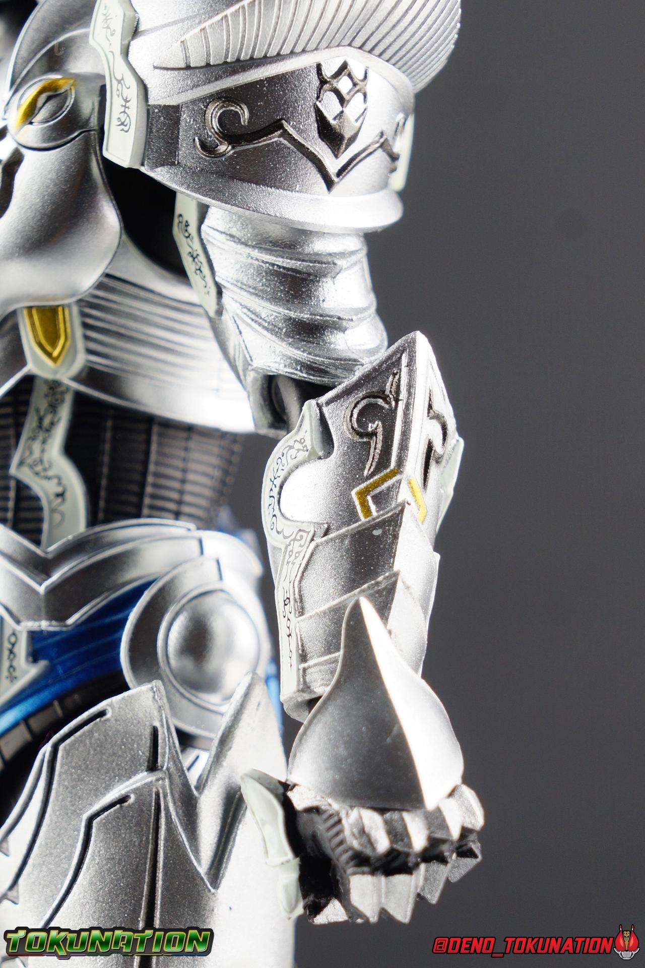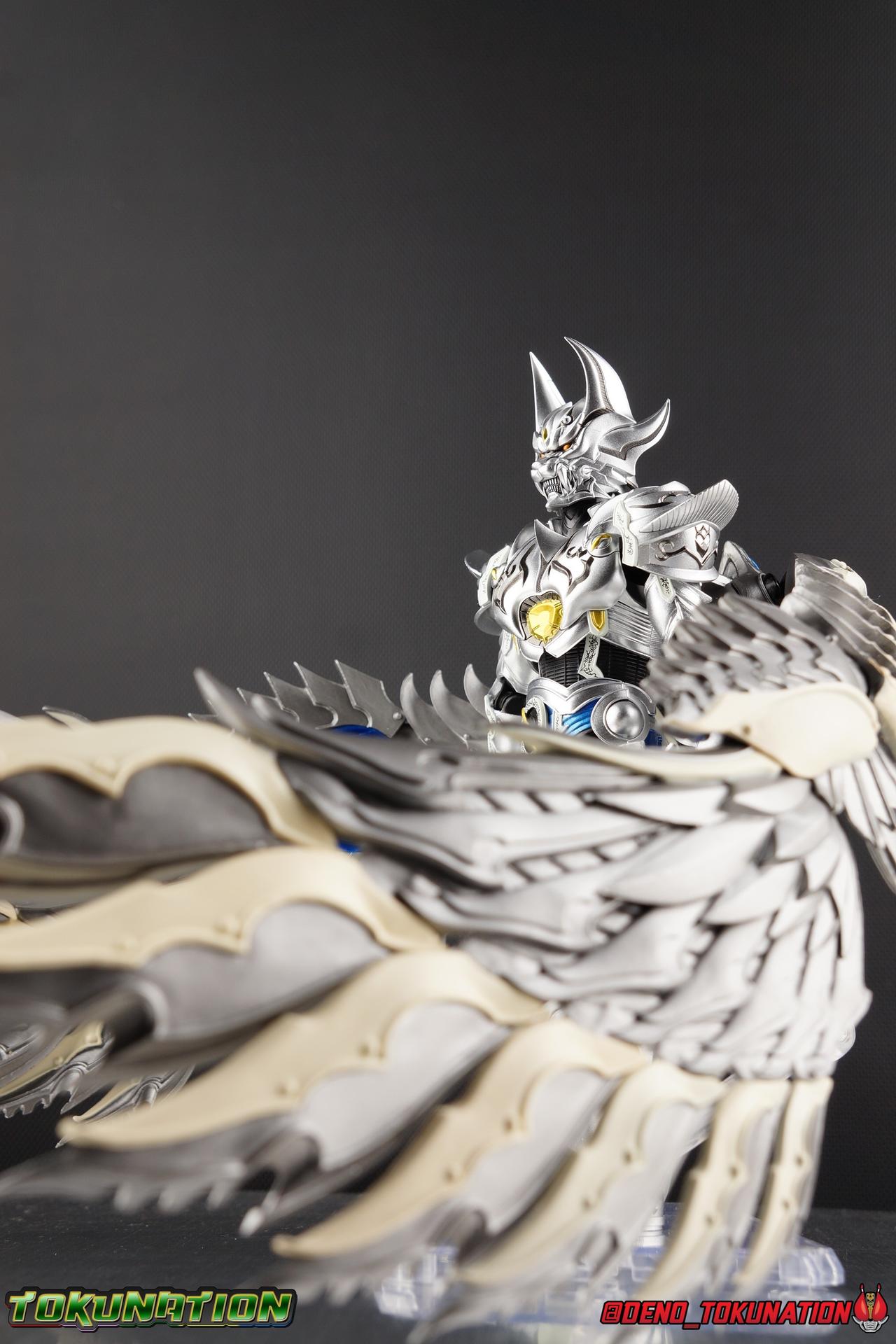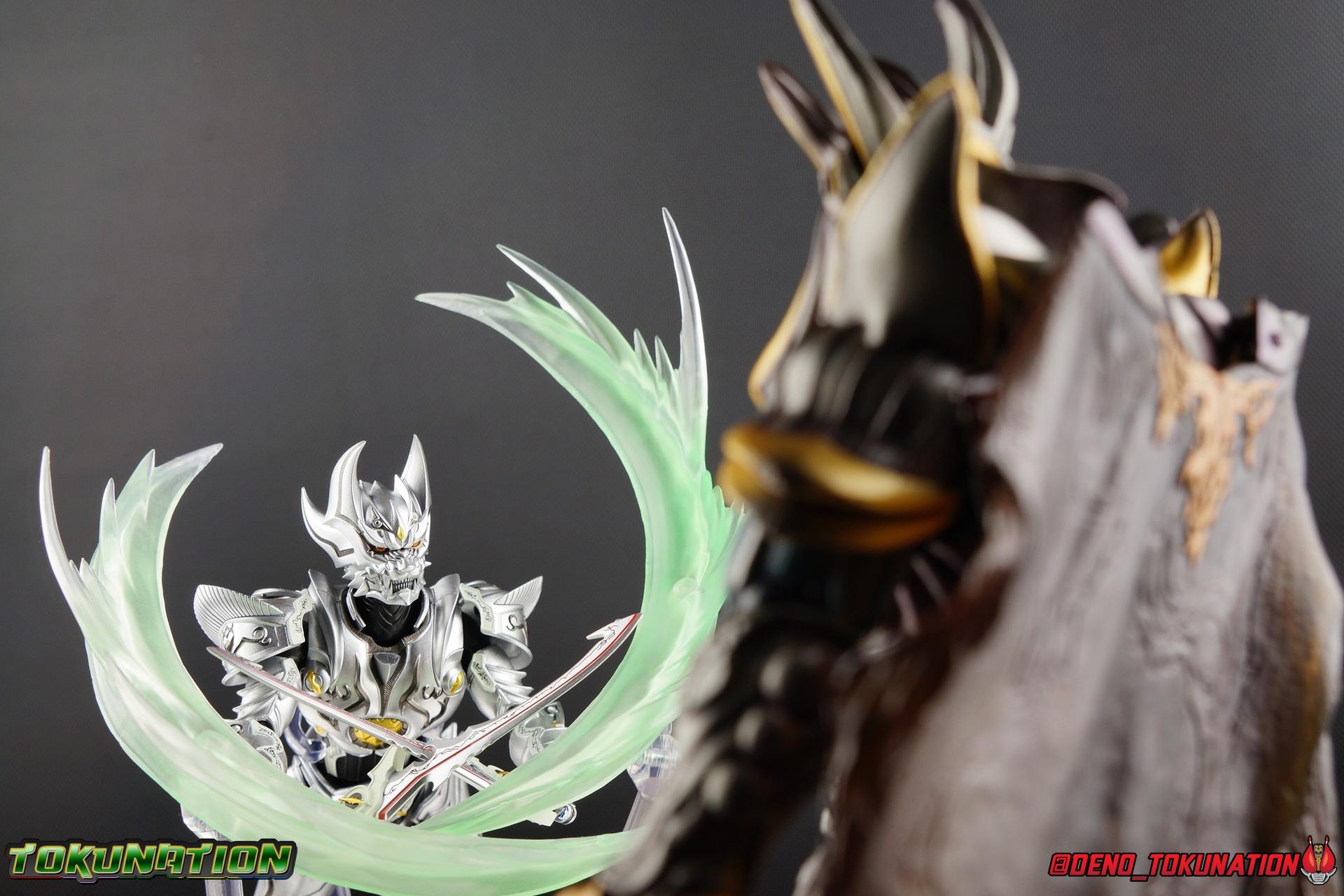 Once an orphaned child, Ginga Suzumura was taken in by the previous Zero user, and raised in a life of luxury. Ginga lived a happy life until the Dark Knight, Kiba, interceded and took the two most important people in the world away from him. The rage and pain at this loss gave Ginga, now going by the name Rei, the determination needed to master the Zero armor, become a Makai Knight, and begin his mission to hunt Horrors, as well as seek revenge for his loved ones. Mistaking Garo for the murderous Kiba, the two heroes clashed many times before uniting to defeat the dark knight. After the many tragedies and triumphs of his life, Zero has continues to walk a lonely path.... Packaging The familiar Shinkocchou Seihou slip cover box makes another appearance! Not much can be said about it this time that hasn't been said before. It's gotten a bit stale (to me) over time but it's still a pleasing type of collector's box. This box now features the standard Bandai Spirits blue logo as well as the holofoil Tamashii Nations brand sticker. Main Figure Zero joins fellow Makai Knight, Garo, as so far the only figures in the entirety of the Shinkocchou Seihou line which do not hail from a Kamen Rider series. Once again this really speaks to the immense and lasting popularity of the Garo franchise. The series continues to go strong with new shows movies and merchandise every year. So these two characters joining up with the Shinkocchou Seihou premium S.H. Figuarts line is really indicative of continued demand and growth. As I mentioned in my Garo review, I've never been a massive fan of the franchise personally, but that figure really really floored me. It was just stunning. Honestly that gorgeous chrome paint job went a long way to convincing me of that, but it was an excellent figure in it's own right. Zero doesn't have the same sort of gorgeous (or garish if you like!) paint job, but is just as nicely engineered. And has kept interested to buy any further Knights that Bandai might decided to make for collectors. As with Garo, Zero is imperfect, there are definitely flaws to the figure's design. However, if you've had any experience with either the original Zero S.H. Figuart or any of the various Makai Kado releases of Zero, the Seihou is a huge upgrade. A step in a much better direction. The first Zero figuart missed the mark not only functionally though, but in all of the details as well. Both fine and broad. One thing you'll immediately see with Zero is that it does not share the same chrome shine as Garo. While Zero's armor has often had a nice gloss or shine to it on screen, it's properly meant to be a more brushed silver color as this figure has turned out. Though in many instances Garo's physical suit did't have quite that reflective chrome look either. There's a few inconsistencies with my Zero's paint apps, particularly some splotchy bits on the right hip, but overall it's got a good shine to it that's accented really well by sharp black detailing. Like Garo, this knight's armor is pretty bulky, but not quite as restrictive. The ankles have a pretty good side to side tilt for wide angle poses, what few you can get. More on that later. They do leave a bit to be desired for forward & back movement. Surprisingly the knees provide better than usual movement, being able to bend up closer to the back of the leg than Garo. Where the legs don't stack up, is in the hips. Garo wasn't perfect by any means, but Zero has some more pronounced thigh armor that impacts the waist armor. So forward movement isn't as good, and outward movement is much worse on Zero. Wide stances just aren't going to be his thing unfortunately. You'll really have to rotate the thighs to get much additional movement out of the hips, but this rotation will keep them from moving a lot as well. It's a mixed bag. The upper body however is a vast improvement. Where Garo certainly had some surprising hidden movement in the upper body, he's got nothing on Zero. Thanks to a relatively slim abdominal section Zero can rotate completely sideways. This free range on the lower section leaves the chest portion open to move as needed in all directions. You can hit some pretty sweet and expressive poses with the upper body, but the lack of corresponding movement in the lower body means it's not as easy to make him look dynamic. The upper body's exquisite detailing really draws the eye as well. The arms are thankfully engineered much better too. Garo has large protruding shoulder armor, that while movable and collapsible, can keep the arms from a number of poses that require forward and back movement. Zero has no such armor, instead having a more traditional shoulder pad-over joint design, thus freeing things up like normal. My only real gripe with the arms is the pointy little blade sticking out on each forearm. They can make exchanging hands difficult, that and the stiffness of the cuff on each fist. These blades are also on the calves and ankles so be careful not to poke yourself too hard or break one. The arms work well enough thanks to the shoulder design, but the elbows only being able to strike a 90 degree angle can be a detriment in some cases. Like Garo, Zero has a just stunning head. The Zero armor has no pupils, and features some great black detailing on top of those sharp silver details, definitely giving him are far more intense and dangerous look. It's a more savage face that seems to contain less humanity than Garo's. Which honestly feeds back into Rei's tragic backstory that took the joy out of his life. The full package so to speak is that of a really solid and fierce looking figure that goes very well with his fellow Makai Knight. Please note that the Kiba briefly used in this gallery is the old Makai Kado one and does not scale with these figures very well. The Zero Wings seen near the end of the gallery also came with Makai Kado Zero and don't physically attach to this figure. But they look damn good don't they? Accessories Zer