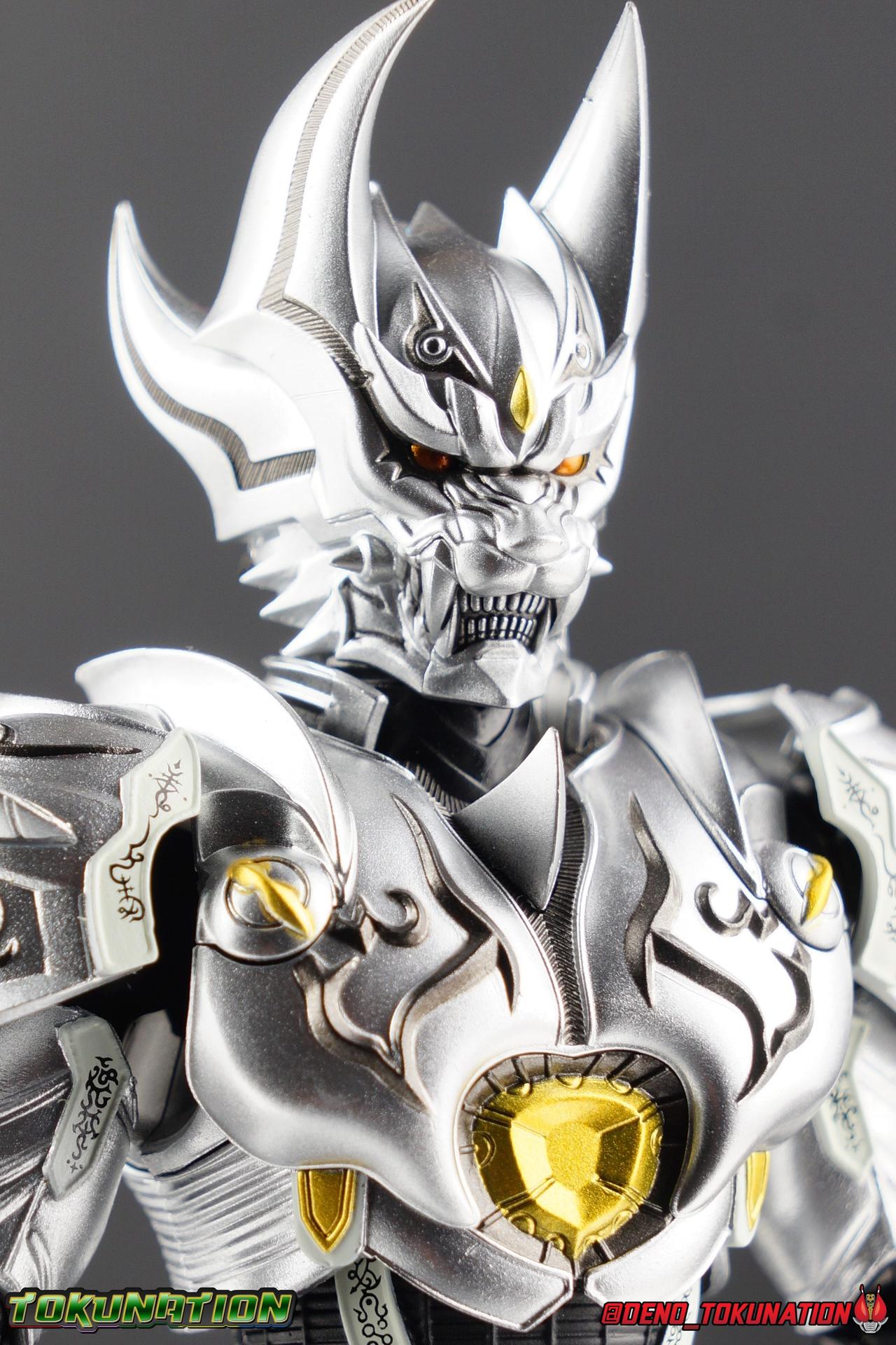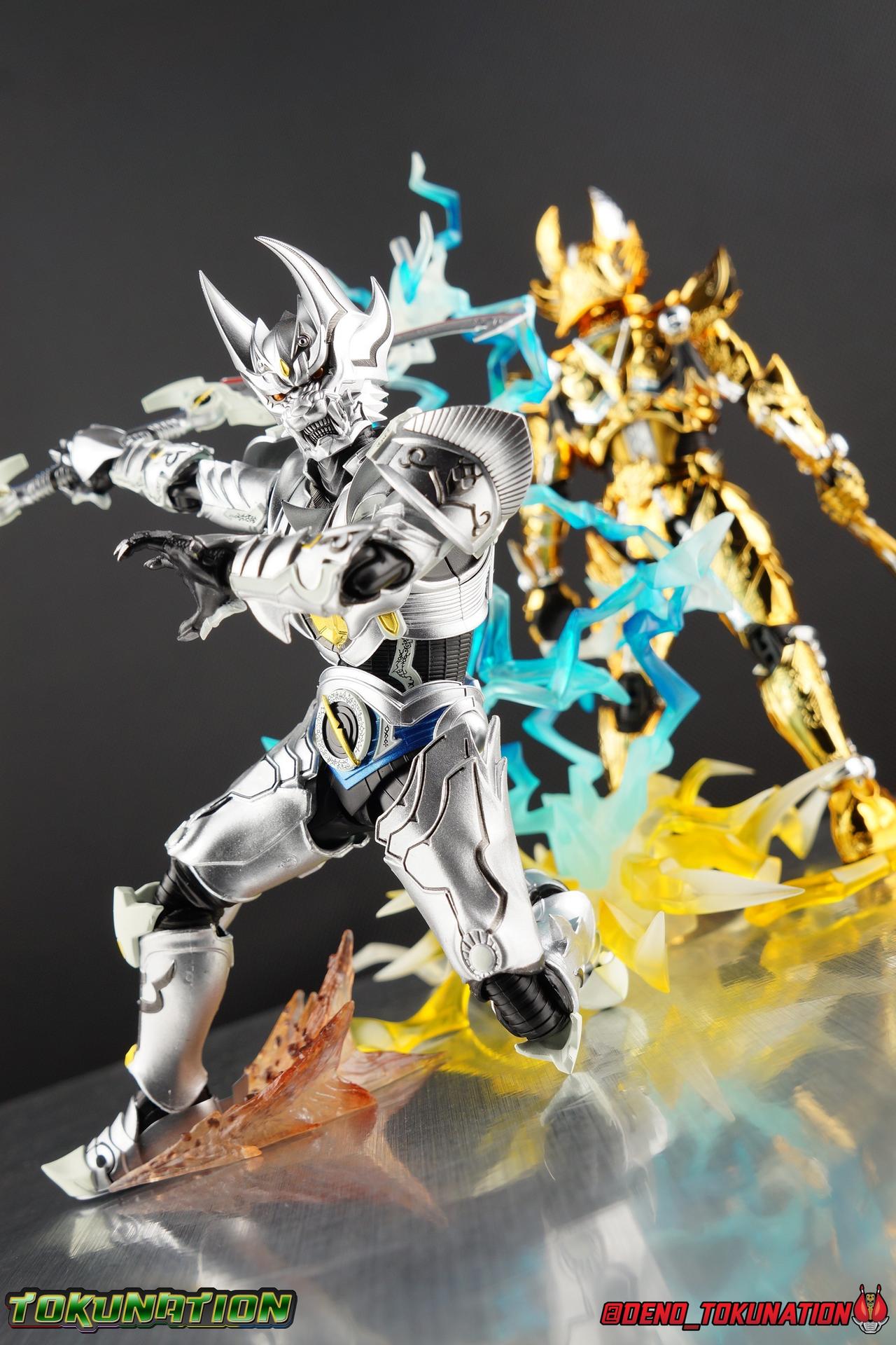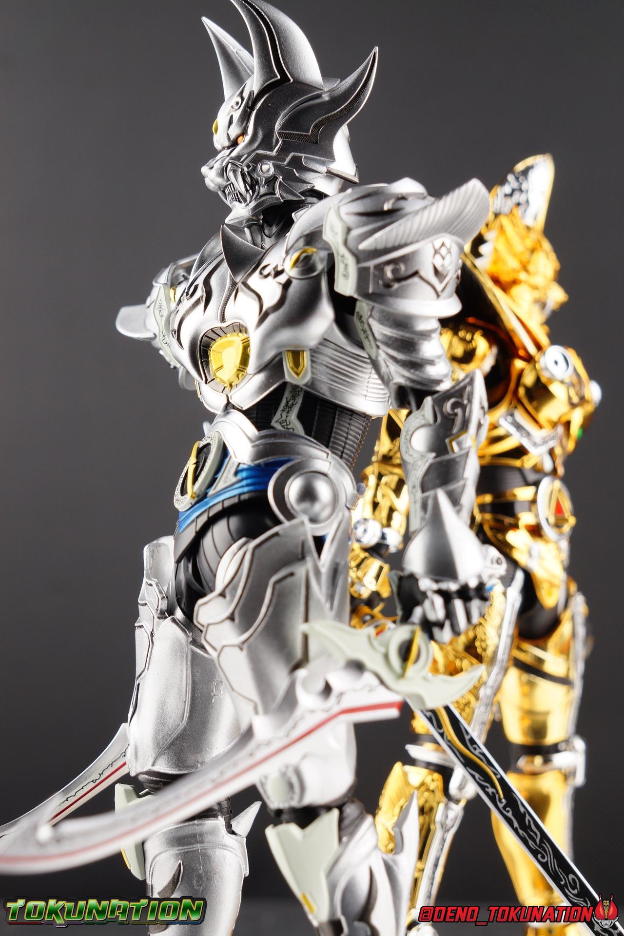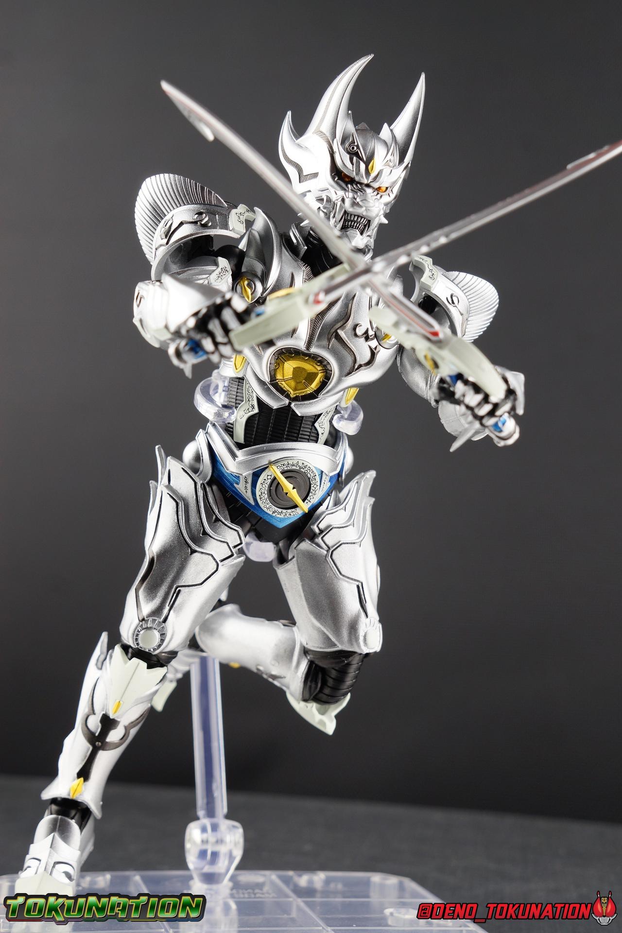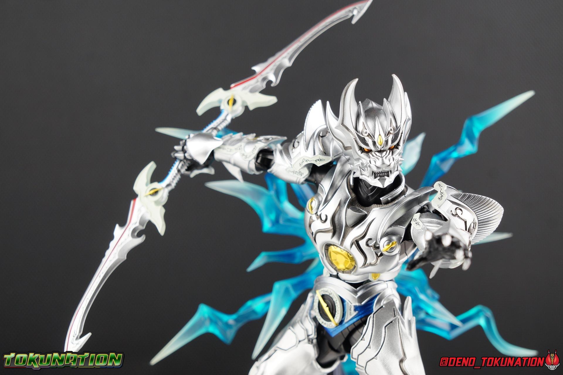 Once an orphaned child, Ginga Suzumura was taken in by the previous Zero user, and raised in a life of luxury. Ginga lived a happy life until the Dark Knight, Kiba, interceded and took the two most important people in the world away from him. The rage and pain at this loss gave Ginga, now going by the name Rei, the determination needed to master the Zero armor, become a Makai Knight, and begin his mission to hunt Horrors, as well as seek revenge for his loved ones. Mistaking Garo for the murderous Kiba, the two heroes clashed many times before uniting to defeat the dark knight. After the many tragedies and triumphs of his life, Zero has continues to walk a lonely path.... Packaging The familiar Shinkocchou Seihou slip cover box makes another appearance! Not much can be said about it this time that hasn't been said before. It's gotten a bit stale (to me) over time but it's still a pleasing type of collector's box. This box now features the standard Bandai Spirits blue logo as well as the holofoil Tamashii Nations brand sticker. Main Figure Zero joins fellow Makai Knight, Garo, as so far the only figures in the entirety of the Shinkocchou Seihou line which do not hail from a Kamen Rider series. Once again this really speaks to the immense and lasting popularity of the Garo franchise. The series continues to go strong with new shows movies and merchandise every year. So these two characters joining up with the Shinkocchou Seihou premium S.H. Figuarts line is really indicative of continued demand and growth. As I mentioned in my Garo review, I've never been a massive fan of the franchise personally, but that figure really really floored me. It was just stunning. Honestly that gorgeous chrome paint job went a long way to convincing me of that, but it was an excellent figure in it's own right. Zero doesn't have the same sort of gorgeous (or garish if you like!) paint job, but is just as nicely engineered. And has kept interested to buy any further Knights that Bandai might decided to make for collectors. As with Garo, Zero is imperfect, there are definitely flaws to the figure's design. However, if you've had any experience with either the original Zero S.H. Figuart or any of the various Makai Kado releases of Zero, the Seihou is a huge upgrade. A step in a much better direction. The first Zero figuart missed the mark not only functionally though, but in all of the details as well. Both fine and broad. One thing you'll immediately see with Zero is that it does not share the same chrome shine as Garo. While Zero's armor has often had a nice gloss or shine to it on screen, it's properly meant to be a more brushed silver color as this figure has turned out. Though in many instances Garo's physical suit did't have quite that reflective chrome look either. There's a few inconsistencies with my Zero's paint apps, particularly some splotchy bits on the right hip, but overall it's got a good shine to it that's accented really well by sharp black detailing. Like Garo, this knight's armor is pretty bulky, but not quite as restrictive. The ankles have a pretty good side to side tilt for wide angle poses, what few you can get. More on that later. They do leave a bit to be desired for forward & back movement. Surprisingly the knees provide better than usual movement, being able to bend up closer to the back of the leg than Garo. Where the legs don't stack up, is in the hips. Garo wasn't perfect by any means, but Zero has some more pronounced thigh armor that impacts the waist armor. So forward movement isn't as good, and outward movement is much worse on Zero. Wide stances just aren't going to be his thing unfortunately. You'll really have to rotate the thighs to get much additional movement out of the hips, but this rotation will keep them from moving a lot as well. It's a mixed bag. The upper body however is a vast improvement. Where Garo certainly had some surprising hidden movement in the upper body, he's got nothing on Zero. Thanks to a relatively slim abdominal section Zero can rotate completely sideways. This free range on the lower section leaves the chest portion open to move as needed in all directions. You can hit some pretty sweet and expressive poses with the upper body, but the lack of corresponding movement in the lower body means it's not as easy to make him look dynamic. The upper body's exquisite detailing really draws the eye as well. The arms are thankfully engineered much better too. Garo has large protruding shoulder armor, that while movable and collapsible, can keep the arms from a number of poses that require forward and back movement. Zero has no such armor, instead having a more traditional shoulder pad-over joint design, thus freeing things up like normal. My only real gripe with the arms is the pointy little blade sticking out on each forearm. They can make exchanging hands difficult, that and the stiffness of the cuff on each fist. These blades are also on the calves and ankles so be careful not to poke yourself too hard or break one. The arms work well enough thanks to the shoulder design, but the elbows only being able to strike a 90 degree angle can be a detriment in some cases. Like Garo, Zero has a just stunning head. The Zero armor has no pupils, and features some great black detailing on top of those sharp silver details, definitely giving him are far more intense and dangerous look. It's a more savage face that seems to contain less humanity than Garo's. Which honestly feeds back into Rei's tragic backstory that took the joy out of his life. The full package so to speak is that of a really solid and fierce looking figure that goes very well with his fellow Makai Knight. Please note that the Kiba briefly used in this gallery is the old Makai Kado one and does not scale with these figures very well. The Zero Wings seen near the end of the gallery also came with Makai Kado Zero and don't physically attach to this figure. But they look damn good don't they? Accessories Zer