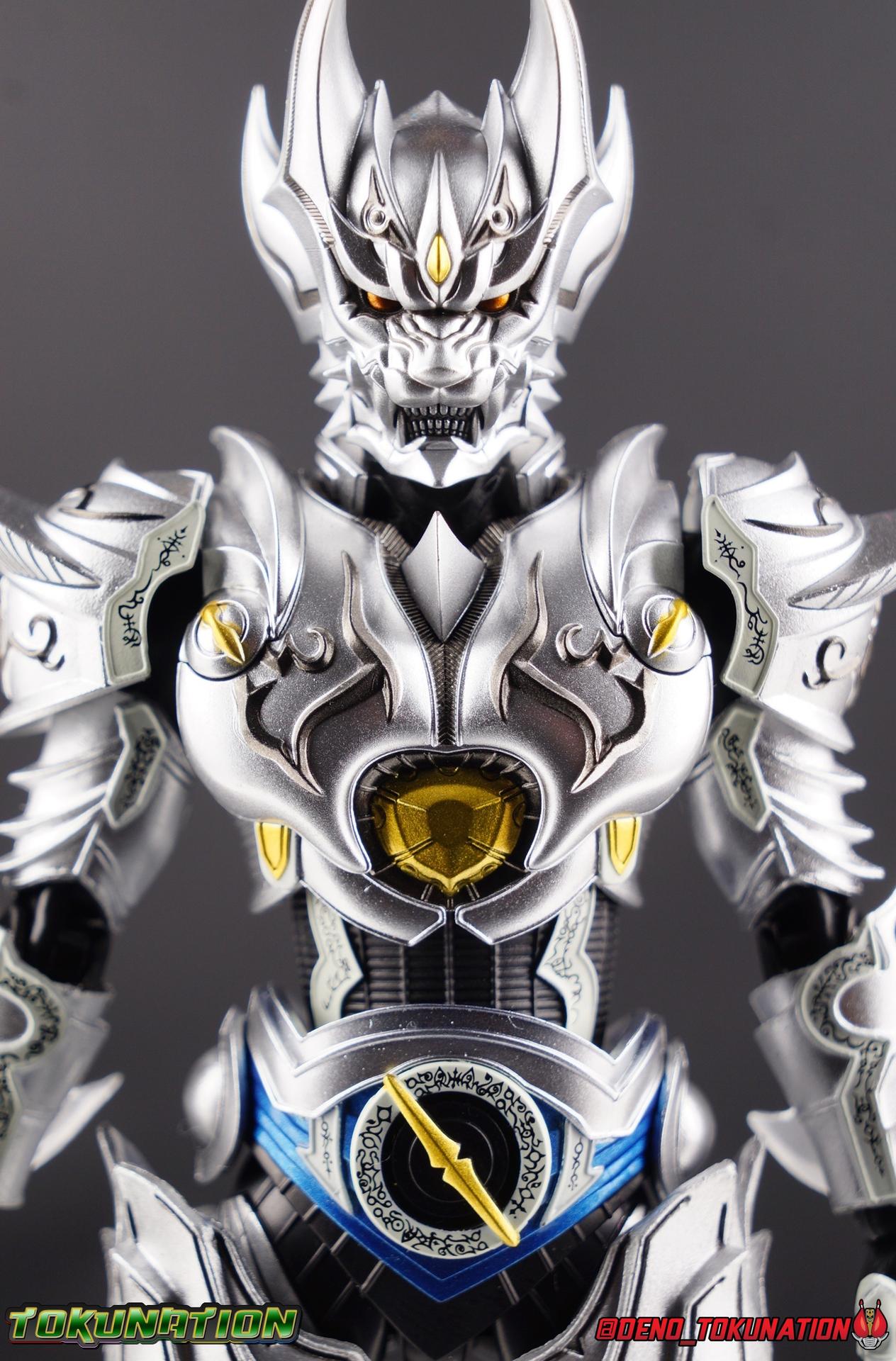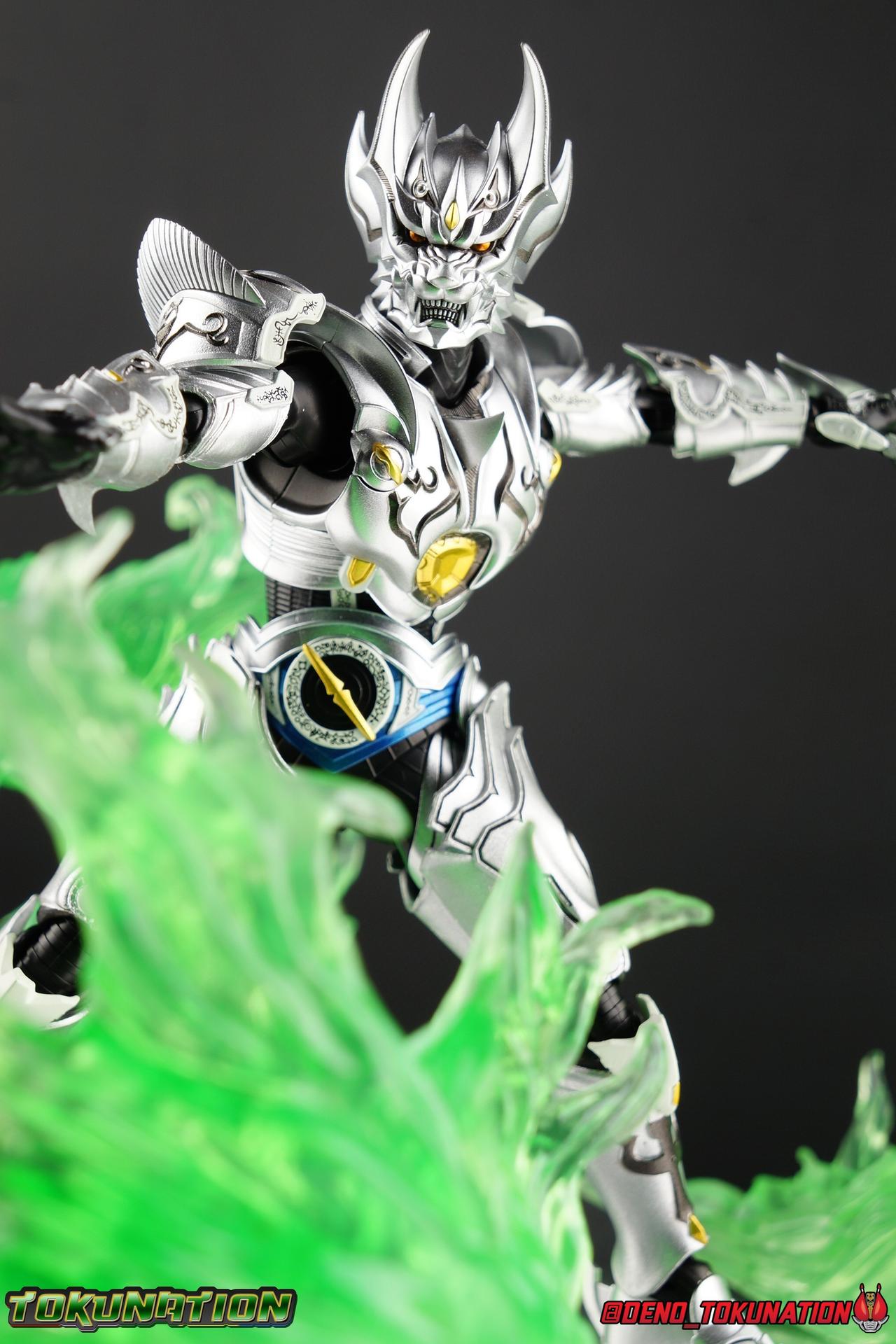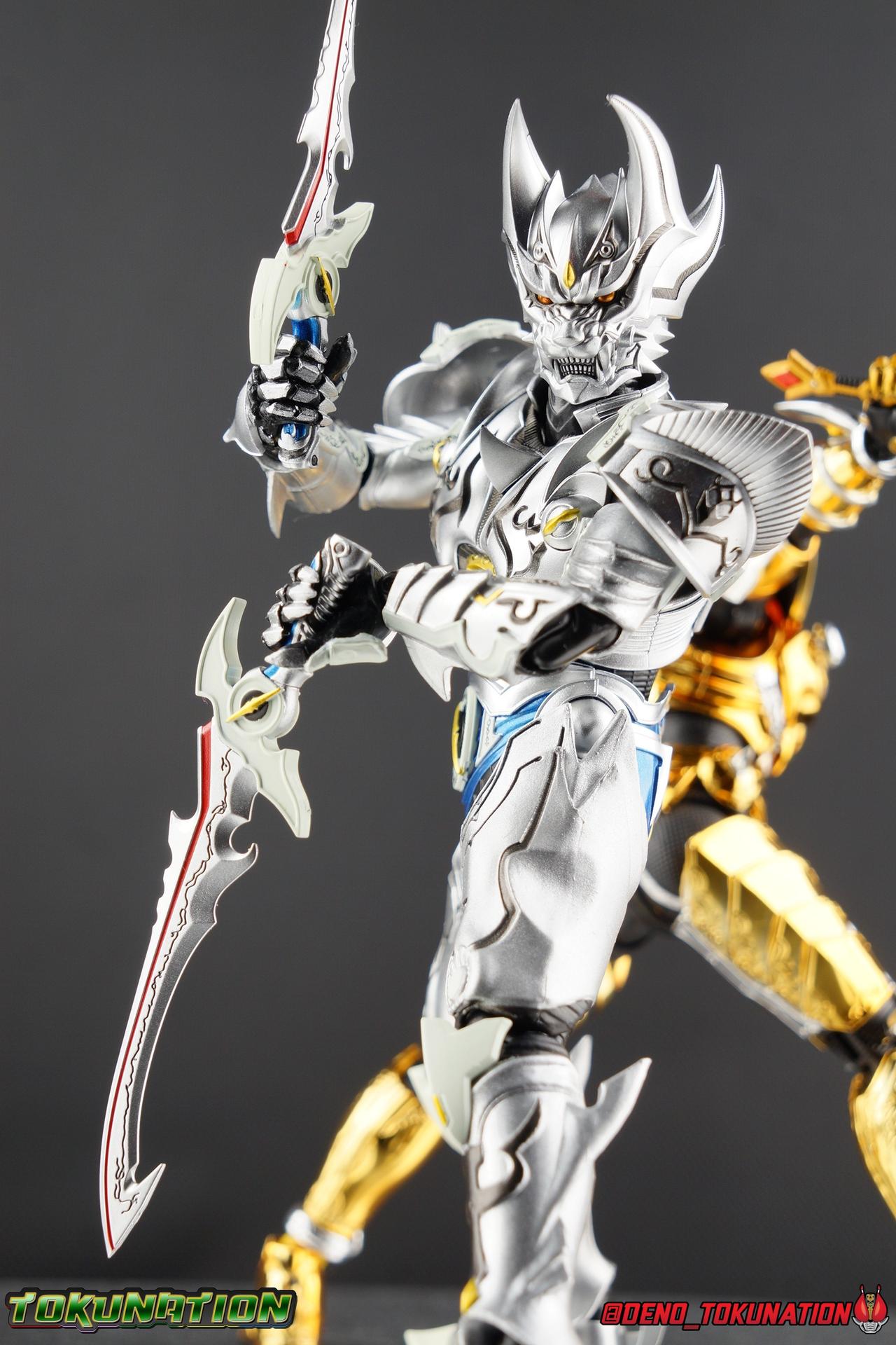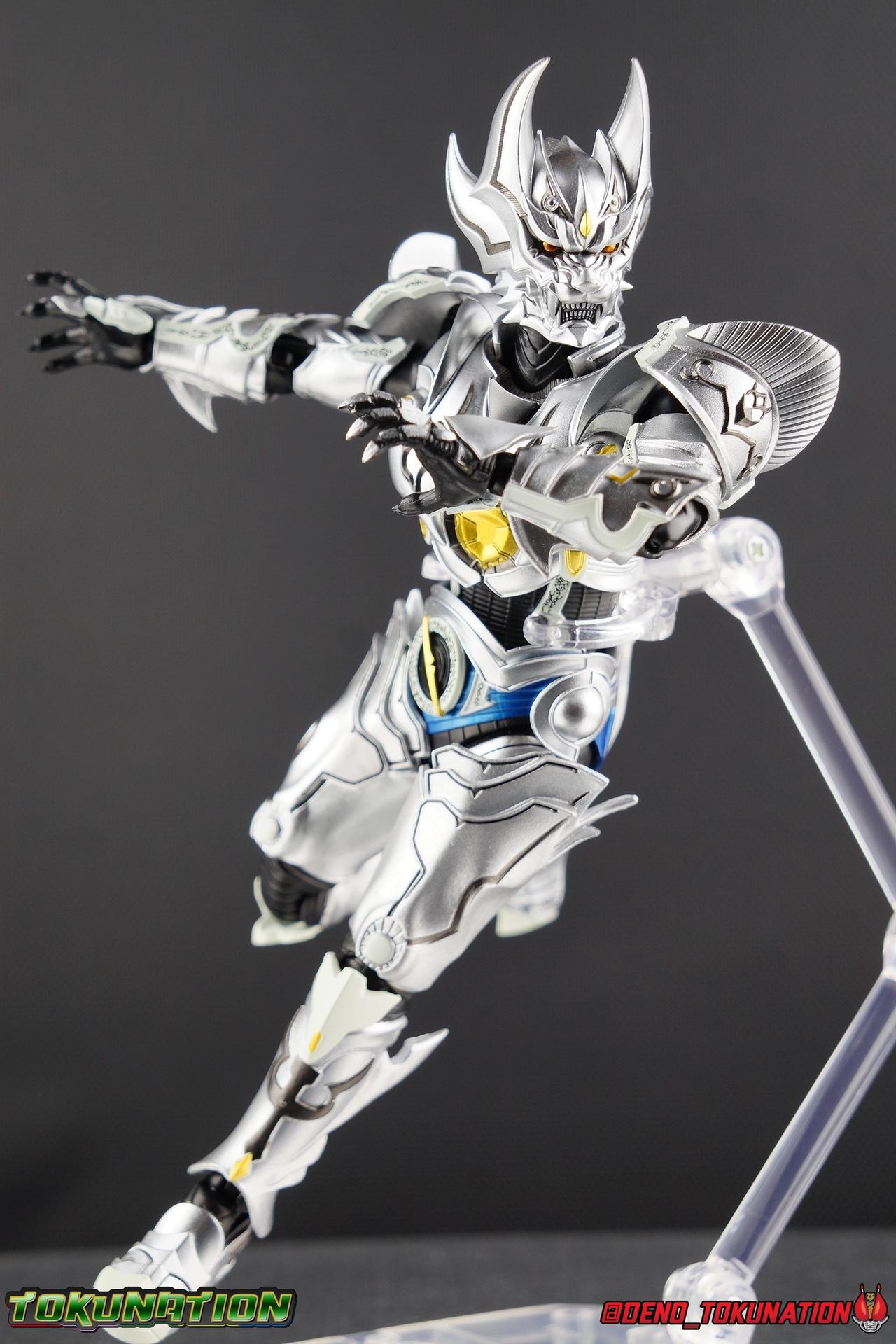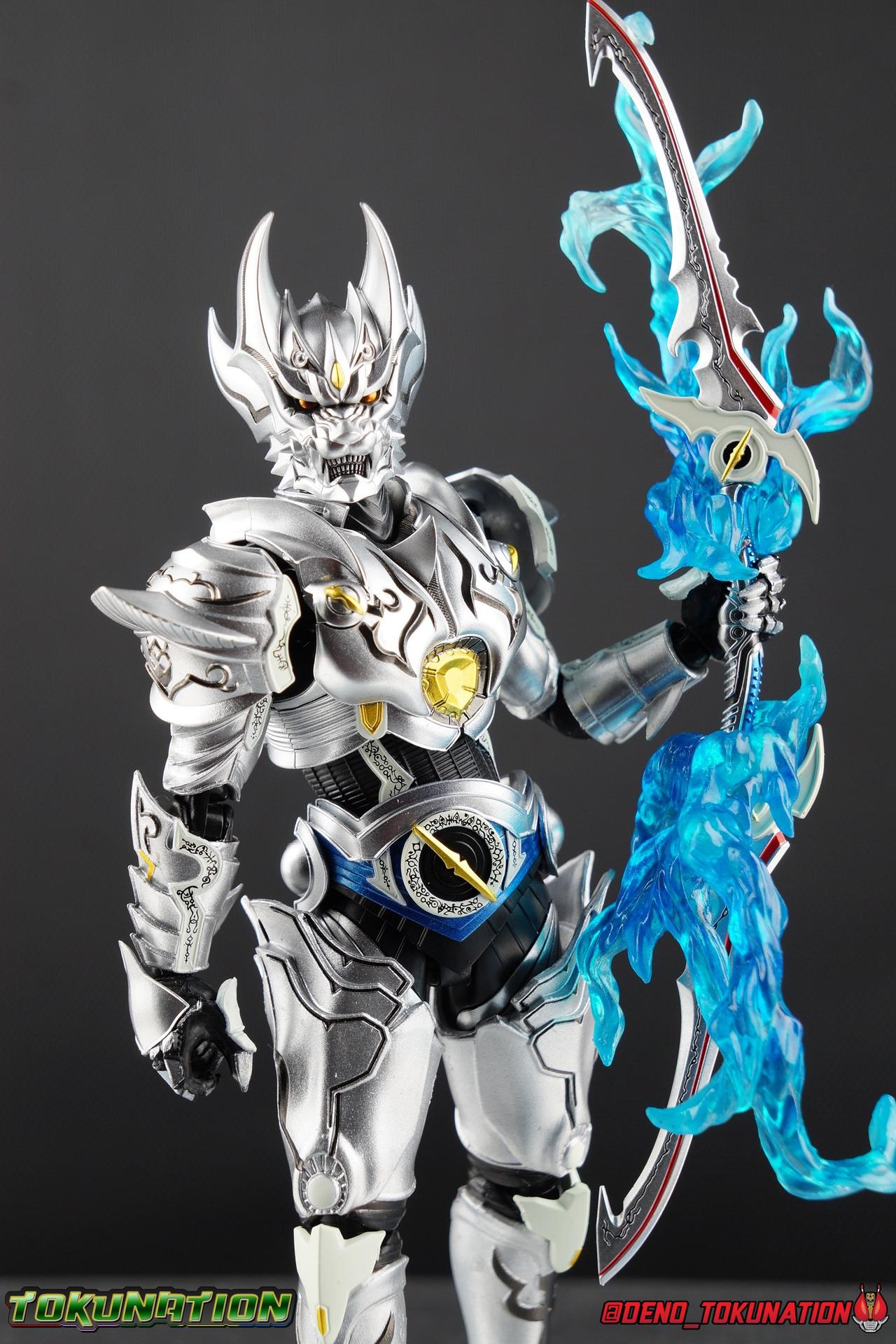 Once an orphaned child, Ginga Suzumura was taken in by the previous Zero user, and raised in a life of luxury. Ginga lived a happy life until the Dark Knight, Kiba, interceded and took the two most important people in the world away from him. The rage and pain at this loss gave Ginga, now going by the name Rei, the determination needed to master the Zero armor, become a Makai Knight, and begin his mission to hunt Horrors, as well as seek revenge for his loved ones. Mistaking Garo for the murderous Kiba, the two heroes clashed many times before uniting to defeat the dark knight. After the many tragedies and triumphs of his life, Zero has continues to walk a lonely path.... Packaging The familiar Shinkocchou Seihou slip cover box makes another appearance! Not much can be said about it this time that hasn't been said before. It's gotten a bit stale (to me) over time but it's still a pleasing type of collector's box. This box now features the standard Bandai Spirits blue logo as well as the holofoil Tamashii Nations brand sticker. Main Figure Zero joins fellow Makai Knight, Garo, as so far the only figures in the entirety of the Shinkocchou Seihou line which do not hail from a Kamen Rider series. Once again this really speaks to the immense and lasting popularity of the Garo franchise. The series continues to go strong with new shows movies and merchandise every year. So these two characters joining up with the Shinkocchou Seihou premium S.H. Figuarts line is really indicative of continued demand and growth. As I mentioned in my Garo review, I've never been a massive fan of the franchise personally, but that figure really really floored me. It was just stunning. Honestly that gorgeous chrome paint job went a long way to convincing me of that, but it was an excellent figure in it's own right. Zero doesn't have the same sort of gorgeous (or garish if you like!) paint job, but is just as nicely engineered. And has kept interested to buy any further Knights that Bandai might decided to make for collectors. As with Garo, Zero is imperfect, there are definitely flaws to the figure's design. However, if you've had any experience with either the original Zero S.H. Figuart or any of the various Makai Kado releases of Zero, the Seihou is a huge upgrade. A step in a much better direction. The first Zero figuart missed the mark not only functionally though, but in all of the details as well. Both fine and broad. One thing you'll immediately see with Zero is that it does not share the same chrome shine as Garo. While Zero's armor has often had a nice gloss or shine to it on screen, it's properly meant to be a more brushed silver color as this figure has turned out. Though in many instances Garo's physical suit did't have quite that reflective chrome look either. There's a few inconsistencies with my Zero's paint apps, particularly some splotchy bits on the right hip, but overall it's got a good shine to it that's accented really well by sharp black detailing. Like Garo, this knight's armor is pretty bulky, but not quite as restrictive. The ankles have a pretty good side to side tilt for wide angle poses, what few you can get. More on that later. They do leave a bit to be desired for forward & back movement. Surprisingly the knees provide better than usual movement, being able to bend up closer to the back of the leg than Garo. Where the legs don't stack up, is in the hips. Garo wasn't perfect by any means, but Zero has some more pronounced thigh armor that impacts the waist armor. So forward movement isn't as good, and outward movement is much worse on Zero. Wide stances just aren't going to be his thing unfortunately. You'll really have to rotate the thighs to get much additional movement out of the hips, but this rotation will keep them from moving a lot as well. It's a mixed bag. The upper body however is a vast improvement. Where Garo certainly had some surprising hidden movement in the upper body, he's got nothing on Zero. Thanks to a relatively slim abdominal section Zero can rotate completely sideways. This free range on the lower section leaves the chest portion open to move as needed in all directions. You can hit some pretty sweet and expressive poses with the upper body, but the lack of corresponding movement in the lower body means it's not as easy to make him look dynamic. The upper body's exquisite detailing really draws the eye as well. The arms are thankfully engineered much better too. Garo has large protruding shoulder armor, that while movable and collapsible, can keep the arms from a number of poses that require forward and back movement. Zero has no such armor, instead having a more traditional shoulder pad-over joint design, thus freeing things up like normal. My only real gripe with the arms is the pointy little blade sticking out on each forearm. They can make exchanging hands difficult, that and the stiffness of the cuff on each fist. These blades are also on the calves and ankles so be careful not to poke yourself too hard or break one. The arms work well enough thanks to the shoulder design, but the elbows only being able to strike a 90 degree angle can be a detriment in some cases. Like Garo, Zero has a just stunning head. The Zero armor has no pupils, and features some great black detailing on top of those sharp silver details, definitely giving him are far more intense and dangerous look. It's a more savage face that seems to contain less humanity than Garo's. Which honestly feeds back into Rei's tragic backstory that took the joy out of his life. The full package so to speak is that of a really solid and fierce looking figure that goes very well with his fellow Makai Knight. Please note that the Kiba briefly used in this gallery is the old Makai Kado one and does not scale with these figures very well. The Zero Wings seen near the end of the gallery also came with Makai Kado Zero and don't physically attach to this figure. But they look damn good don't they? Accessories Zer