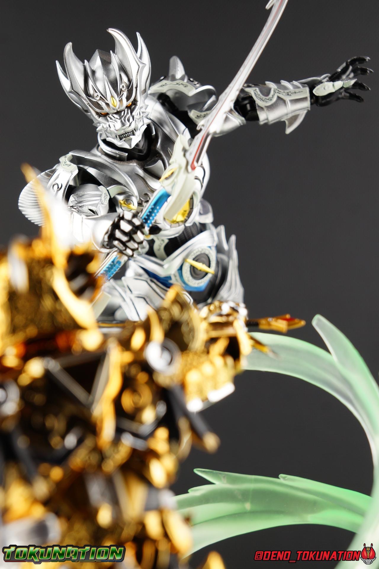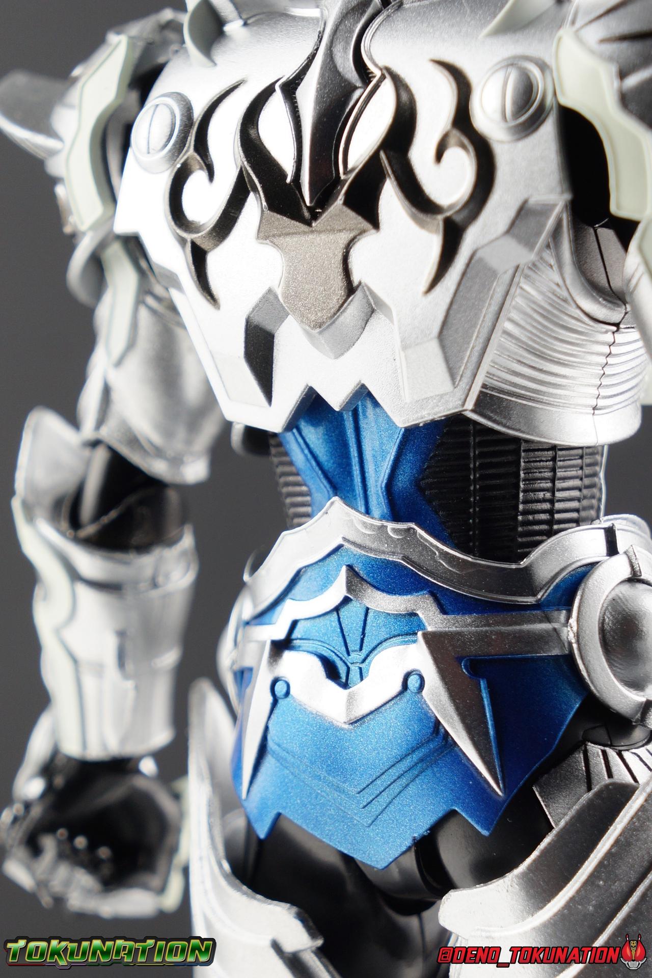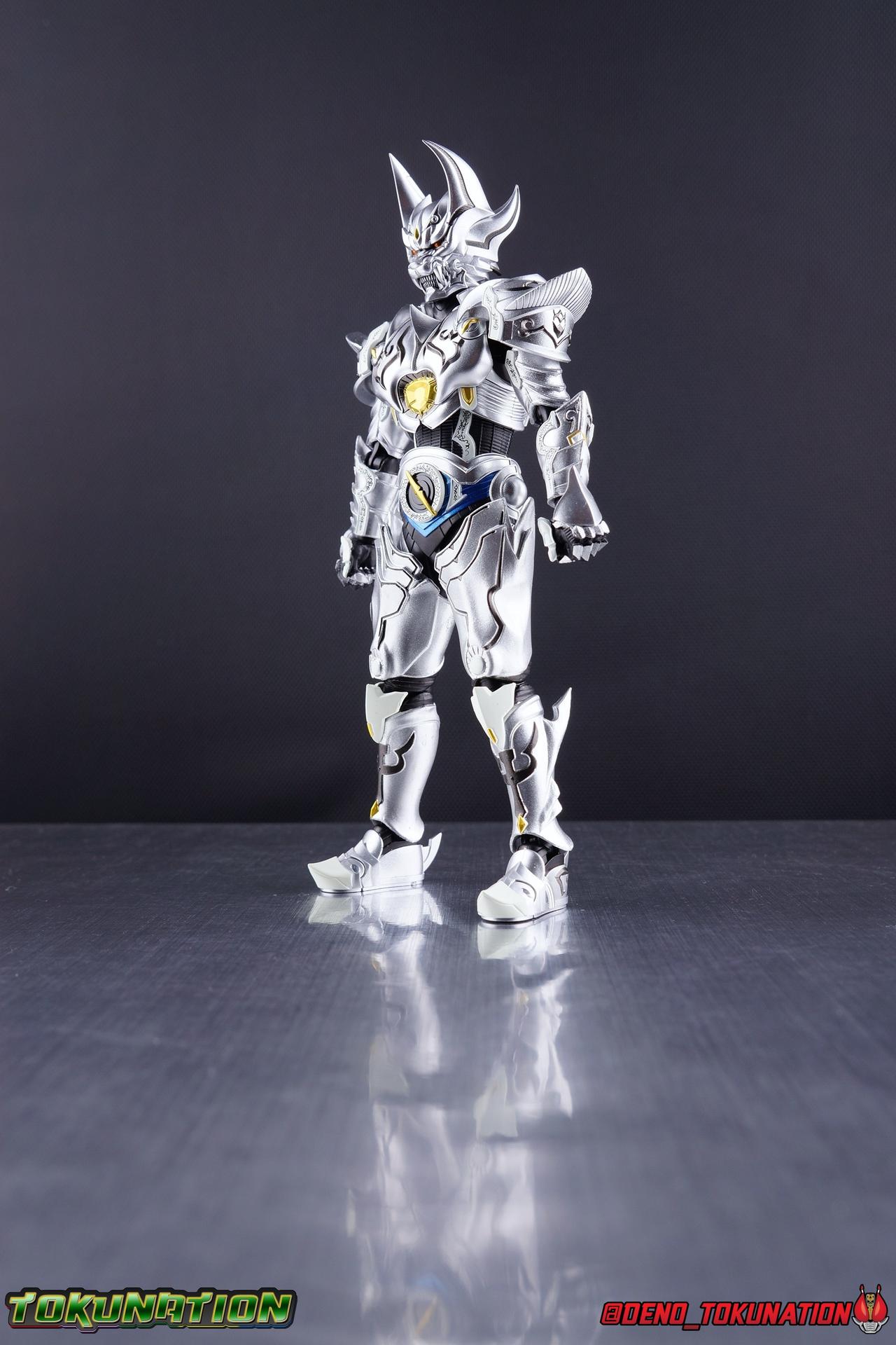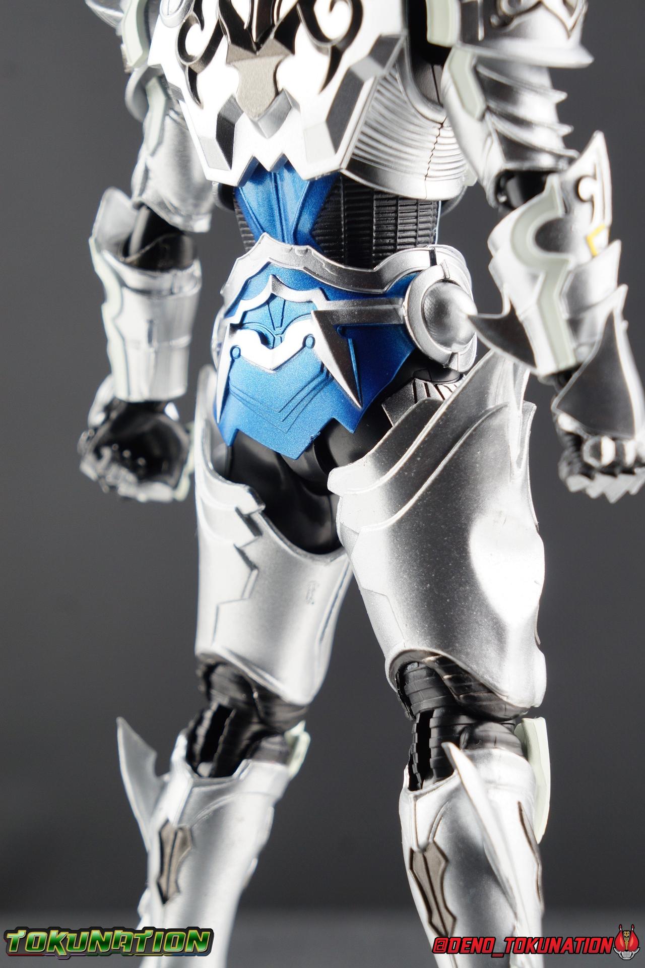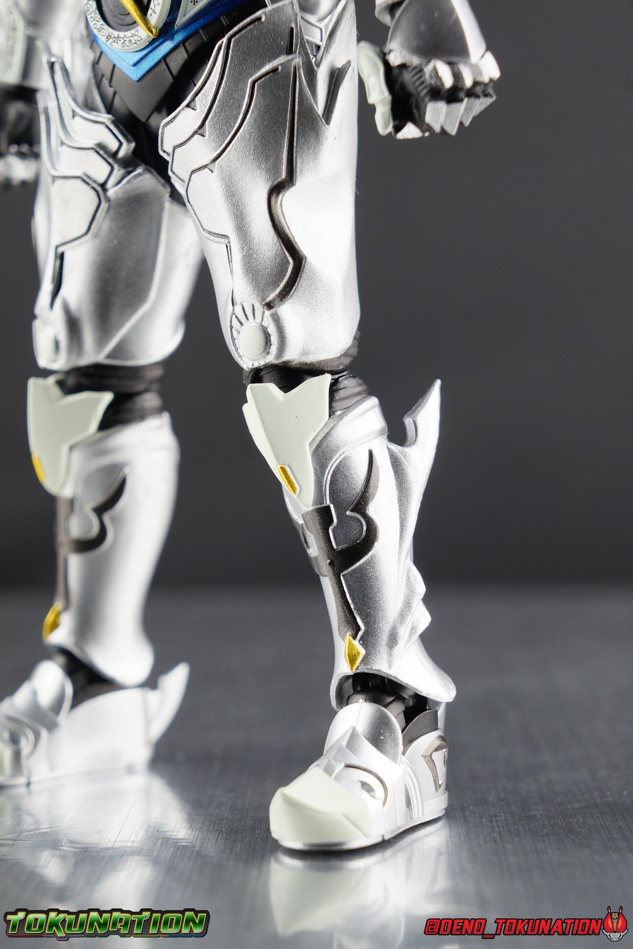 Once an orphaned child, Ginga Suzumura was taken in by the previous Zero user, and raised in a life of luxury. Ginga lived a happy life until the Dark Knight, Kiba, interceded and took the two most important people in the world away from him. The rage and pain at this loss gave Ginga, now going by the name Rei, the determination needed to master the Zero armor, become a Makai Knight, and begin his mission to hunt Horrors, as well as seek revenge for his loved ones. Mistaking Garo for the murderous Kiba, the two heroes clashed many times before uniting to defeat the dark knight. After the many tragedies and triumphs of his life, Zero has continues to walk a lonely path.... Packaging The familiar Shinkocchou Seihou slip cover box makes another appearance! Not much can be said about it this time that hasn't been said before. It's gotten a bit stale (to me) over time but it's still a pleasing type of collector's box. This box now features the standard Bandai Spirits blue logo as well as the holofoil Tamashii Nations brand sticker. Main Figure Zero joins fellow Makai Knight, Garo, as so far the only figures in the entirety of the Shinkocchou Seihou line which do not hail from a Kamen Rider series. Once again this really speaks to the immense and lasting popularity of the Garo franchise. The series continues to go strong with new shows movies and merchandise every year. So these two characters joining up with the Shinkocchou Seihou premium S.H. Figuarts line is really indicative of continued demand and growth. As I mentioned in my Garo review, I've never been a massive fan of the franchise personally, but that figure really really floored me. It was just stunning. Honestly that gorgeous chrome paint job went a long way to convincing me of that, but it was an excellent figure in it's own right. Zero doesn't have the same sort of gorgeous (or garish if you like!) paint job, but is just as nicely engineered. And has kept interested to buy any further Knights that Bandai might decided to make for collectors. As with Garo, Zero is imperfect, there are definitely flaws to the figure's design. However, if you've had any experience with either the original Zero S.H. Figuart or any of the various Makai Kado releases of Zero, the Seihou is a huge upgrade. A step in a much better direction. The first Zero figuart missed the mark not only functionally though, but in all of the details as well. Both fine and broad. One thing you'll immediately see with Zero is that it does not share the same chrome shine as Garo. While Zero's armor has often had a nice gloss or shine to it on screen, it's properly meant to be a more brushed silver color as this figure has turned out. Though in many instances Garo's physical suit did't have quite that reflective chrome look either. There's a few inconsistencies with my Zero's paint apps, particularly some splotchy bits on the right hip, but overall it's got a good shine to it that's accented really well by sharp black detailing. Like Garo, this knight's armor is pretty bulky, but not quite as restrictive. The ankles have a pretty good side to side tilt for wide angle poses, what few you can get. More on that later. They do leave a bit to be desired for forward & back movement. Surprisingly the knees provide better than usual movement, being able to bend up closer to the back of the leg than Garo. Where the legs don't stack up, is in the hips. Garo wasn't perfect by any means, but Zero has some more pronounced thigh armor that impacts the waist armor. So forward movement isn't as good, and outward movement is much worse on Zero. Wide stances just aren't going to be his thing unfortunately. You'll really have to rotate the thighs to get much additional movement out of the hips, but this rotation will keep them from moving a lot as well. It's a mixed bag. The upper body however is a vast improvement. Where Garo certainly had some surprising hidden movement in the upper body, he's got nothing on Zero. Thanks to a relatively slim abdominal section Zero can rotate completely sideways. This free range on the lower section leaves the chest portion open to move as needed in all directions. You can hit some pretty sweet and expressive poses with the upper body, but the lack of corresponding movement in the lower body means it's not as easy to make him look dynamic. The upper body's exquisite detailing really draws the eye as well. The arms are thankfully engineered much better too. Garo has large protruding shoulder armor, that while movable and collapsible, can keep the arms from a number of poses that require forward and back movement. Zero has no such armor, instead having a more traditional shoulder pad-over joint design, thus freeing things up like normal. My only real gripe with the arms is the pointy little blade sticking out on each forearm. They can make exchanging hands difficult, that and the stiffness of the cuff on each fist. These blades are also on the calves and ankles so be careful not to poke yourself too hard or break one. The arms work well enough thanks to the shoulder design, but the elbows only being able to strike a 90 degree angle can be a detriment in some cases. Like Garo, Zero has a just stunning head. The Zero armor has no pupils, and features some great black detailing on top of those sharp silver details, definitely giving him are far more intense and dangerous look. It's a more savage face that seems to contain less humanity than Garo's. Which honestly feeds back into Rei's tragic backstory that took the joy out of his life. The full package so to speak is that of a really solid and fierce looking figure that goes very well with his fellow Makai Knight. Please note that the Kiba briefly used in this gallery is the old Makai Kado one and does not scale with these figures very well. The Zero Wings seen near the end of the gallery also came with Makai Kado Zero and don't physically attach to this figure. But they look damn good don't they? Accessories Zer
