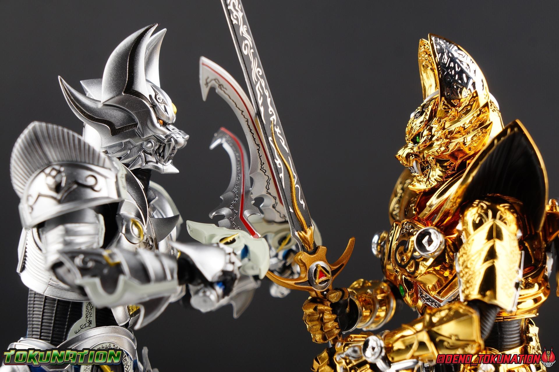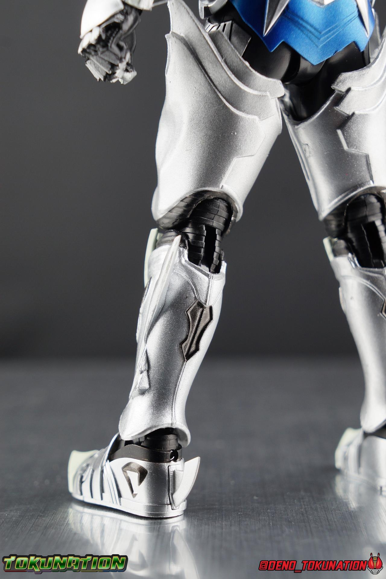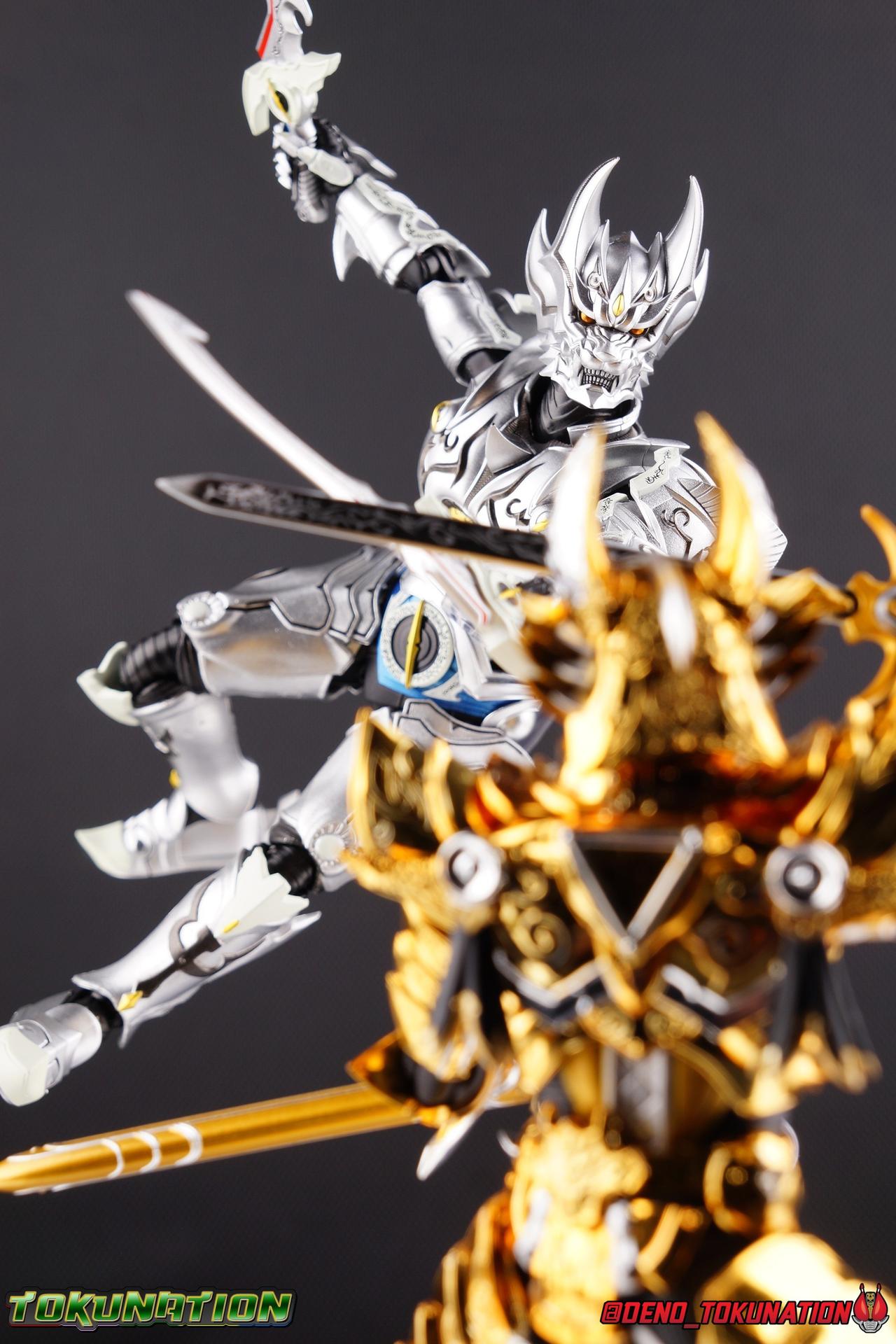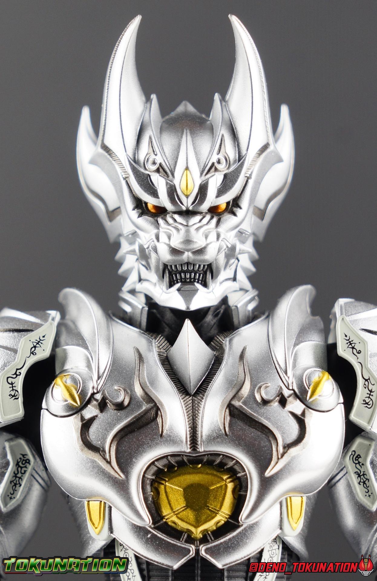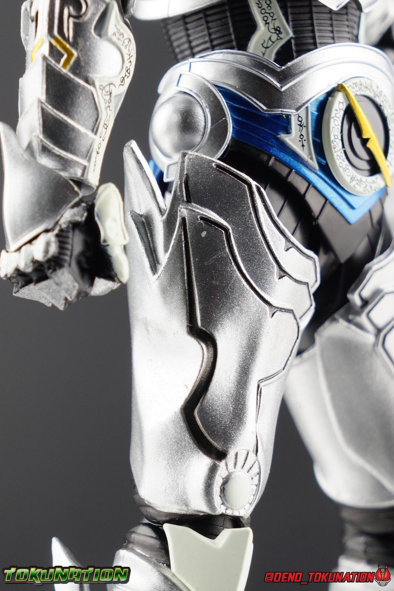 Once an orphaned child, Ginga Suzumura was taken in by the previous Zero user, and raised in a life of luxury. Ginga lived a happy life until the Dark Knight, Kiba, interceded and took the two most important people in the world away from him. The rage and pain at this loss gave Ginga, now going by the name Rei, the determination needed to master the Zero armor, become a Makai Knight, and begin his mission to hunt Horrors, as well as seek revenge for his loved ones. Mistaking Garo for the murderous Kiba, the two heroes clashed many times before uniting to defeat the dark knight. After the many tragedies and triumphs of his life, Zero has continues to walk a lonely path.... Packaging The familiar Shinkocchou Seihou slip cover box makes another appearance! Not much can be said about it this time that hasn't been said before. It's gotten a bit stale (to me) over time but it's still a pleasing type of collector's box. This box now features the standard Bandai Spirits blue logo as well as the holofoil Tamashii Nations brand sticker. Main Figure Zero joins fellow Makai Knight, Garo, as so far the only figures in the entirety of the Shinkocchou Seihou line which do not hail from a Kamen Rider series. Once again this really speaks to the immense and lasting popularity of the Garo franchise. The series continues to go strong with new shows movies and merchandise every year. So these two characters joining up with the Shinkocchou Seihou premium S.H. Figuarts line is really indicative of continued demand and growth. As I mentioned in my Garo review, I've never been a massive fan of the franchise personally, but that figure really really floored me. It was just stunning. Honestly that gorgeous chrome paint job went a long way to convincing me of that, but it was an excellent figure in it's own right. Zero doesn't have the same sort of gorgeous (or garish if you like!) paint job, but is just as nicely engineered. And has kept interested to buy any further Knights that Bandai might decided to make for collectors. As with Garo, Zero is imperfect, there are definitely flaws to the figure's design. However, if you've had any experience with either the original Zero S.H. Figuart or any of the various Makai Kado releases of Zero, the Seihou is a huge upgrade. A step in a much better direction. The first Zero figuart missed the mark not only functionally though, but in all of the details as well. Both fine and broad. One thing you'll immediately see with Zero is that it does not share the same chrome shine as Garo. While Zero's armor has often had a nice gloss or shine to it on screen, it's properly meant to be a more brushed silver color as this figure has turned out. Though in many instances Garo's physical suit did't have quite that reflective chrome look either. There's a few inconsistencies with my Zero's paint apps, particularly some splotchy bits on the right hip, but overall it's got a good shine to it that's accented really well by sharp black detailing. Like Garo, this knight's armor is pretty bulky, but not quite as restrictive. The ankles have a pretty good side to side tilt for wide angle poses, what few you can get. More on that later. They do leave a bit to be desired for forward & back movement. Surprisingly the knees provide better than usual movement, being able to bend up closer to the back of the leg than Garo. Where the legs don't stack up, is in the hips. Garo wasn't perfect by any means, but Zero has some more pronounced thigh armor that impacts the waist armor. So forward movement isn't as good, and outward movement is much worse on Zero. Wide stances just aren't going to be his thing unfortunately. You'll really have to rotate the thighs to get much additional movement out of the hips, but this rotation will keep them from moving a lot as well. It's a mixed bag. The upper body however is a vast improvement. Where Garo certainly had some surprising hidden movement in the upper body, he's got nothing on Zero. Thanks to a relatively slim abdominal section Zero can rotate completely sideways. This free range on the lower section leaves the chest portion open to move as needed in all directions. You can hit some pretty sweet and expressive poses with the upper body, but the lack of corresponding movement in the lower body means it's not as easy to make him look dynamic. The upper body's exquisite detailing really draws the eye as well. The arms are thankfully engineered much better too. Garo has large protruding shoulder armor, that while movable and collapsible, can keep the arms from a number of poses that require forward and back movement. Zero has no such armor, instead having a more traditional shoulder pad-over joint design, thus freeing things up like normal. My only real gripe with the arms is the pointy little blade sticking out on each forearm. They can make exchanging hands difficult, that and the stiffness of the cuff on each fist. These blades are also on the calves and ankles so be careful not to poke yourself too hard or break one. The arms work well enough thanks to the shoulder design, but the elbows only being able to strike a 90 degree angle can be a detriment in some cases. Like Garo, Zero has a just stunning head. The Zero armor has no pupils, and features some great black detailing on top of those sharp silver details, definitely giving him are far more intense and dangerous look. It's a more savage face that seems to contain less humanity than Garo's. Which honestly feeds back into Rei's tragic backstory that took the joy out of his life. The full package so to speak is that of a really solid and fierce looking figure that goes very well with his fellow Makai Knight. Please note that the Kiba briefly used in this gallery is the old Makai Kado one and does not scale with these figures very well. The Zero Wings seen near the end of the gallery also came with Makai Kado Zero and don't physically attach to this figure. But they look damn good don't they? Accessories Zer