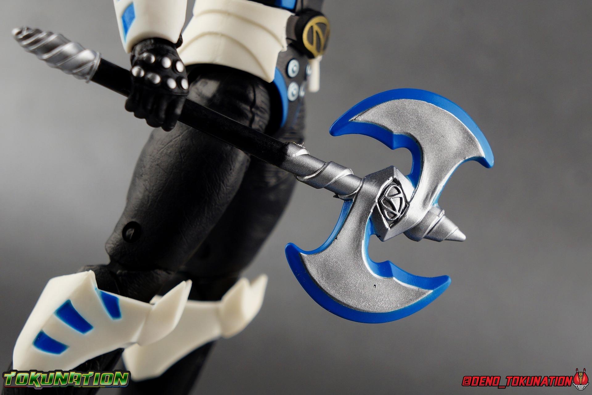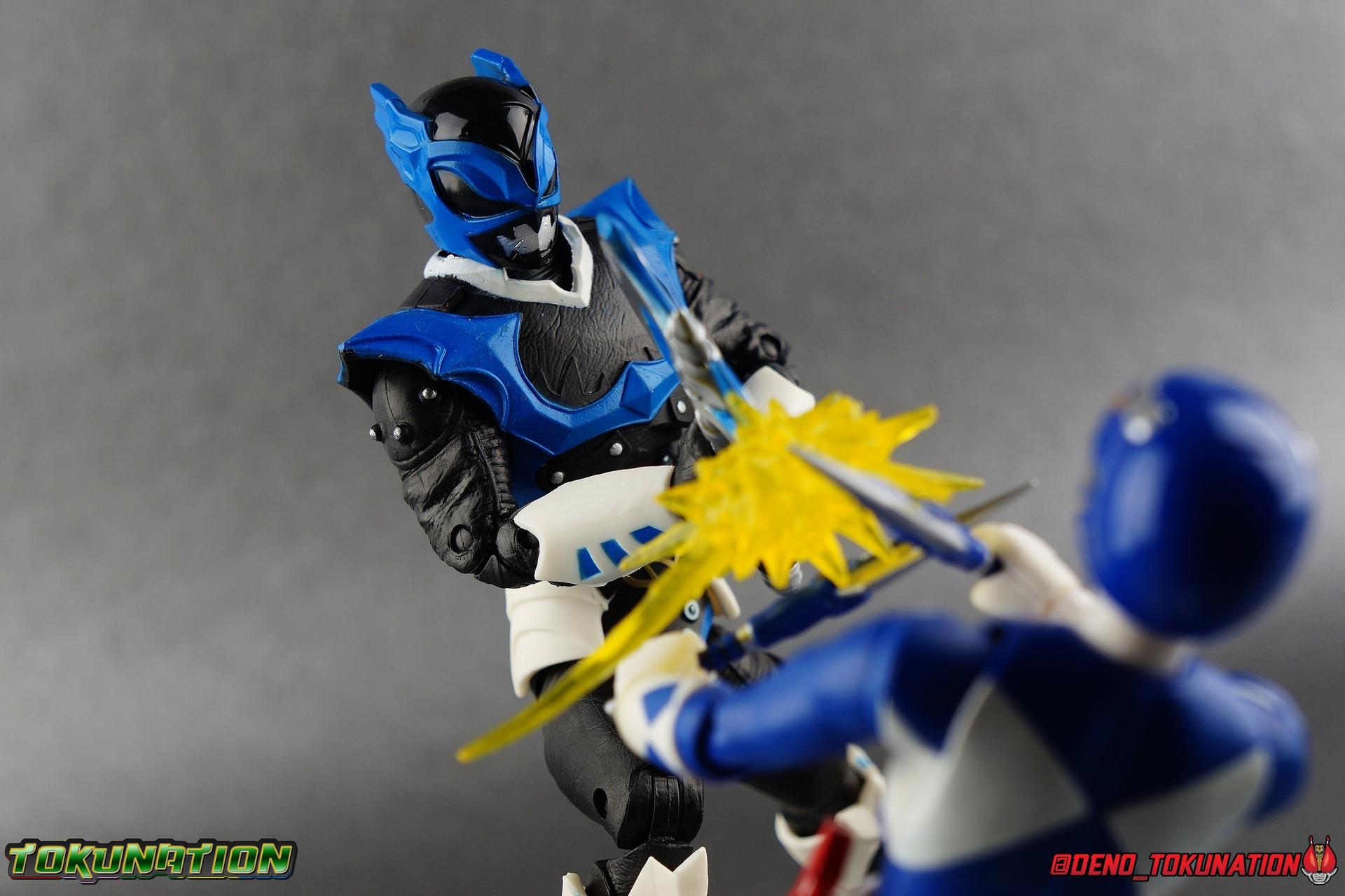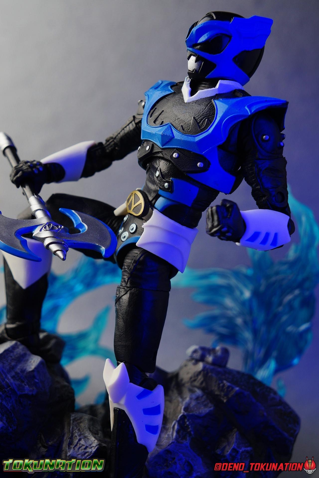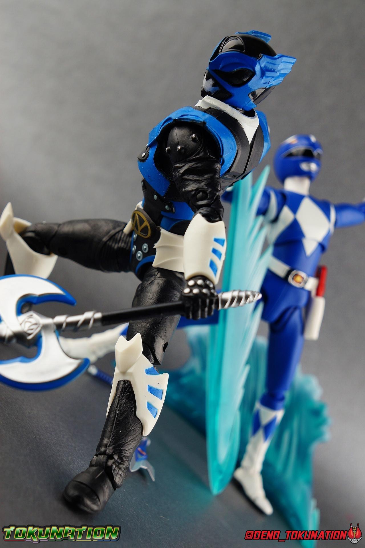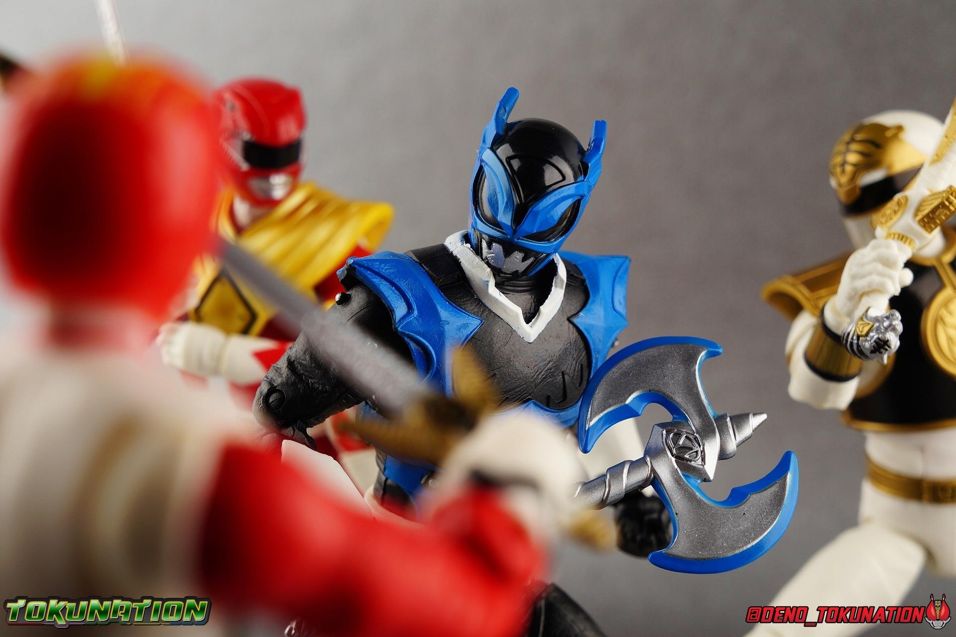 As the Space Rangers quest through the stars to save Zordon and bring peace to the galaxy, the newly brainwashed Astronema has finally found the key to their defeat. Drawing their power from the great Dark Specter, these malevolent machines are faster smarter stronger, and evil. First posing as the Power Rangers then attacking them relentlessly, the Psycho Rangers hide even more monstrous strength just below the surface. Each Psycho Ranger is programmed to ruthlessly hunt down the opposing Power Ranger of their color, and Psycho Blue will stop at nothing to find and defeat TJ, the Blue Space Ranger. Easily the most memorable and powerful team of evil rangers in franchise history, the Psycho Rangers have earned their place in the hearts of fans and collectors. So it's no surprise that seeing this team shaping up in Hasbro's Lighting Collection line has been received so well. Let's dive in and see just how much of an improvement the Hasbro Psychos are compared to the slightly older Bandai America releases! Packaging As we are all pretty familiar with the line by now, I'm sure I probably don't need to go through my usual list of reasons why it's awesome. Hasbro was keen to make sure these appealed to collectors and fans of the franchise from throughout it's various eras. And they also really pop thanks in no small part to some wonderful box art, lovingly crafted by artist Tom Whalen aka @strongstufftom on twitter. His artwork is breathtaking, and makes these figure's feel like just a bit more of a passion project from the folks at Hasbro. Psycho Blue's profile artwork takes up a majority of the packaging, while the back of the box is relegated to a single stock photo of the figure. Like Goldar and the recently released Dragon Shield Black Ranger, Psycho Blue features a non-standard color palette for the box. Main Figure Who would have thought, even just a year ago, that we'd be on our second round of Psycho Ranger figures? In the dying days of Bandai America's grip on the Power Rangers license, they did finally cater to at least one big fan demand by beginning to release Psycho Rangers in their Legacy Collection 6.5" line. Since their appearance in Power Rangers In Space in 1998, the Psycho Ranger designs had never been translated to toy form. In fact, no proper figures had ever been produced of these characters even for Denji Sentai Megaranger the year prior. So the prospect of having them at the time, was really appealing. That hopeful prospect was pretty quickly derailed by terrible QC on Bandai's Psycho's as well as the fact that they never even completed the team. Yellow & Pink were never released, while Psycho Silver & Boom! Comic character Psycho Green were exclusives. In comes Hasbro to save the day. Within their first year of having the Power Rangers license, the Lightning Collection line has now touched on a number of seasons and rangers that run the spectrum of the franchise. And now this includes a foray back to the days of In Space with their own takes on the Psycho Rangers. A true case of one upping Bandai's less than perfect attempt at the characters. Kicking off Hasbro's line is an odd choice, Psycho Blue. Released as a Gamestop Exclusive in the US (and through various other retailers internationally) Psycho Blue is our first look at the new Hasbro 6" mold that will be used to produced the rest of the team. While Understandably there may be some collector's who don't necessarily see many differences from the old Bandai Psycho's to Hasbro's, I'm here to tell you it's a world of difference. Hasbro's Psycho's come in at a much more agreeable scale than the old Bandai 6.5" line. As you can see bleow, when compared to other villains in the line like Zedd or Goldar, he's a bit shorter than them, and basically the same height as most of the Power Rangers in the line. While he also scales decently well with S.H. Figuarts. Oddly Psycho Blue is the first and so far only Blue Ranger of any kind in the Lightning Collection line as well, so I tossed in my S.H. Figuarts Tricera Ranger (MMPR Blue) as well as Vul Shark for some fun shots. Scale aside, the figure also functions much better than the last attempt at these characters, and sets a great bench mark for the rest of the team. Just looking physically at these figures its oh so apparent how much more accurate the sculpt on the Hasbro figures are by comparison. Much of the articulation present in the Lightning Collection line is pretty standard, generally with a few adjustments to suit a new mold here and there. Psycho Blue starts with tried and true side to side rocker ankle joints and ratchets for forward and back. These provide plenty of range for wide stances and stability for the figure to lean front or back. As with other Rangers, Psycho Blue also has a hidden cut below the shin armor allowing you to rotate the leg beneath the knee joint, while the knee itself is double jointed to fold back upon itself. The upper kneew joints on mine function as normal, but the lower hinge is quite tight, so just be careful if yours is the same. The sculpt on the hips is much sharper and more accurate and disguises pretty well the thigh swivel, where the old Psycho figures had limited in set hip joints. The hips themselves aren't really obstructed in any appreciable way, so thankfully them combined with the ankles and knees gives you plenty of play for posing. The waist itself is another area of huge improvement. Where Bandai opted for soft flat surfaces, Bandai has fully sculpted raised 3 dimensional detailing, particularly on the hip armor and Psycho Ranger emblem. The upper body takes a page out of the book for basically all the shield wearing rangers in this line as well. Bandai handled the Psychos' torsos by making them two vertical parts, interlocked by an ab crunch joint. Hasbro opts to have a lower torso with ab crunch coming out the waist, while the upper body is on a floating rotating joint that can move independently and provide you a 