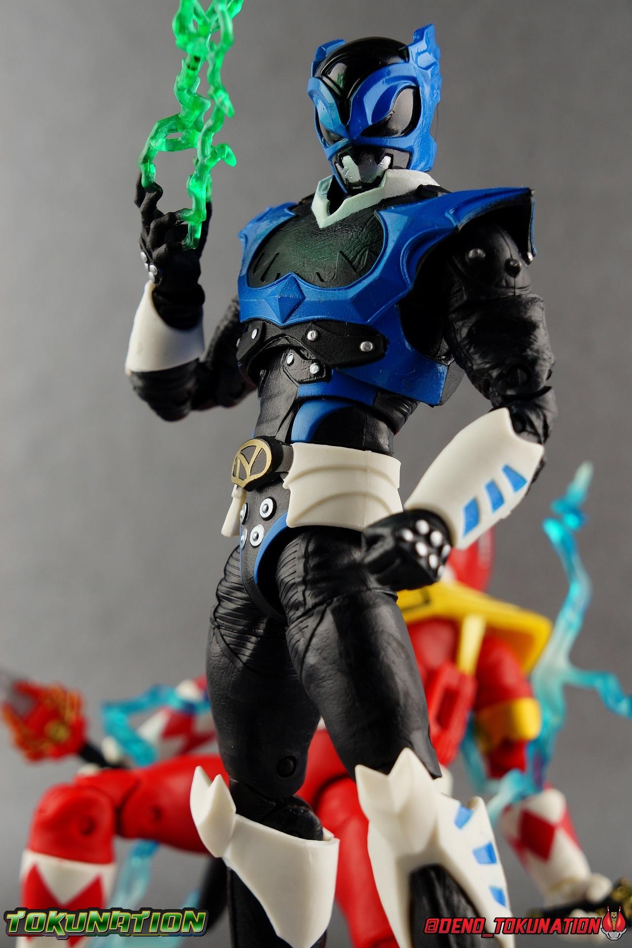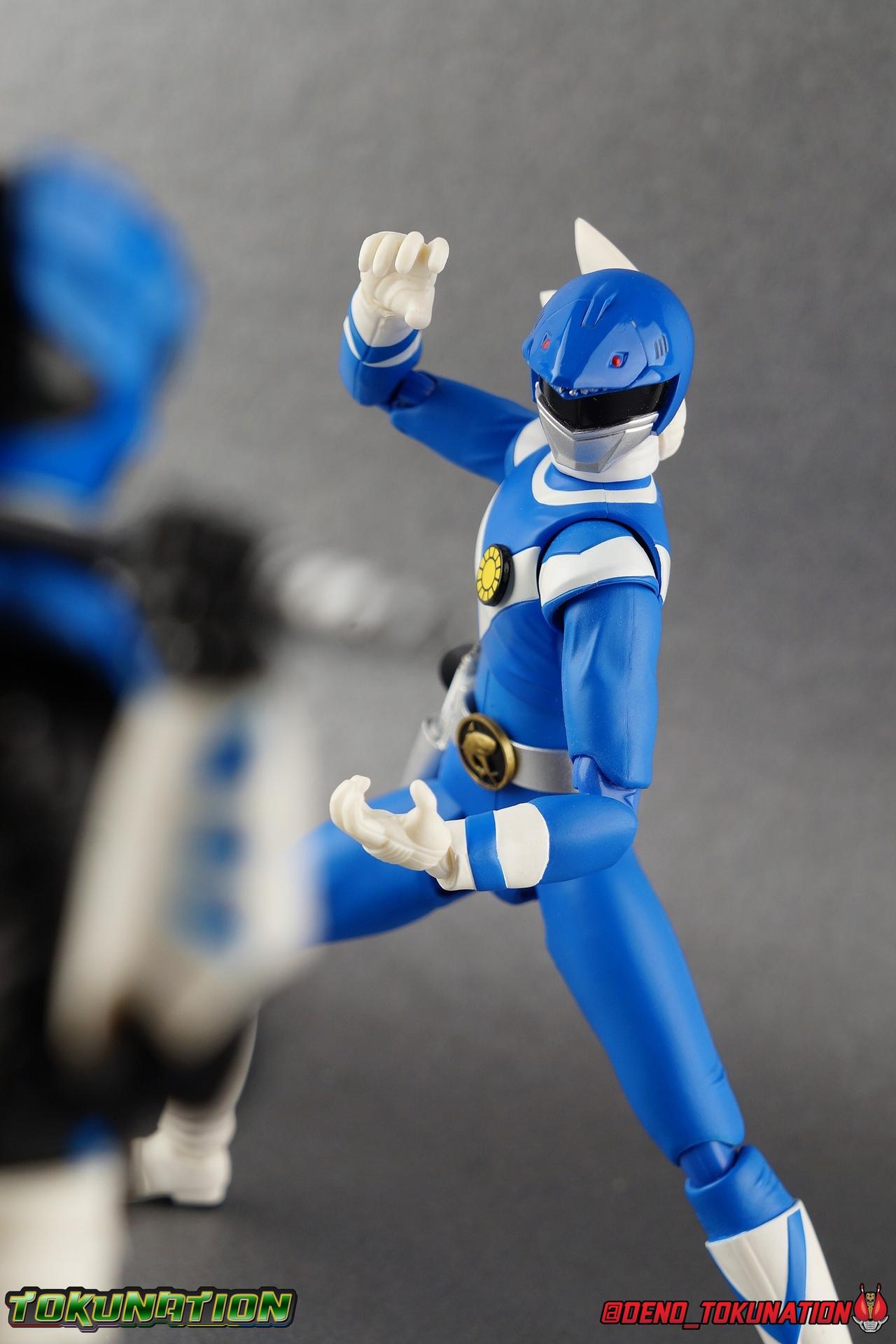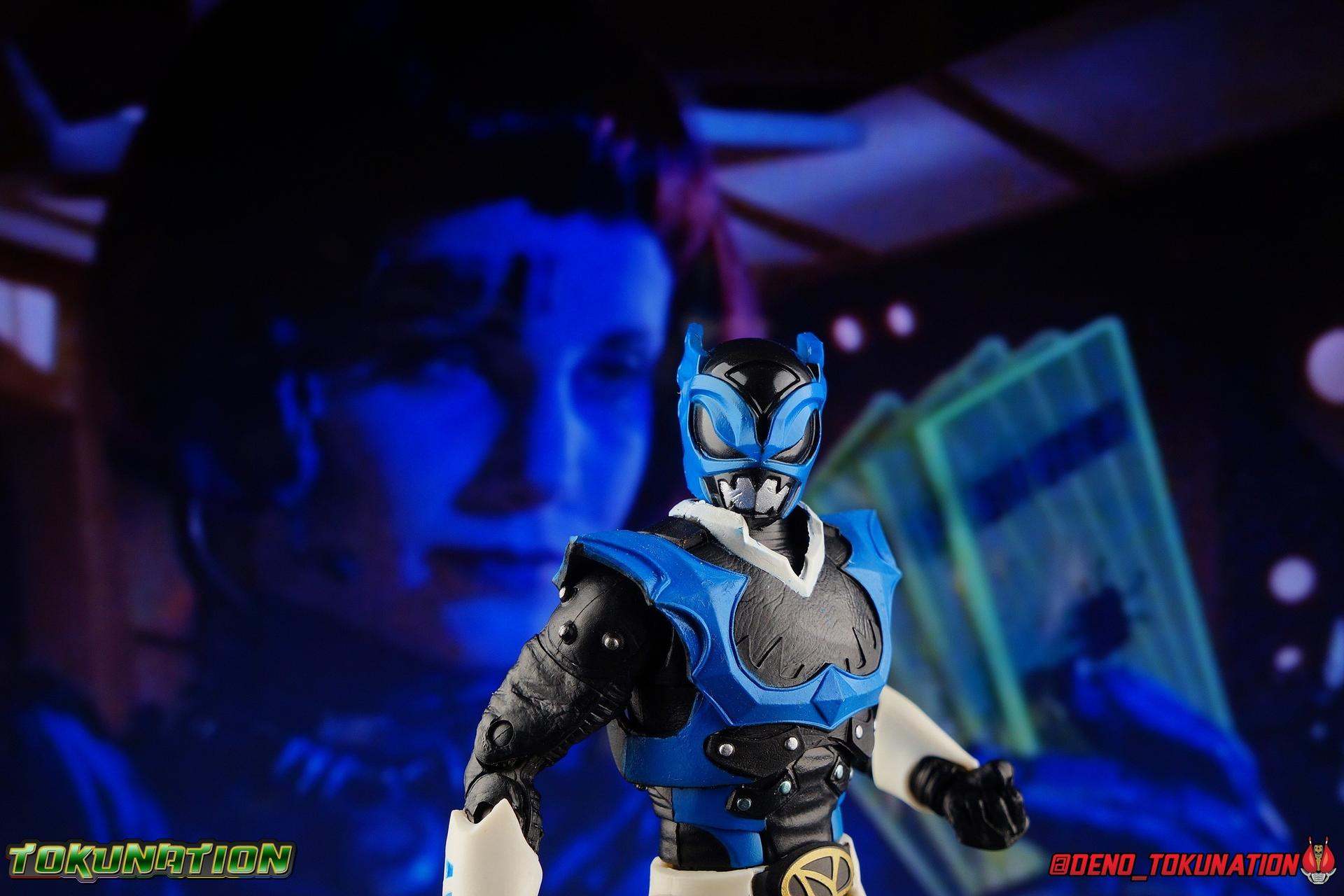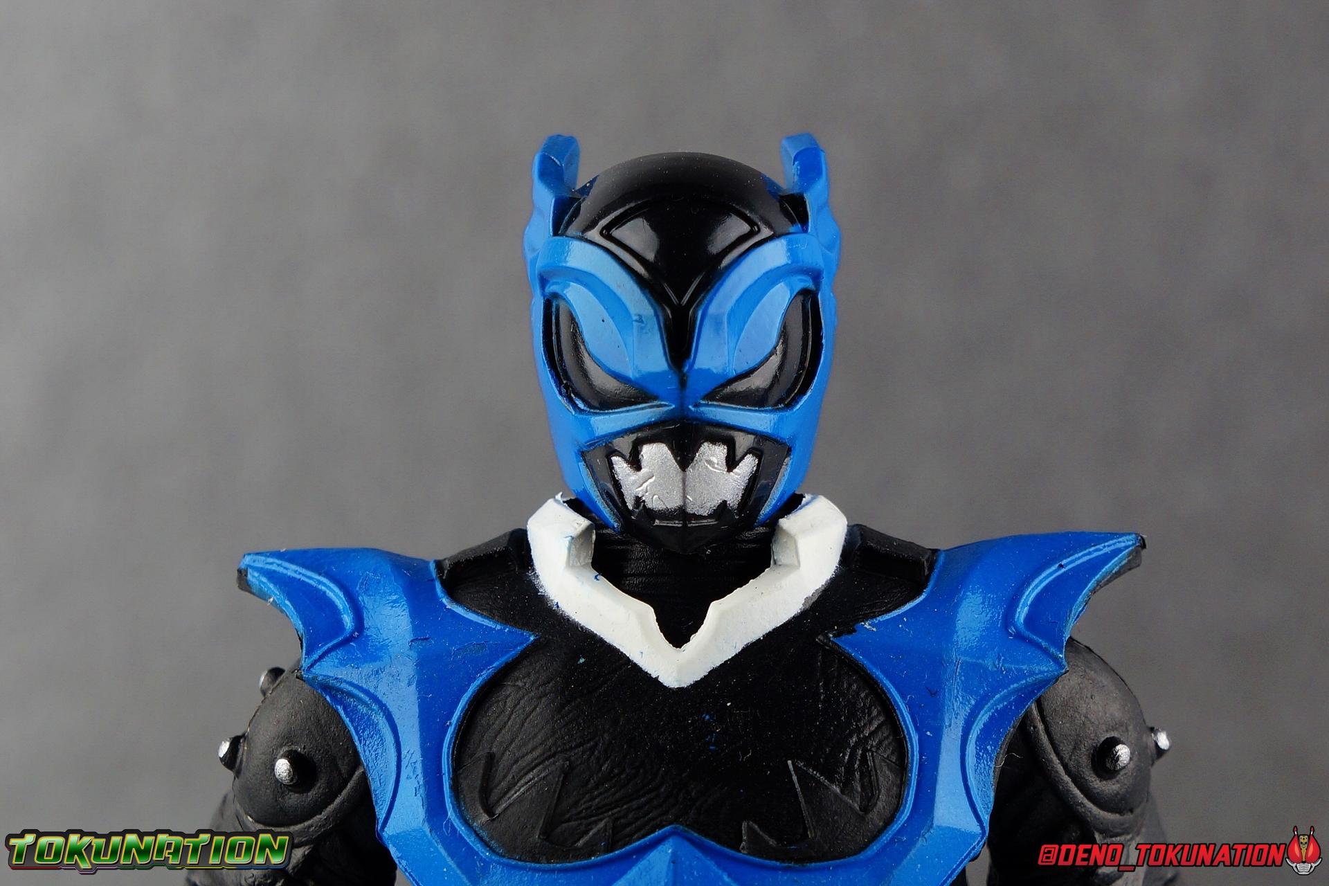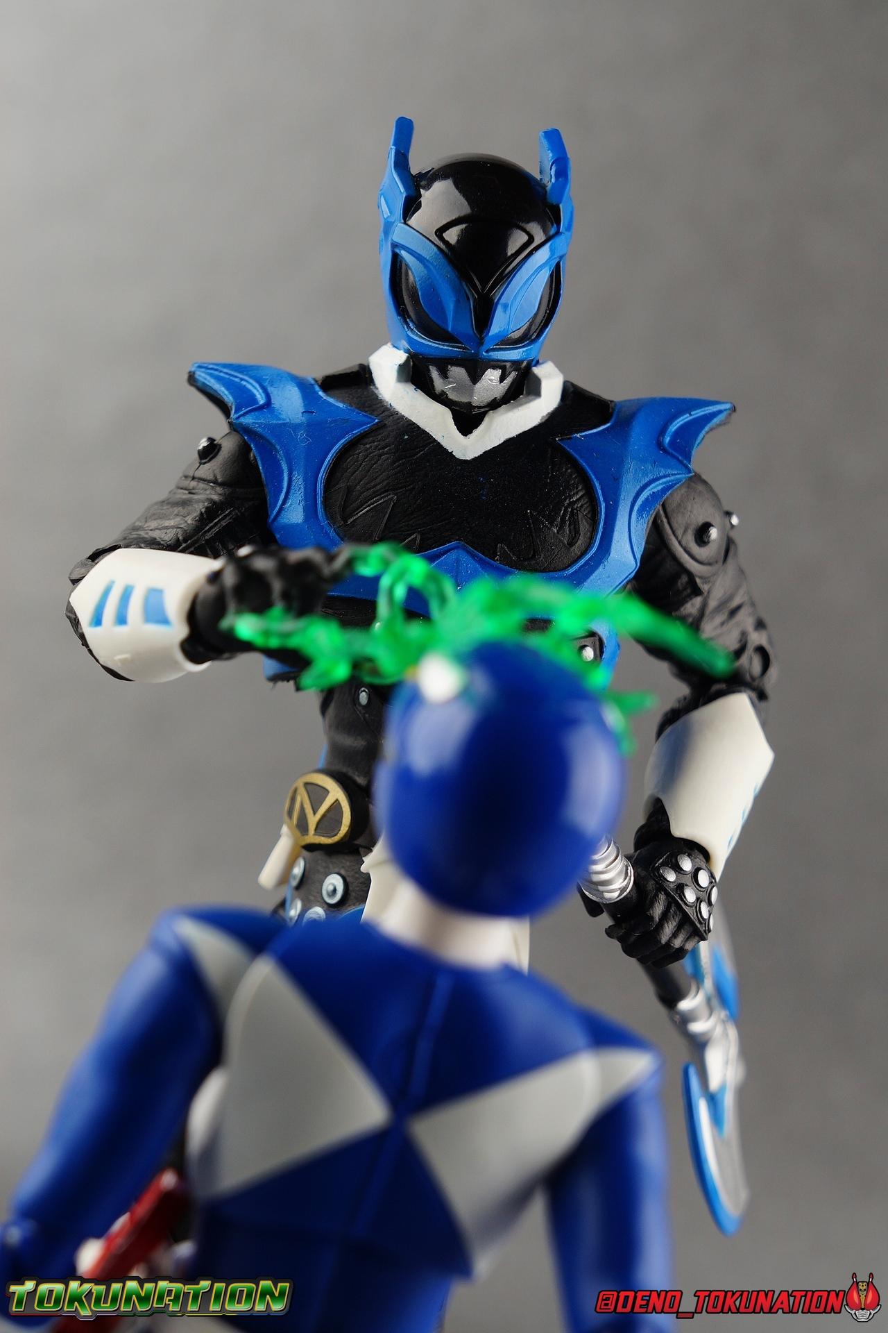 As the Space Rangers quest through the stars to save Zordon and bring peace to the galaxy, the newly brainwashed Astronema has finally found the key to their defeat. Drawing their power from the great Dark Specter, these malevolent machines are faster smarter stronger, and evil. First posing as the Power Rangers then attacking them relentlessly, the Psycho Rangers hide even more monstrous strength just below the surface. Each Psycho Ranger is programmed to ruthlessly hunt down the opposing Power Ranger of their color, and Psycho Blue will stop at nothing to find and defeat TJ, the Blue Space Ranger. Easily the most memorable and powerful team of evil rangers in franchise history, the Psycho Rangers have earned their place in the hearts of fans and collectors. So it's no surprise that seeing this team shaping up in Hasbro's Lighting Collection line has been received so well. Let's dive in and see just how much of an improvement the Hasbro Psychos are compared to the slightly older Bandai America releases! Packaging As we are all pretty familiar with the line by now, I'm sure I probably don't need to go through my usual list of reasons why it's awesome. Hasbro was keen to make sure these appealed to collectors and fans of the franchise from throughout it's various eras. And they also really pop thanks in no small part to some wonderful box art, lovingly crafted by artist Tom Whalen aka @strongstufftom on twitter. His artwork is breathtaking, and makes these figure's feel like just a bit more of a passion project from the folks at Hasbro. Psycho Blue's profile artwork takes up a majority of the packaging, while the back of the box is relegated to a single stock photo of the figure. Like Goldar and the recently released Dragon Shield Black Ranger, Psycho Blue features a non-standard color palette for the box. Main Figure Who would have thought, even just a year ago, that we'd be on our second round of Psycho Ranger figures? In the dying days of Bandai America's grip on the Power Rangers license, they did finally cater to at least one big fan demand by beginning to release Psycho Rangers in their Legacy Collection 6.5" line. Since their appearance in Power Rangers In Space in 1998, the Psycho Ranger designs had never been translated to toy form. In fact, no proper figures had ever been produced of these characters even for Denji Sentai Megaranger the year prior. So the prospect of having them at the time, was really appealing. That hopeful prospect was pretty quickly derailed by terrible QC on Bandai's Psycho's as well as the fact that they never even completed the team. Yellow & Pink were never released, while Psycho Silver & Boom! Comic character Psycho Green were exclusives. In comes Hasbro to save the day. Within their first year of having the Power Rangers license, the Lightning Collection line has now touched on a number of seasons and rangers that run the spectrum of the franchise. And now this includes a foray back to the days of In Space with their own takes on the Psycho Rangers. A true case of one upping Bandai's less than perfect attempt at the characters. Kicking off Hasbro's line is an odd choice, Psycho Blue. Released as a Gamestop Exclusive in the US (and through various other retailers internationally) Psycho Blue is our first look at the new Hasbro 6" mold that will be used to produced the rest of the team. While Understandably there may be some collector's who don't necessarily see many differences from the old Bandai Psycho's to Hasbro's, I'm here to tell you it's a world of difference. Hasbro's Psycho's come in at a much more agreeable scale than the old Bandai 6.5" line. As you can see bleow, when compared to other villains in the line like Zedd or Goldar, he's a bit shorter than them, and basically the same height as most of the Power Rangers in the line. While he also scales decently well with S.H. Figuarts. Oddly Psycho Blue is the first and so far only Blue Ranger of any kind in the Lightning Collection line as well, so I tossed in my S.H. Figuarts Tricera Ranger (MMPR Blue) as well as Vul Shark for some fun shots. Scale aside, the figure also functions much better than the last attempt at these characters, and sets a great bench mark for the rest of the team. Just looking physically at these figures its oh so apparent how much more accurate the sculpt on the Hasbro figures are by comparison. Much of the articulation present in the Lightning Collection line is pretty standard, generally with a few adjustments to suit a new mold here and there. Psycho Blue starts with tried and true side to side rocker ankle joints and ratchets for forward and back. These provide plenty of range for wide stances and stability for the figure to lean front or back. As with other Rangers, Psycho Blue also has a hidden cut below the shin armor allowing you to rotate the leg beneath the knee joint, while the knee itself is double jointed to fold back upon itself. The upper kneew joints on mine function as normal, but the lower hinge is quite tight, so just be careful if yours is the same. The sculpt on the hips is much sharper and more accurate and disguises pretty well the thigh swivel, where the old Psycho figures had limited in set hip joints. The hips themselves aren't really obstructed in any appreciable way, so thankfully them combined with the ankles and knees gives you plenty of play for posing. The waist itself is another area of huge improvement. Where Bandai opted for soft flat surfaces, Bandai has fully sculpted raised 3 dimensional detailing, particularly on the hip armor and Psycho Ranger emblem. The upper body takes a page out of the book for basically all the shield wearing rangers in this line as well. Bandai handled the Psychos' torsos by making them two vertical parts, interlocked by an ab crunch joint. Hasbro opts to have a lower torso with ab crunch coming out the waist, while the upper body is on a floating rotating joint that can move independently and provide you a 