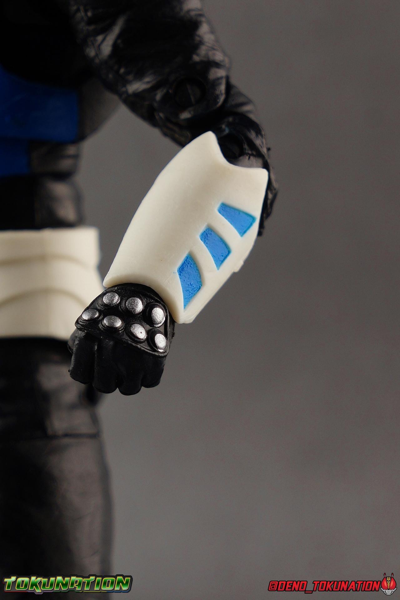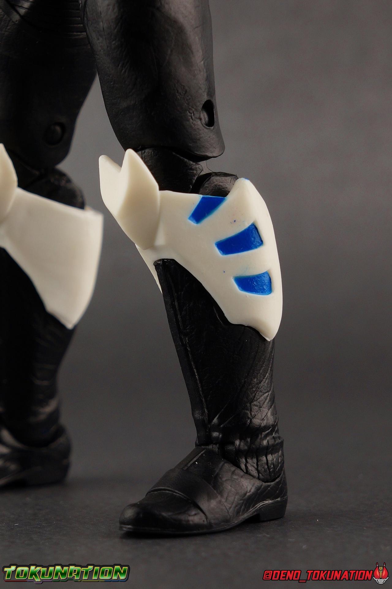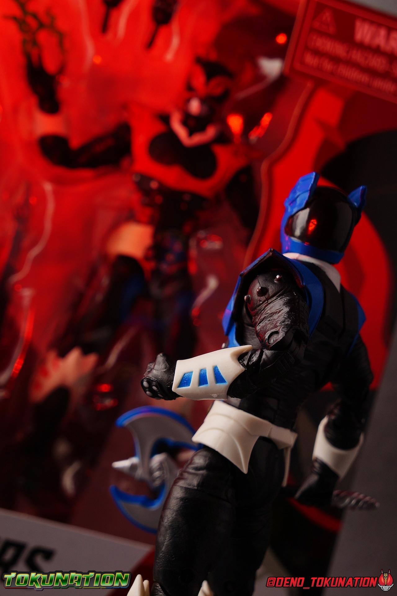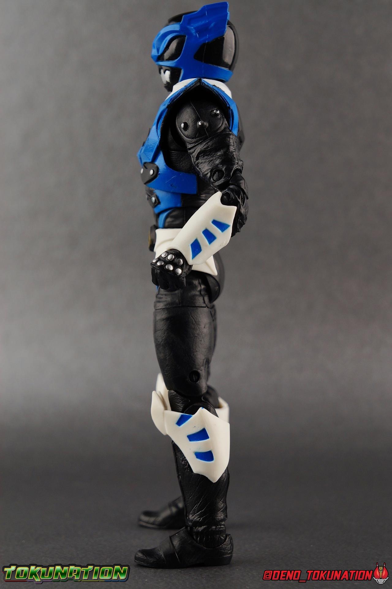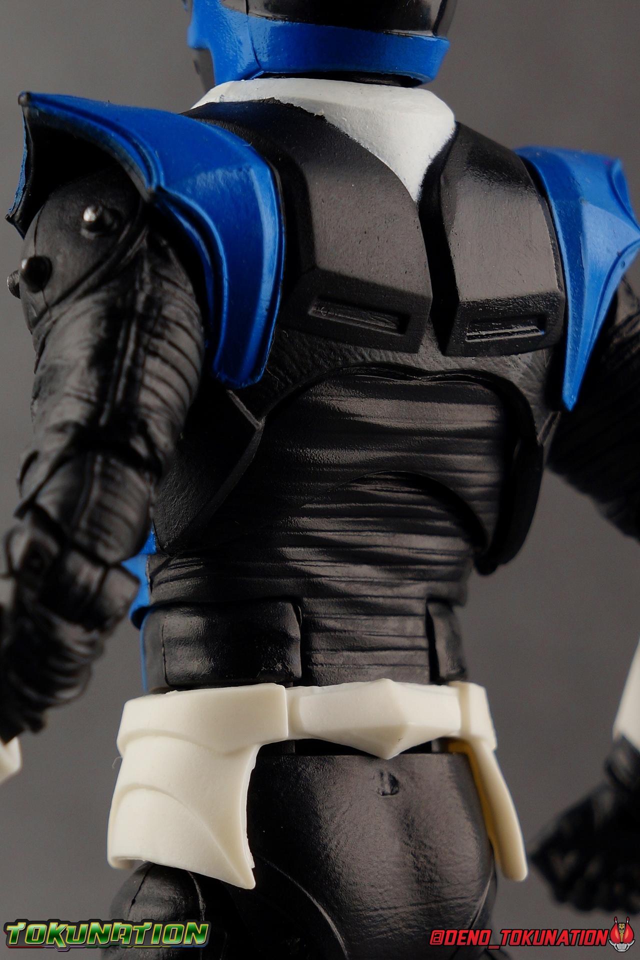As the Space Rangers quest through the stars to save Zordon and bring peace to the galaxy, the newly brainwashed Astronema has finally found the key to their defeat. Drawing their power from the great Dark Specter, these malevolent machines are faster smarter stronger, and evil. First posing as the Power Rangers then attacking them relentlessly, the Psycho Rangers hide even more monstrous strength just below the surface. Each Psycho Ranger is programmed to ruthlessly hunt down the opposing Power Ranger of their color, and Psycho Blue will stop at nothing to find and defeat TJ, the Blue Space Ranger. Easily the most memorable and powerful team of evil rangers in franchise history, the Psycho Rangers have earned their place in the hearts of fans and collectors. So it's no surprise that seeing this team shaping up in Hasbro's Lighting Collection line has been received so well. Let's dive in and see just how much of an improvement the Hasbro Psychos are compared to the slightly older Bandai America releases! Packaging As we are all pretty familiar with the line by now, I'm sure I probably don't need to go through my usual list of reasons why it's awesome. Hasbro was keen to make sure these appealed to collectors and fans of the franchise from throughout it's various eras. And they also really pop thanks in no small part to some wonderful box art, lovingly crafted by artist Tom Whalen aka @strongstufftom on twitter. His artwork is breathtaking, and makes these figure's feel like just a bit more of a passion project from the folks at Hasbro. Psycho Blue's profile artwork takes up a majority of the packaging, while the back of the box is relegated to a single stock photo of the figure. Like Goldar and the recently released Dragon Shield Black Ranger, Psycho Blue features a non-standard color palette for the box. Main Figure Who would have thought, even just a year ago, that we'd be on our second round of Psycho Ranger figures? In the dying days of Bandai America's grip on the Power Rangers license, they did finally cater to at least one big fan demand by beginning to release Psycho Rangers in their Legacy Collection 6.5" line. Since their appearance in Power Rangers In Space in 1998, the Psycho Ranger designs had never been translated to toy form. In fact, no proper figures had ever been produced of these characters even for Denji Sentai Megaranger the year prior. So the prospect of having them at the time, was really appealing. That hopeful prospect was pretty quickly derailed by terrible QC on Bandai's Psycho's as well as the fact that they never even completed the team. Yellow & Pink were never released, while Psycho Silver & Boom! Comic character Psycho Green were exclusives. In comes Hasbro to save the day. Within their first year of having the Power Rangers license, the Lightning Collection line has now touched on a number of seasons and rangers that run the spectrum of the franchise. And now this includes a foray back to the days of In Space with their own takes on the Psycho Rangers. A true case of one upping Bandai's less than perfect attempt at the characters. Kicking off Hasbro's line is an odd choice, Psycho Blue. Released as a Gamestop Exclusive in the US (and through various other retailers internationally) Psycho Blue is our first look at the new Hasbro 6" mold that will be used to produced the rest of the team. While Understandably there may be some collector's who don't necessarily see many differences from the old Bandai Psycho's to Hasbro's, I'm here to tell you it's a world of difference. Hasbro's Psycho's come in at a much more agreeable scale than the old Bandai 6.5" line. As you can see bleow, when compared to other villains in the line like Zedd or Goldar, he's a bit shorter than them, and basically the same height as most of the Power Rangers in the line. While he also scales decently well with S.H. Figuarts. Oddly Psycho Blue is the first and so far only Blue Ranger of any kind in the Lightning Collection line as well, so I tossed in my S.H. Figuarts Tricera Ranger (MMPR Blue) as well as Vul Shark for some fun shots. Scale aside, the figure also functions much better than the last attempt at these characters, and sets a great bench mark for the rest of the team. Just looking physically at these figures its oh so apparent how much more accurate the sculpt on the Hasbro figures are by comparison. Much of the articulation present in the Lightning Collection line is pretty standard, generally with a few adjustments to suit a new mold here and there. Psycho Blue starts with tried and true side to side rocker ankle joints and ratchets for forward and back. These provide plenty of range for wide stances and stability for the figure to lean front or back. As with other Rangers, Psycho Blue also has a hidden cut below the shin armor allowing you to rotate the leg beneath the knee joint, while the knee itself is double jointed to fold back upon itself. The upper kneew joints on mine function as normal, but the lower hinge is quite tight, so just be careful if yours is the same. The sculpt on the hips is much sharper and more accurate and disguises pretty well the thigh swivel, where the old Psycho figures had limited in set hip joints. The hips themselves aren't really obstructed in any appreciable way, so thankfully them combined with the ankles and knees gives you plenty of play for posing. The waist itself is another area of huge improvement. Where Bandai opted for soft flat surfaces, Bandai has fully sculpted raised 3 dimensional detailing, particularly on the hip armor and Psycho Ranger emblem. The upper body takes a page out of the book for basically all the shield wearing rangers in this line as well. Bandai handled the Psychos' torsos by making them two vertical parts, interlocked by an ab crunch joint. Hasbro opts to have a lower torso with ab crunch coming out the waist, while the upper body is on a floating rotating joint that can move independently and provide you a 