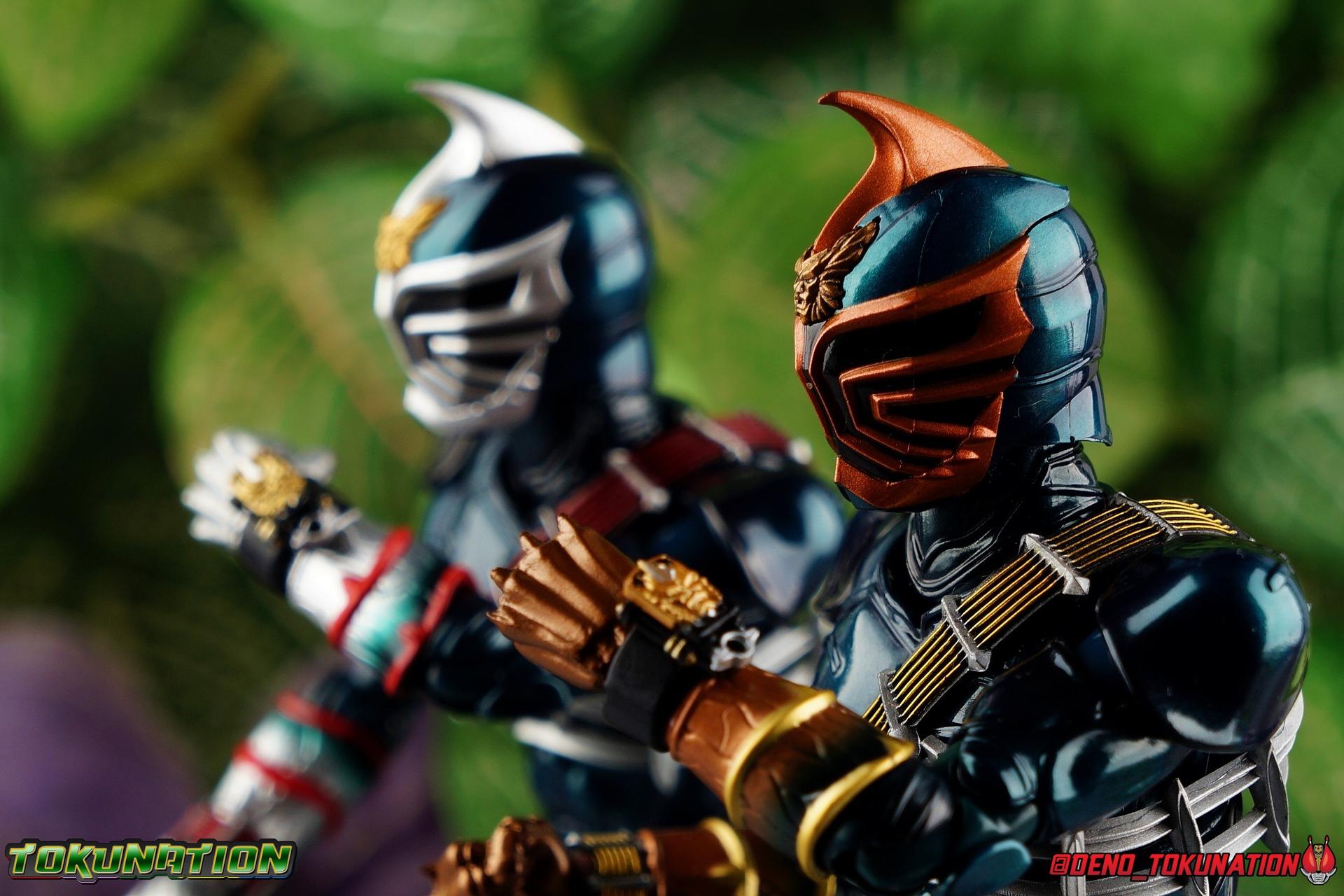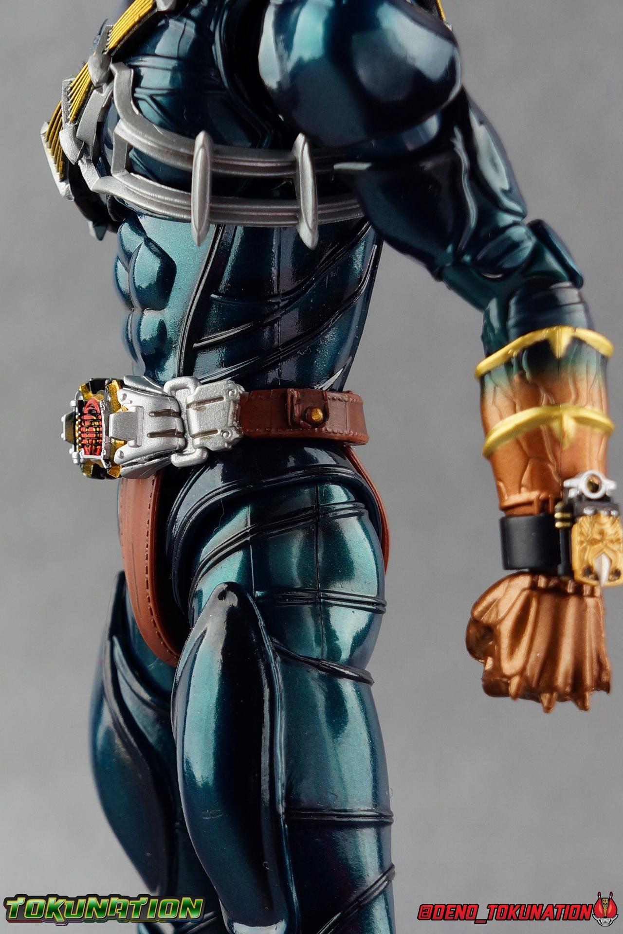 Kamen Rider Hibiki finally joined the S.H. Figuarts line for the first time over 4 years ago. Then last year, Tamashii at last made their second addition from Hibiki's world to this line with Kamen Rider Ibuki. It's taken quite some time for the beautiful Oni Riders to show up in the Shinkocchou Seihou line, but after the recent release of Kamen Rider Todoroki it's befitting that his master has been released as well. Kamen Rider Zanki! Like any Oni master, Zaoumaru Zaitsuhara took on an apprentice. Someone to pass along his skills to, his techniques, and one day his title as well. But the young man once known as Tomizo Todoyama had other plans. This kind warrior wasn't as experienced as his contemporaries Hibiki or Ibuki in the fight against the Makamou, but his dedication to protect others made him the hero he is today. Refusing to inherit his masters title to create his own legacy, Todoyama took on the name Todoroki! Kamen Rider Zanki passed on the remainder of his knowledge, his skills, and the mighty Ongekiken Retsurai to the young Todoroki. But a warrior's journey never ends. Never far from the battlefield, and returning once again to take up the Ongekiken Retsuzan, Zanki continues the fight alongside his disciple, for as long as his body will last! Packaging It's the familiar Shinkocchou Seihou slip cover box once again! Not much can be said about it this time that hasn't been said before. It's gotten a bit stale (to me) over time but it's still a pleasing type of uniform collector's box thats great for storage. Main Figure This review will be nearly identical to that of Todoroki. The two figure's have very very minor physical differences. So don't be surprised to see huge portions of this review be word for word identical to that one. Like Hibiki, Ibuki, & Todoroki, Zanki is a stunning figure. The sculpt of this body type is superb (even 4 years on!), really bringing to life these unique Oni Rider suits. In every way imaginable it captures the look of the on screen suit right down to the textured musculature, and the gloss of the armor really gives in that pleather/vinyl feel of the actual suits. A favorite detail of mine. The design process Seihou's go through has always been much much more involved than that of the standard figuarts line and the best examples of this were the special booklets included with Kabuto & Hibiki. When the design begins with a sort of skeletal inner frame, and builds out what would be like a suit over a real human body like this, you get a much more realistic application of articulation and proportion to the body as a result. Now despite the obvious color changes, Zanki is the same basic mold as Hibiki & Ibuki, but is literally identical to Todoroki even featuring identical articulation placement. When Bandai nails the basic design of the body, it can be truly astounding how outer level cosmetic changes can create a vastly different presentation. But of course, even 4 years later some of my issues with this mold still persist. I've always found the legs to be quite odd. To me, they look really long and at odds with the torso, especially when bent for crouching poses. Something about them looks off. They function well enough, though I've always thought this mold had one of the more strange figuarts hip joints out there. While the part separation undoubtedly gives them great range, the hips look very small by the time you angle them out fully, making the thigh seem huge by comparison. And while the knees function just fine, the feet could be slightly better. Despite being pretty large, they don't easily rest flat on any surface, and the toe bends can be difficult to line up straight. Znki's belt is really loaded up with accessories like his predecessors. This figure comes with a lot and luckily you can store some of it on his belt given the display options you've chosen. When loaded out for static poses, the left hip can be outfitted with a Disc Animal holster with 3 non-removable discs sculpted in. Or you can keep the out of box standard part which is an empty holster for when you want him to hold the discs in hand. Straight out of the box, the center of the belt has Zanki's Ongekishin Zantetsu attached. This rectangular piece is removable to simulate how it combines with the Ongekigen - Retsuzan, though it does not actually combine (a separate piece is included). It can be used with any Oni Rider that has a similarly designed belt. In Zanki's original role as Todoroki's master, his belt featured the Ongekishin - Raigou, but since training Todoroki it has been passed down to him. The upper body is identical to Todoroki as well, just removing the red string accents and replacing them with gold. This bandoleer like sash is still my favorite part of the Zanki/Todoroki design. The upper and lower halves of the torso move independent of one another, though it's a tight fit to get either to move very far. I've always felt this body type was a bit stiff, but it gets the job done very nicely still. Zanki's arms are basically identical to all of the other Oni Riders, though like the rest of the body these are painted in a nice glossy deep green. The silver fade from Todoroki has been replaced by a gorgeous gold on Zanki, as well as further red accents. The left shoulder pad does impact the bandoleer at times so be careful not to scratch it, but thankfully the pads don't pop off frequently as they did with Ibuki. The left wrist also features the Henshin Kigen Onka. This one is in it's closed form, but an open version of the accessory is included to replicate Zanki's transformation. And like others, but particularly Todoroki, Zanki has a stunningly accurate headsculpt. All 4 riders have insanely well detailed sculpts, but the Oni face on Todoroki's head is just top notch. The horn protrusion on his head is actually quite sharp as well, so watch out there. Zanki's head is of course a real nice mostly bronze repaint of Todoroki and it's just stunning on this mold. Th