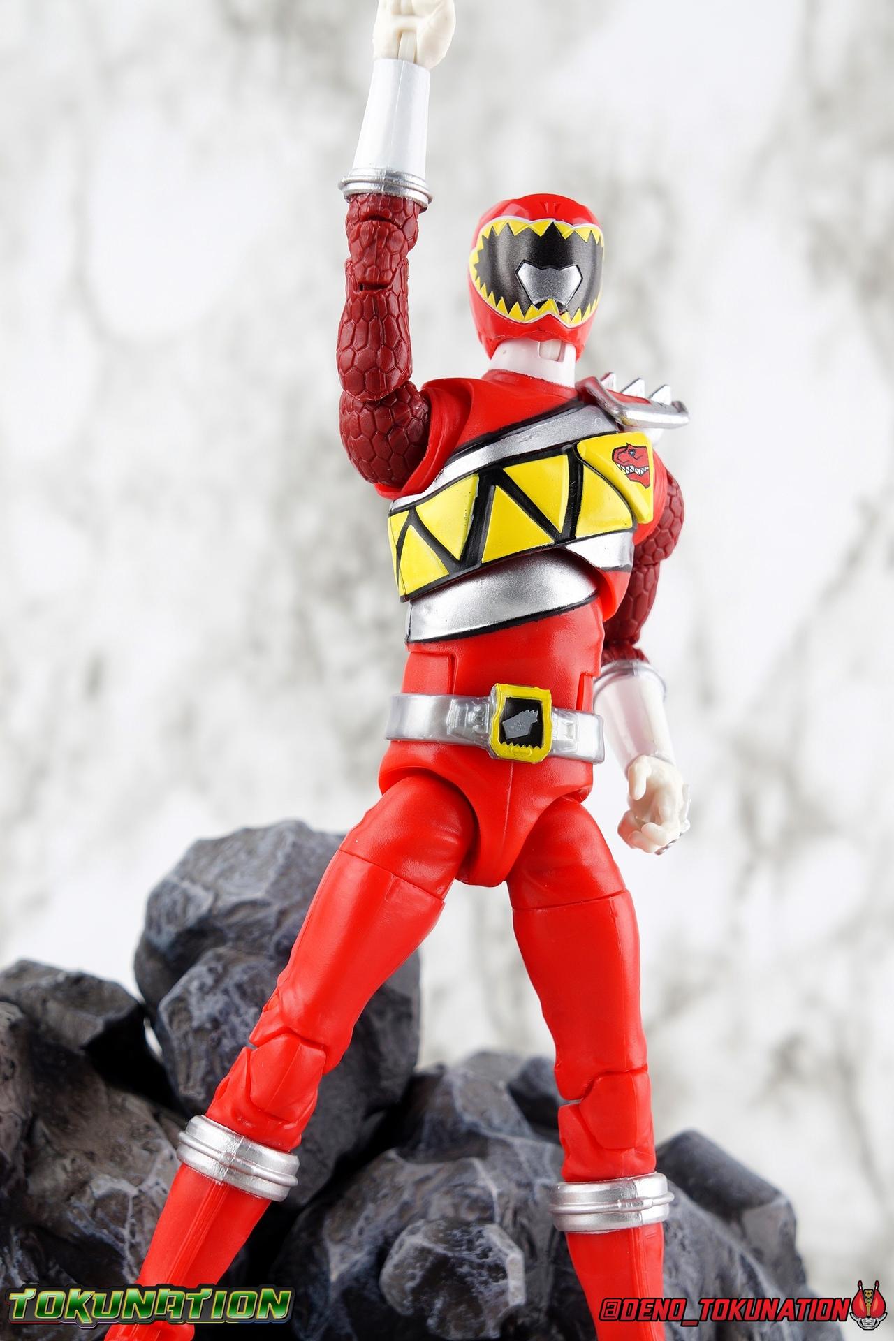 Arriving in Amber Beach on a mission to find his long lost father, Tyler Navarro could never imagine what really lay ahead for him. By chance, he and his new friends come into contact with the Energems, ancient crystals that channel the Morphin Grid and the energy of the universe. Once entrusted to the ancient dinosaurs of the past by the mysterious alien Keeper, these Energems have chosen Tyler and the others to be the next generation of Power Rangers! To defend the Earth, to defeat the villainous Sledge and his crew, to unlock the ultimate power of the universe, in a world full of strife the Dino Charge Red Ranger fights to survive! Packaging As we are all pretty familiar with the line by now, I'm sure I probably don't need to go through my usual list of reasons why it's awesome. Hasbro was keen to make sure these appealed to collectors and fans of the franchise from throughout it's various eras. And they also really pop thanks in no small part to some wonderful box art, lovingly crafted by artist Tom Whalen aka @strongstufftom on twitter. His artwork is breathtaking, and makes these figure's feel like just a bit more of a passion project from the folks at Hasbro. Main Figure I know. This one is way overdue. Lightning Collection has really come along in the last roughly year, moving at a pretty brisk clip. And in trying to catch up on previous releases I've finally gotten back around to Dino Charge Red. This was a figure I'd originally written off as unnecessary, largely due to the Kyoryu Red S.H. Figuart I had. My thinking on the matter has really swung around the other way since however. While LC figures will never replicate the same quality and engineering of SHF's, it's just so clear that they have such great play value for their price. I've been slowly selling off my Sentai SHF's and being pretty happy with the LC's I've replaced them with. Once I finally gave Dino Charge Red a chance, I was not disappointed. As the last figure from Wave 1 that I've reviewed, in fact having reviewed all of Wave 1 2 and half of 3 by now, I didn't expect the Red Ranger to blow me away. I'm happy to report that this is a very solid figure though, and I think people have really been sleeping on the quality of this mold. Though the recently released Dino Charge Gold Ranger has been divisive, people have been mostly quiet about Red. Like most figures in the line this is a well engineered and quite enjoyable figure. Standard articulation cuts in this line make most any figure feel good in hand and DC Red is no different. The standard rocker ratchet ankles work well as always, though on my copy the ankle ratchets are extremely tight making it very difficult to move them forward. I felt like I might snap the peg off but so far nothing like that has happened. DC Red still has the boot cuff style swivel below the knee though it's much less obvious because of the largely uniform red suit. The knees are the same typical double bend and although I know some collectors aren't fond of the sort of square shaped knee pad that's left from bending the leg, it's really the most sensible design for functionality. The standard hinged hips are present as well and they strike a nice balance of firm & flexible and are helped along in posing by the thigh swivel. Around his waste, Tyler has the signature Dino Charge Dino Com buckle. While it isn't fully painted, the details are sculpted and painted well enough to communicate what it is. The belt sits up just a bit high, in front of the ab crunch, but can be slid down a bit back out of the way. As with most any Lightning figure, DC Red's ab crunch is the best part of the upper body, really giving him some dynamic range. The floating ball jointed upper body is of course quite nice as well. The difference here is that unlike many rangers in the line who have either so far had a lot of chest armor over this section, or a less intricate design on the chest, Dino Charge Red has that elaborate sash design. And not only is it painted but also sculpted into the torso coming down from the upper body and back across the lower torso as well. Undoubtedly much of the cost for sculpting and paint apps went into this area of the figure, perhaps explaining some of the other missing details on it. I particularly appreciate how well the "Rexy" logo on Tyler's chest is painted given it's small scale. The upper body really is pretty great despite some minor discrepancies. The arms are based around the standard butterfly shoulder joint, though the chunks of torso used for it on this figure seem larger to me. Each arm gets some pretty great detailing in the form of sculpted in dino scales coming down from the shoulder peg and onto the forearms. We still get the bicep swivel we love, the double jointed elbow we need, and the wrists that get that the job done. Finally that brings us to the Red Ranger's helmet. Honestly this one of the more spot on sculpts in the line. The teeth accenting the visor are slightly off, but overall I find this to be a really well done figure in the line. Since DC Red has a pretty standard upper body and neck there's no danger of losing an articulation for the head so it really works like the best of the line. The gallery beloow features a few cameos I hope you'll enjoy. The S.H. Figuarts Kyoryugers join LC Red for some group shots, and we've got some good comparisons of this figure to Kyoryu Red specifically. Further below we also feature the Kyoryuger Deinochaser toy, which had quite a bit more functionality than Bandai's Dino Cycles released for Dino Charge. Accessories Like a lot of this line, the Dino Charge Red Ranger comes with a smattering of great accessories: 1 - Dino Charge Morpher. This yellow/black blaster is the US equivalent of the Gaburevolver from Kyoryuger. While I know the comparison isn't entirely fair I did include a comparison of the two just for some contrast. While neither of them can function or accept Dino Chargers/Zyudenchi and the Dino Charge M
