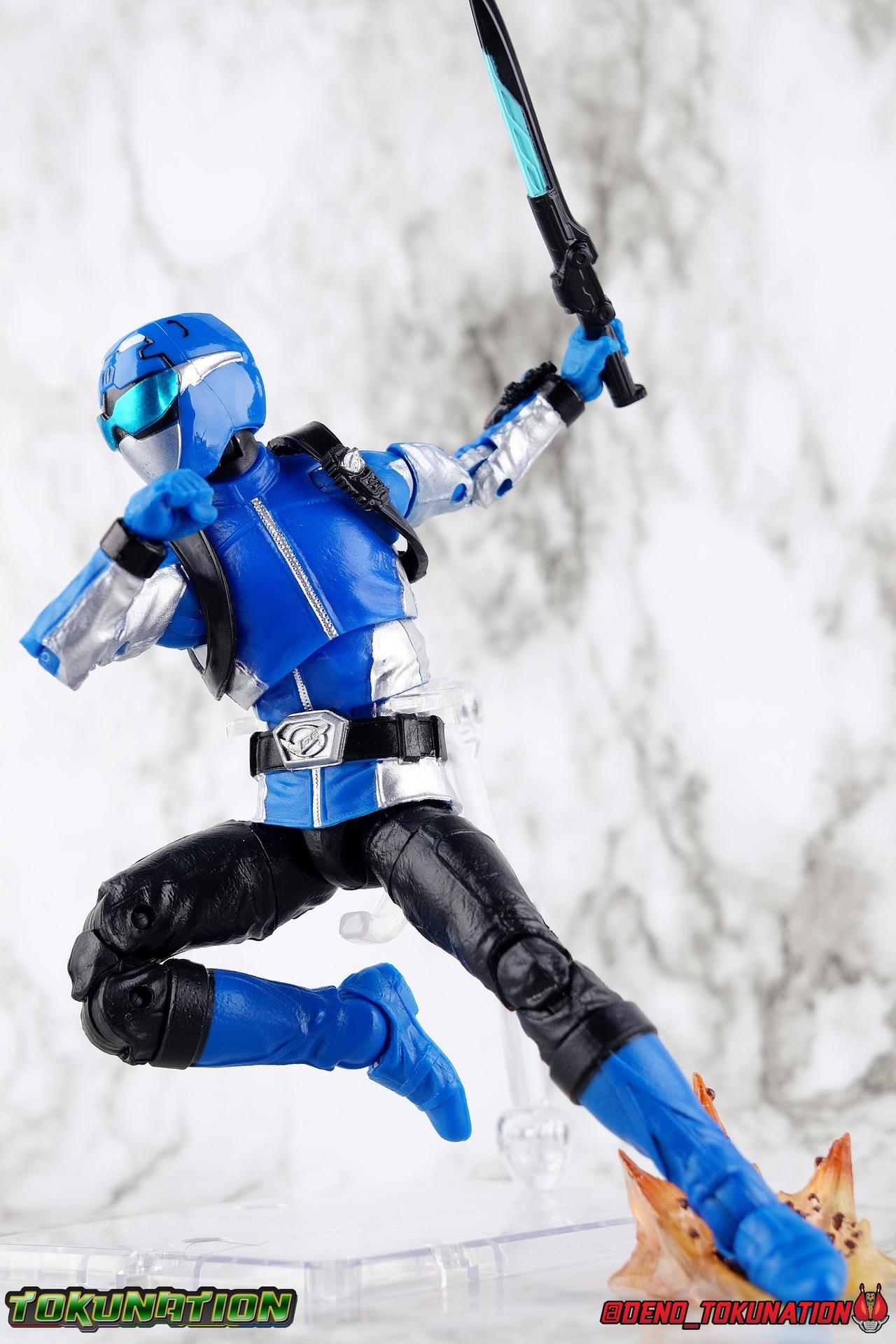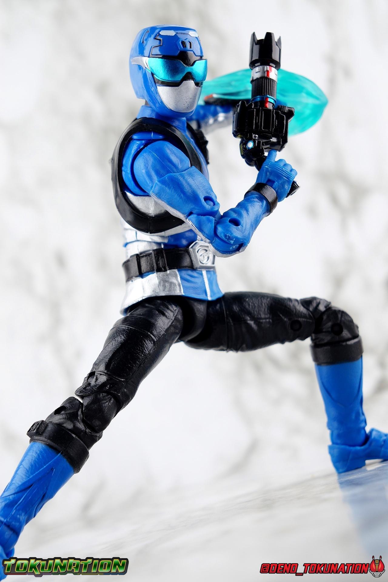 Ravi Shaw was meant to be a Power Ranger. Selected by Grid Battleforce, Ravi trained tirelessly to earn his place & his power with his teammates. But before they could become Rangers, Blaze & Roxy became something else entirely. Avatars, loyal only to the villain Evox! And Ravi's former comrades would have done the same to him if not for the intervention of Devon Daniels & Zoey Reeves. Joining his new friends, Ravi's body is infused with Morph-X energy as well as gorilla DNA, turning him into the mighty Beast Morphers Blue Ranger! Heading into battle with his less experienced friends, Ravi's training will help him build a united front against the enemies who threaten Grid Battleforce and Coral Harbor. Packaging In creating this line, Hasbro was keen to make sure they appealed to collectors and fans of the franchise from throughout it's various eras. Given the aim to make this appeal to an older crowd, the packaging seems to have taken a page out of the Star Wars Black Series book. In similar collector style boxes, the Lightning collection figure's look a bit brighter thanks to a primarily white color scheme. But they also really pop thanks in no small part to some wonderful box art, lovingly crafted by artist Tom Whalen aka @strongstufftom on twitter. His artwork is breathtaking, and makes these figure's feel like just a bit more of a passion project from the folks at Hasbro. Main Figure The Power Rangers Lighting Collection continues to truck right along with the recent releases of Wave 3 as well as official images of the upcoming Wave 4. Recently I had a chance to sit down and give the Beast Morphers Red Ranger a proper gallery & review, so I'm more than ready to tackle the Blue Ranger now as well. These two figures share an identical mold aside from their headsculpts, so my review will be mostly the same. Feel free to skip it if you read the previous one and just check out the pics attached below! This is the second outing for the main Beast Morphers male body. The Gold Ranger set an excellent standard for this team in the line, so I was really pleased with how the core member mold turned out. For years I'd wanted to have a better set of Go-Busters in my collection. I've had all the Go-Busters Figuarts for years, but they definitely have their flaws. This LC mold really does fulfill my desires. Like many LC figures, the Blue Ranger carries through much of the same standard articulation cuts we've come to know. Full rotating rocker ankles and a clicking swivel joint for them to go back and forth. A shin swivel at the boot cuff, allowing you to rotate that portion of the leg 360 degrees below the knee if you wish. A really solid double jointed knee which allows you to fully bend the leg back in on itself. In addition is a 360 thigh swivel as well as full hips with back/forth and outward motion. This standard articulation is wonderful and obvious, but it's the subtle sculpt on these parts that will sneak up on you. The boots themselves are uniformly painted red, which can hide the expertly sculpted design. But it's really the black thighs and knees that hide the most detail. The entire leg has this subtle sort of folded or creased look to it. It looks exactly like the kind of creasing you'd see on real leather, like what the show suits are made of. It's a brilliant and easily over looked detail on this figure. The upper body features the more or less standard design of the ratchet ab joint and the ball jointed upper body. The design pairing just makes so much sense and works so well, and always makes up for the lack of a proper rotating waste joint. You just can't beat it. Obviously with the way the Beast Morphers design features a zipper down the middle of the torso, the design will be broken up by using the upper body joint, but hey it's a toy, not a real person. Around the shoulders is a black harness with a molded in Transporter, just like what the Gold Ranger had. Both figures can quite easily slide these off their arms and swap them if you so choose. The arms are solidly designed, anchored by the butterfly joint in the torso, they provide a full range of movement. The double jointed elbow and peg in hands with wrist swivels really give the Blue Ranger all the flexibility he needs, honestly even more so than an actor in the actual suit has available to them. The two-tone silver/red coloring of the arms means that the bicep swivel can break things up a bit, but it's not the kind of eyesore you'd expect it to be. The left wrist of course features a pretty decently detailed Beast-X Morpher as well. That brings us to the head. The Lightning Collection really has featured so many good headsculpts, ranger & civilian wise. Some do miss the mark ever so slightly, and I think that the Beast Morphers Blue Ranger helmet looks a bit softer than many of the others. Much like the MMPR Pink Ranger. It's a decently sculpted helmet with mostly solid paint apps, the finer details just look a bit soft to my eyes. As an overall package though this is still an excellent figure. It's take nearly 8 years for the Go-Busters designs, now as Beast Morphers, to finally get their due. Hasbro is doing fans like myself a real solid with releases like this. The gallery below also features some side by side comparisons with the S.H. Figuarts Blue Buster to illustrate the big differences between the two. And we've got the perfect buddy to compliment the Blue Ranger with S.H. Figuarts Gorisaki Banana! To terrorize our heroes this go around you can also see how compatible the 6" Basic Tronic, Blaze, & Roxy figures are below. Accessories As always, you should expect a Lightning Collection figure to come with all the right accessories: 1 - Beast-X Saber. Beast Morpher's version of the Sougan Blade from Go-Busters. This version is a bit nicer than the 6" Basic one with slightly better paint apps, though the scale is more or less the same. Obviously something like the Figuarts one is more accurate, but smaller. I wish th