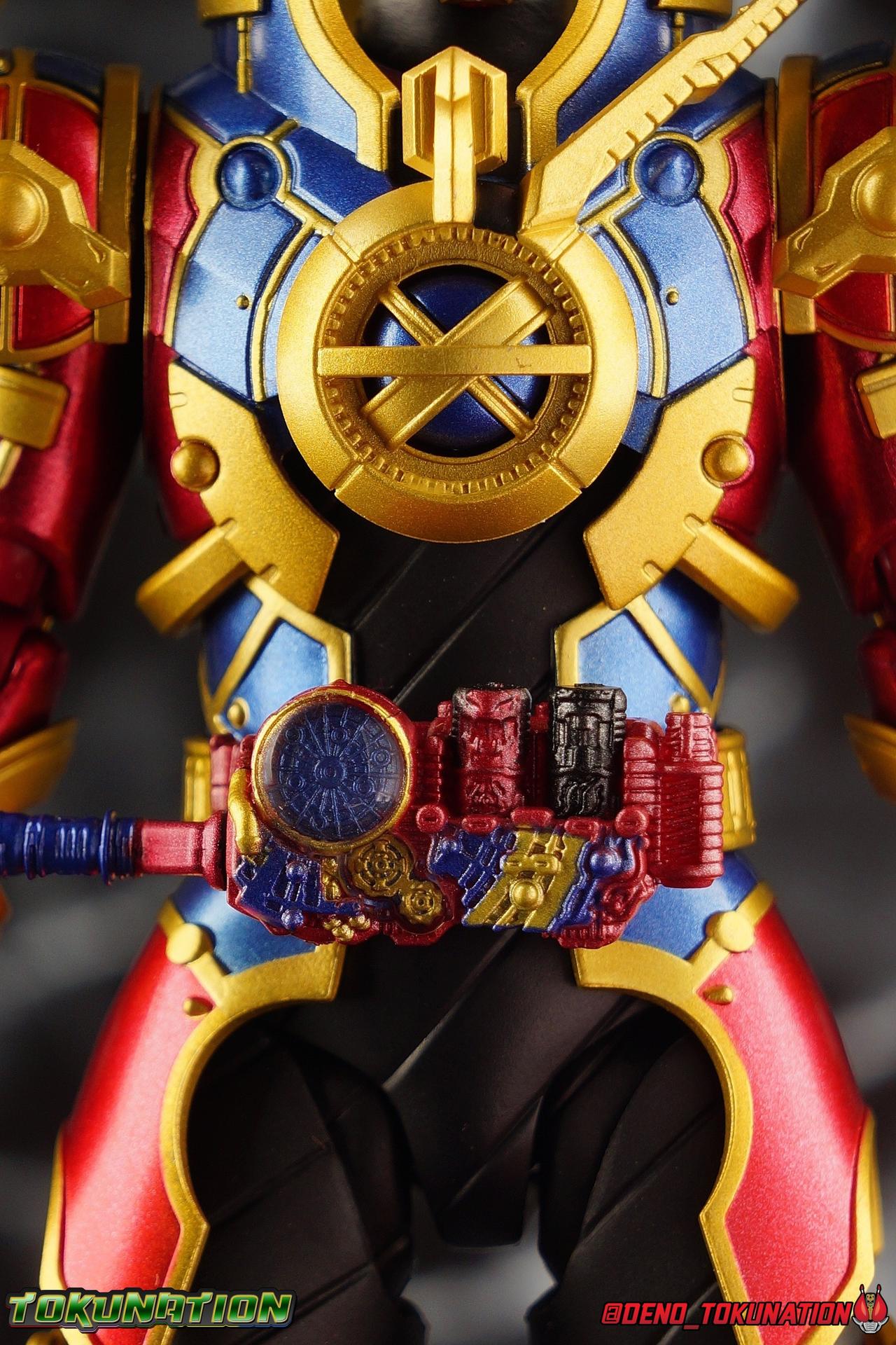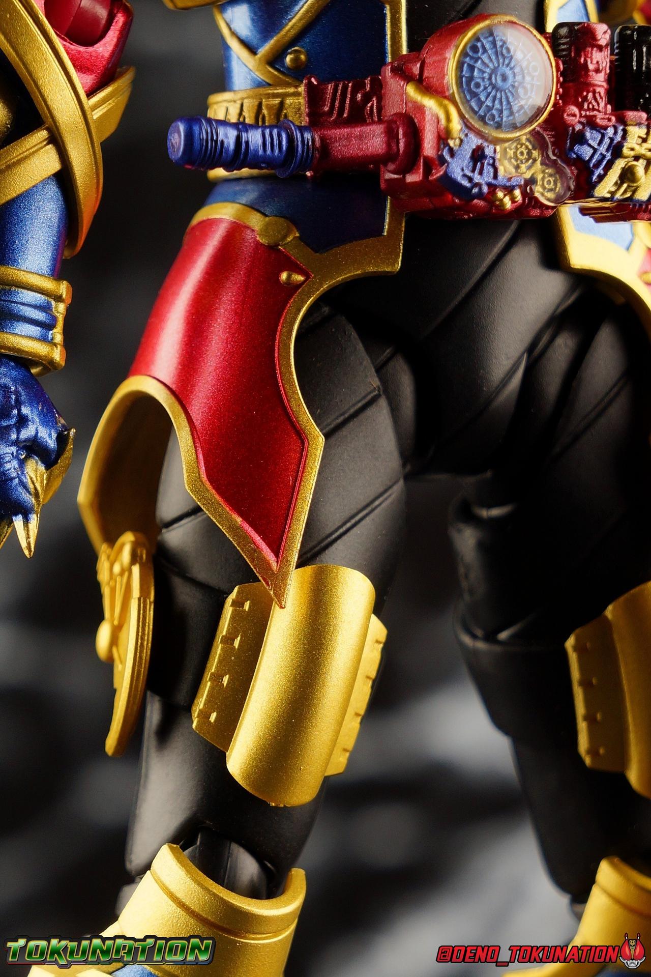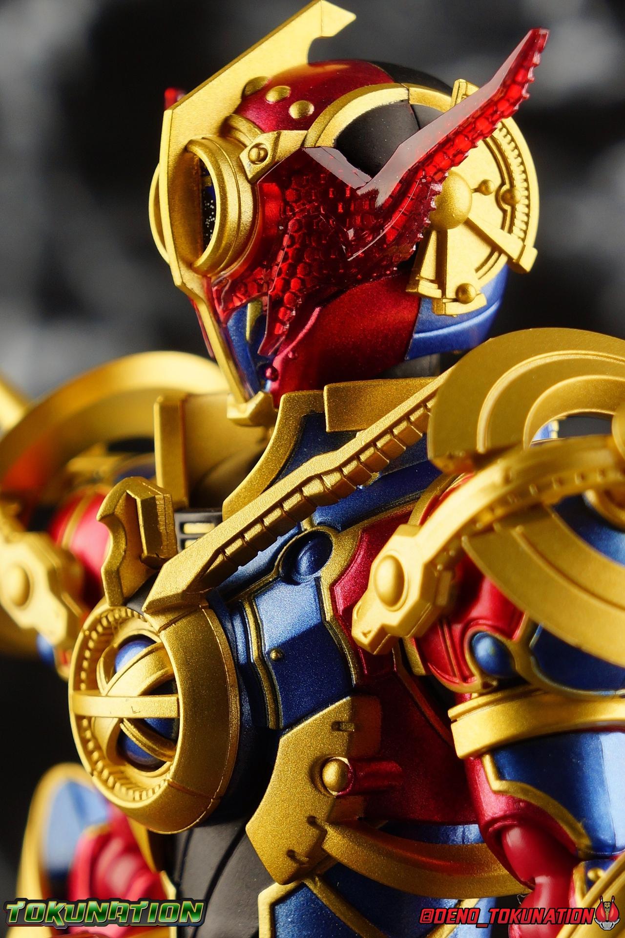 "Cobra! Dragon! Rabbit! Evolution!" Packaging Once more the two-tone packaging of the Build series returns. There isn't a ton of variety in this box design but it's aesthetically pleasing to line them all up together on my storage shelves. Evol's box, just by the nature of the red/blue color scheme does look very similar to Great Cross-Z, which is appropriate given the connections of the characters. And given that Evol is such a gorgeous suit, it's hard to argue with any of those stock photos adorning the box as well. Accessories This go around I'm doing my review a bit backwards so to speak. Instead of examining the figure first, then it's accessories, we'll do the parts first, then the forms we can create with them. 1 - set of Evol Dragon Form parts. This include the gorgeous Evol Dragon head, itself a more or less direct repack of the head that came with Great Cross-Z. The shade of red used here appears slightly darker, but that could vary figure to figure. We also get some new blue shoulder pads, again borrowed straight from Great Cross-Z. Finally we also get the Dragon Evol Bottle to use in the Evol Driver for this form. At this scale, some of the mechanical detailing of Evol's bottles can look a bit soft, but overall I think they've done a wonderful job. 1 - Set of Evol Rabbit Form parts. This includes another new head, itself a modification of the standard Build Rabbit/Tank head, just with a mirrored rabbit visor instead of an asymmetrical one. Evol's gold and blue lend themselves well to this head sculpt. The shoulder pads included are identical to builds, they're just both red this time with gold trim. I appreciate that in keeping with the diagonal design of the helmet, that the right shoulder pad also retains the triangular sculpt on both sides. To finish this form off we also have the included Rabbit Evol Bottle. 1 - Evol Bottle holster. Nigh identical to the bottle holsters the other riders in the line have come with, this one is really only necessary for a complete Phase 3/Evol Rabbit look. A holster appears on Evol's hip holding the Cobra & Dragon bottles after his second transformation into Phase 3. In the same episode that this occurs (38) the holster then disappears as Evol assumes his Black Hole form, and it's never actually seen again. As neither the Dragon nor Rabbit forms ever appear again after this set of episodes. So even including the holster with this figure at all was a nice extra touch that Tamashii really didn't have to do. 7 - additional hands. As expressive as Evolt/Evol/Blood Stalk is as a character, I'm really pleased by the hand selection here. 2 open expressive hands, 2 more relaxed waving type hands, 2 hands ostensibly for holding weapons or being used as a curled index finger come hither type of hand, and 1 right hand to grip the handle on the Evol Driver. Magnificent. This figure could have gone the easy way out. It could have been just Evol Cobra, and Tamashii could have milked out releases for the other two forms. Admittedly, I'd have still bought them like that too. I was tempted to buy 3 of this set just so that I could display all 3 forms, I'm still considering picking up 2 more to do just that. But the fact that everything came in one set as is, is just brilliant. Huge props to Tamashii for making that call and making this figure an all in one package. Below, you'll be able to read up on the cosmetic differences of the forms, and further below you can see the full gallery of them. Cobra Form "Evol, Phase 1." Of Evol's initial 3 forms, this is by far the most striking and stylish. Kamen Rider Build built (aha!) an incredibly rich world of characters and technology. The entire Rider system as well as offshoots like the Kaiser system, owe their existence to the original Evol Driver. Bearing that in mind, the earthly derivatives feel appropriately similar to each other from a design perspective. Whereas Evol feels absolutely alien, in absolutely all the right ways. Regal, ornate, deadly. I instantly fell in love with this suit when it appeared in show, and having it in figure form now the gorgeous details of it just jump right out at me again. Phase 1 is by far the most cohesive of the 3 forms, not to knock the other two, it's just that this flows a bit more naturally. The general astronomy theme as well as the cobra motif are a fantastic mix. Evol's body is criss-crossed by rings and lines that emulate astronomical equipment, I can't help but feel telescopes come into play in his design, but it's evident to me that an astrolabe is the primary inspiration for this suit. In any case let's move on to some of it's functionality. Though the design definitely looks foreign because of all the armor bits, at the core Evol uses the Build/Cross-Z leg design. This is mostly evident in the thighs but really the general shape of the leg is there, just contoured by new armor. Surprisingly the armor on the legs doesn't really affect how they function either. The ankles are about as good as they've always been, not outstanding by any measure, but decent enough to get good poses out of. Despite the overhang of armor on the bottom of the shin, and added bulk around the knee joint, both remain largely unrestricted as well. We run into issues when we get to the hanging skirt armor though. Evol has some pretty rocking thigh armor on the front and side that protrudes out from the body a bit, but it will occasionally hit the skirt. And unfortunately, having not learned from their Cronus mistake, the armor is thin rigid plastic on a rather limited hinge, so you'll have to fiddle with it somewhat to get the legs in and around that. So just be careful not to break anything. The legs can move, just not as much as I'd like. On his waist, Evol features the eponymous Evol Driver. This is basically the exact same Driver we got with Mad Rogue. The shade of red is a bit different but it's more or less identical. The difference here is Evol's very own Evol Bottles, the Cobra & Rid