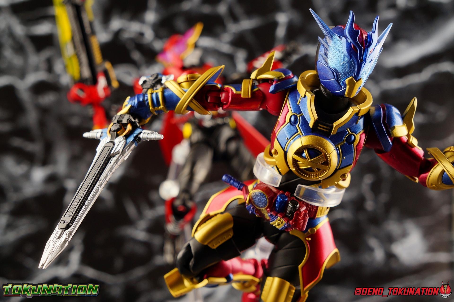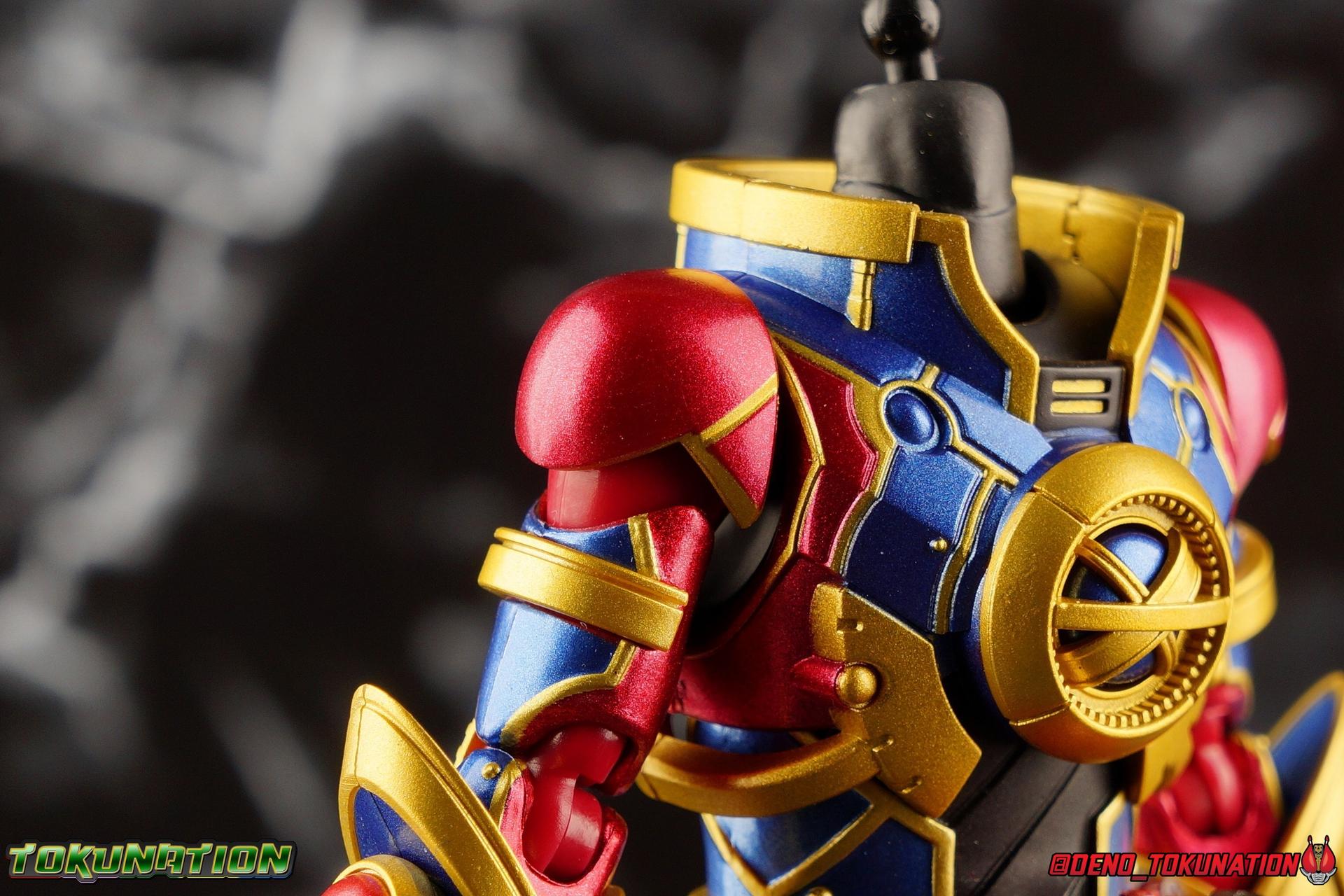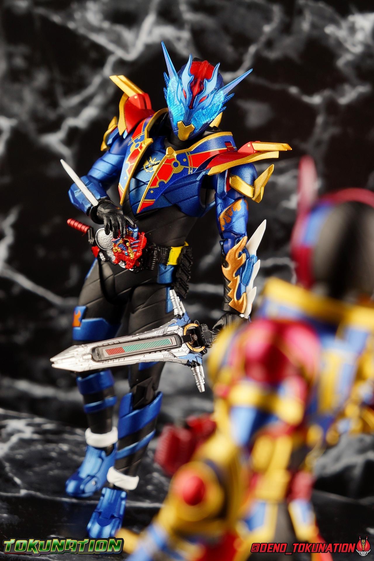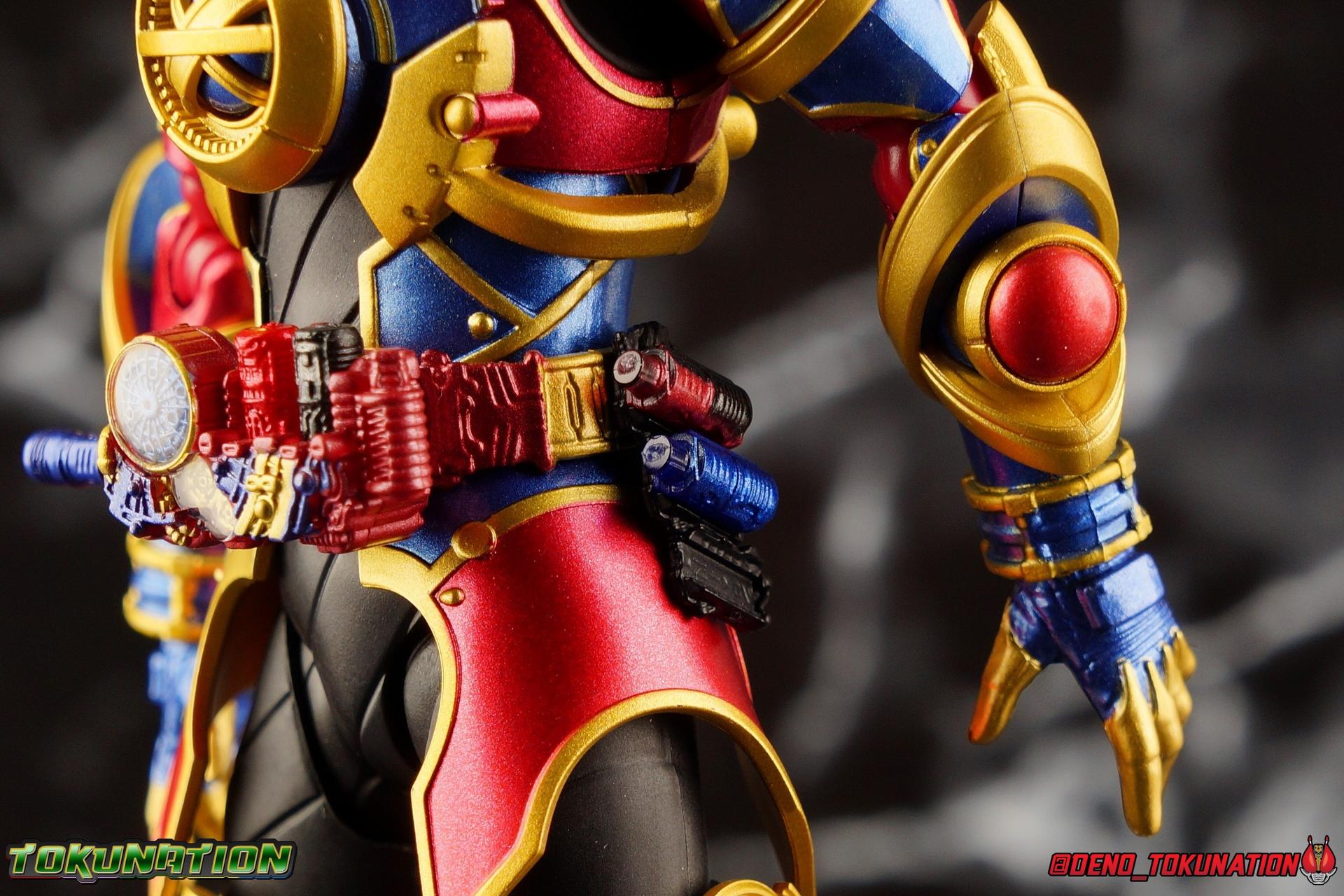 "Cobra! Dragon! Rabbit! Evolution!" Packaging Once more the two-tone packaging of the Build series returns. There isn't a ton of variety in this box design but it's aesthetically pleasing to line them all up together on my storage shelves. Evol's box, just by the nature of the red/blue color scheme does look very similar to Great Cross-Z, which is appropriate given the connections of the characters. And given that Evol is such a gorgeous suit, it's hard to argue with any of those stock photos adorning the box as well. Accessories This go around I'm doing my review a bit backwards so to speak. Instead of examining the figure first, then it's accessories, we'll do the parts first, then the forms we can create with them. 1 - set of Evol Dragon Form parts. This include the gorgeous Evol Dragon head, itself a more or less direct repack of the head that came with Great Cross-Z. The shade of red used here appears slightly darker, but that could vary figure to figure. We also get some new blue shoulder pads, again borrowed straight from Great Cross-Z. Finally we also get the Dragon Evol Bottle to use in the Evol Driver for this form. At this scale, some of the mechanical detailing of Evol's bottles can look a bit soft, but overall I think they've done a wonderful job. 1 - Set of Evol Rabbit Form parts. This includes another new head, itself a modification of the standard Build Rabbit/Tank head, just with a mirrored rabbit visor instead of an asymmetrical one. Evol's gold and blue lend themselves well to this head sculpt. The shoulder pads included are identical to builds, they're just both red this time with gold trim. I appreciate that in keeping with the diagonal design of the helmet, that the right shoulder pad also retains the triangular sculpt on both sides. To finish this form off we also have the included Rabbit Evol Bottle. 1 - Evol Bottle holster. Nigh identical to the bottle holsters the other riders in the line have come with, this one is really only necessary for a complete Phase 3/Evol Rabbit look. A holster appears on Evol's hip holding the Cobra & Dragon bottles after his second transformation into Phase 3. In the same episode that this occurs (38) the holster then disappears as Evol assumes his Black Hole form, and it's never actually seen again. As neither the Dragon nor Rabbit forms ever appear again after this set of episodes. So even including the holster with this figure at all was a nice extra touch that Tamashii really didn't have to do. 7 - additional hands. As expressive as Evolt/Evol/Blood Stalk is as a character, I'm really pleased by the hand selection here. 2 open expressive hands, 2 more relaxed waving type hands, 2 hands ostensibly for holding weapons or being used as a curled index finger come hither type of hand, and 1 right hand to grip the handle on the Evol Driver. Magnificent. This figure could have gone the easy way out. It could have been just Evol Cobra, and Tamashii could have milked out releases for the other two forms. Admittedly, I'd have still bought them like that too. I was tempted to buy 3 of this set just so that I could display all 3 forms, I'm still considering picking up 2 more to do just that. But the fact that everything came in one set as is, is just brilliant. Huge props to Tamashii for making that call and making this figure an all in one package. Below, you'll be able to read up on the cosmetic differences of the forms, and further below you can see the full gallery of them. Cobra Form "Evol, Phase 1." Of Evol's initial 3 forms, this is by far the most striking and stylish. Kamen Rider Build built (aha!) an incredibly rich world of characters and technology. The entire Rider system as well as offshoots like the Kaiser system, owe their existence to the original Evol Driver. Bearing that in mind, the earthly derivatives feel appropriately similar to each other from a design perspective. Whereas Evol feels absolutely alien, in absolutely all the right ways. Regal, ornate, deadly. I instantly fell in love with this suit when it appeared in show, and having it in figure form now the gorgeous details of it just jump right out at me again. Phase 1 is by far the most cohesive of the 3 forms, not to knock the other two, it's just that this flows a bit more naturally. The general astronomy theme as well as the cobra motif are a fantastic mix. Evol's body is criss-crossed by rings and lines that emulate astronomical equipment, I can't help but feel telescopes come into play in his design, but it's evident to me that an astrolabe is the primary inspiration for this suit. In any case let's move on to some of it's functionality. Though the design definitely looks foreign because of all the armor bits, at the core Evol uses the Build/Cross-Z leg design. This is mostly evident in the thighs but really the general shape of the leg is there, just contoured by new armor. Surprisingly the armor on the legs doesn't really affect how they function either. The ankles are about as good as they've always been, not outstanding by any measure, but decent enough to get good poses out of. Despite the overhang of armor on the bottom of the shin, and added bulk around the knee joint, both remain largely unrestricted as well. We run into issues when we get to the hanging skirt armor though. Evol has some pretty rocking thigh armor on the front and side that protrudes out from the body a bit, but it will occasionally hit the skirt. And unfortunately, having not learned from their Cronus mistake, the armor is thin rigid plastic on a rather limited hinge, so you'll have to fiddle with it somewhat to get the legs in and around that. So just be careful not to break anything. The legs can move, just not as much as I'd like. On his waist, Evol features the eponymous Evol Driver. This is basically the exact same Driver we got with Mad Rogue. The shade of red is a bit different but it's more or less identical. The difference here is Evol's very own Evol Bottles, the Cobra & Rid