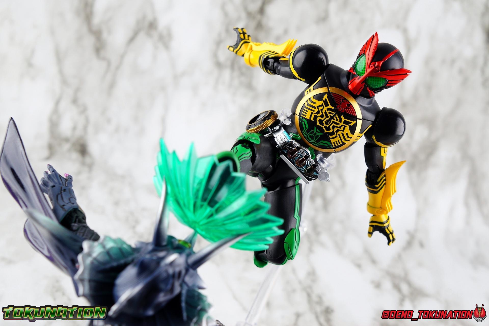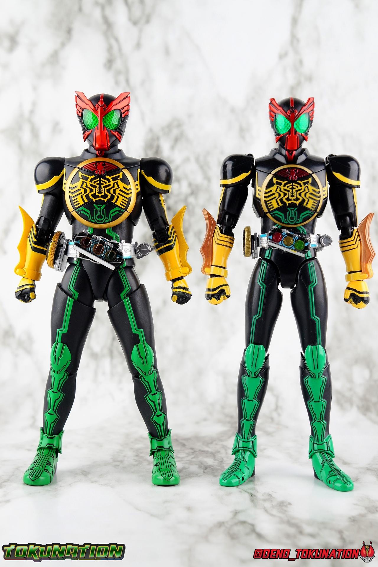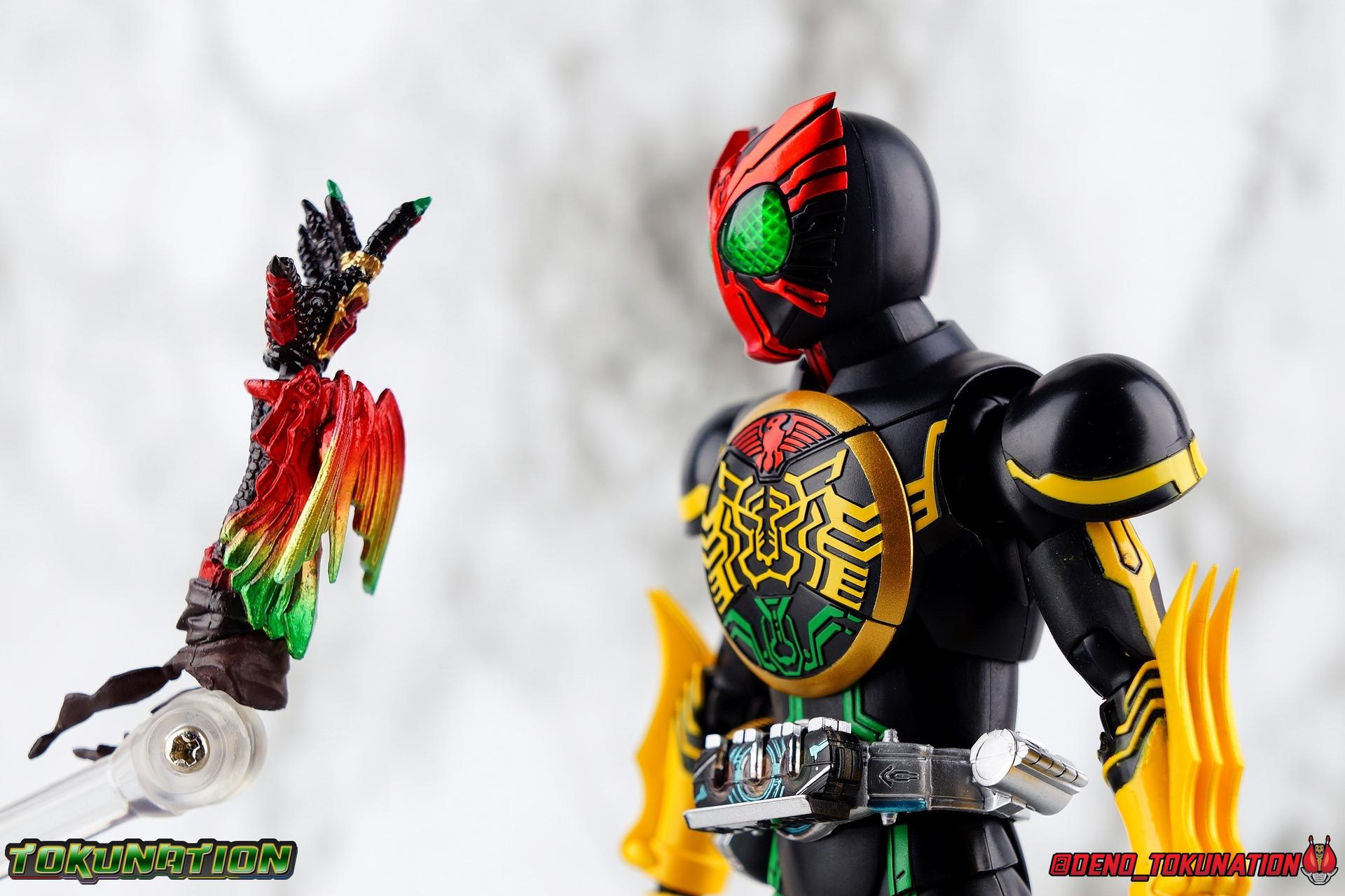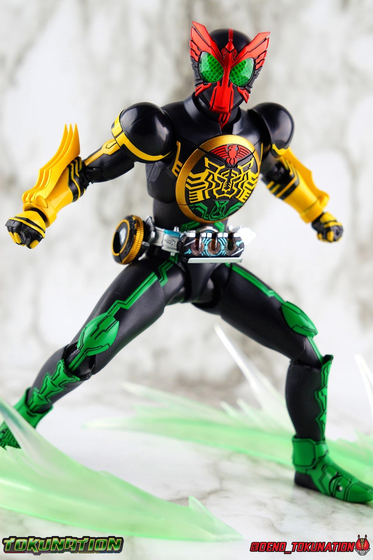 Long ago the King, the first OOO, instructed 4 alchemists to create life. Made from Core Medals these creatures, the Greeed, were filled with immense craving, unable to fill the voids within. Incapable of processing human emotions and senses, the Greeeds sought to consume the world of man to fill their sense of craving, but before they could they were sealed away by OOO. 800 years later, Eiji Hino was minding his own business as a part time security guard when the seal on the Greeed was broken, releasing them once more into the human world. Still craving to be whole, nothing could stand in their way without the power of the King. But one of their number, Ankh, took it upon himself to steal the Core Medals of his kind. Intending to find a human pawn, Ankh stumbles upon Eiji and a bond is born. Handing the Driver of the king and the Core Medals over, Ankh allows Eiji to become Kamen Rider OOO! What began as a begrudging alliance would spawn one of the greatest and truest friendships in Kamen Rider history, as the Greeed Ankh supported Eiji in his quest to save people wherever he could. Anything goes it's coming up OOO! Packaging Obviously, Seihou OOO comes in that familiar and collector friendly packaging this line has come to be known for. And it's quite the departure from what the original OOO line featured. It's much more subdued, which bothers me slightly, but it feels much sturdier and fits right in with an ever growing collection of Shinkocchou Seihou releases. As you can see in the gallery below, the two packaging types are very different, each with it's merits, but I welcome the change. Main Figure It's been quite a journey from the early days of the S.H. Figuarts toyline. Back in the day (2011) the original SHF Kamen Rider OOO TaToBa Combo was released, followed along eventually by every one of OOO other combos, and a variety of his mixed combo forms as well. Honestly it's astonishing how many OOO forms got Figuarts, but the mere fact that the 10 Main Combos from TV & Films happened is incredible. Flash forward to 2019 (though I'm getting to this review in 2020) and we're back to square one. Tamashii is finally treating us to a do-over for OOO, and giving us the figure we always hoped for. The original line was plagued by loose joints, gummy parts, inaccuracies, and more. Now, the Shinkocchou Seihou line is here to set things right. At a glance, there's no question, Shinkocchou Seihou OOO is absolutely an improvement in every single facet over the original figure. Let's start with the composition of the body. Seihou OOO goes the extra mile compared to the original by incorporating a Combo Change gimmick, hearkening back to the gimmick line of the show's day, aptly named Combo Change. Separating into Taka, Tora and Batta sections that means you'll be able to swap around the 3 components of the body between any of the current and future Seihou OOO releases. This is revolutionary, something I've always wanted to see Figuarts try more of. Though not as extensive as OOO, other recent releases have also begun to take on the form change aspect like Kamen Riders' Evol & Geiz Revive. What's really striking about the general look of the figure is it's proper proportions compared to the lanky and thin look of the original. Seihou OOO has all the beef of the actual suit, and so much more articulation than the previous release could have dreamed of. Each ankle has all the range necessary for OOO to get into his trademark wide stances, but it's really the double jointed knees that do a ton of the work. It's all about flexibility in the legs to make a figure feel dynamic, and no rider should feel more like that than OOO. The hips have that same genius sort of in set design type that Seihou's tend to have. The difference with OOO is that the Batta green markings extend up from the thigh across the separated hip joint and onto the waist. Each part can move independently so they may not always line up perfectly, but the attention to detail here is glorious, and the functionality far exceeds the limited range of the original figure's drop down hips. The black detailing on the green parts of the legs is crisp as well, but just rough enough to give it that ancient look that feels appropriate enough to be something from 800 years ago. And of course I'm a sucker for properly sculpted butt plates on riders, so I appreciate how the leg design doesn't take away from some correct anatomy. Around Eiji's waist, is the OOO Driver & Belt. I know the OOO Driver looks like it has a lot going on, but it's an incredibly well designed driver for this scale, even more so than some of my favorites like the Build Driver. The Driver in the center can accept the included 3 Core Medals or any other medals in the Seihou line, allowing you to fully and accurately recreate combo changes. A tool is included to remove and insert medals as you wish as well. The Driver can also tilt down to the figure's left accurately. On the left hip is a Cell Medal container, while the right hip has a holster for the included O Scanner. It's a bulky belt set up but one that feels undeniably perfect on a bulky body like OOO. Above the belt, at the point where OOO's chest emblem covers the torso, is where the figure can be taken apart. A firm plug holds the upper and lower torso together, but it's honestly the ingenious way the OOO emblem comes apart and un-pegs from the torso that blows my mind. While the head and neck can detached from the shoulders as one chunk. Even more astonishingly this entire gimmick doesn't impact the figure's design or articulation. Even the bottom section of the chest is hinged to move. It's just so satisfying all around. The emblem itself is exquisitely sculpted and painted as well. The arms are also a big attraction this go around for OOO. Far less gummy than the originals, these feel solid and extremely flexible. And that's in large part thanks to the hybrid shoulder pad design that incorporates them onto the arms