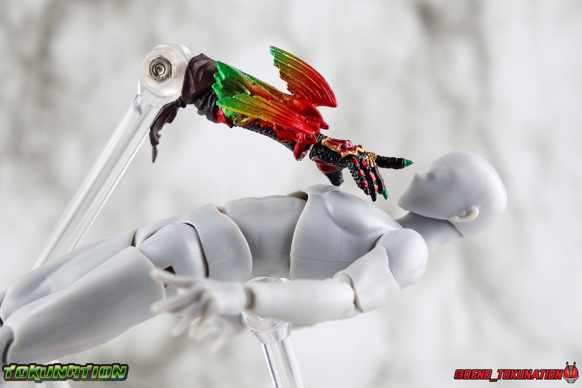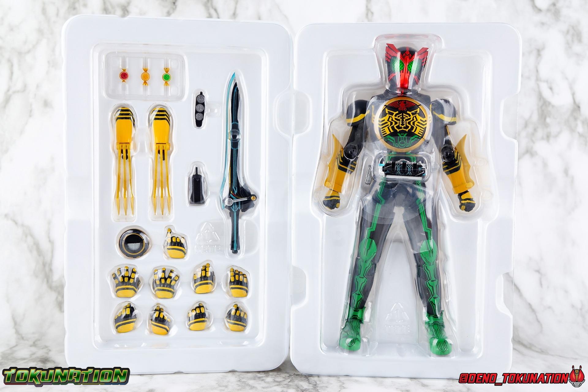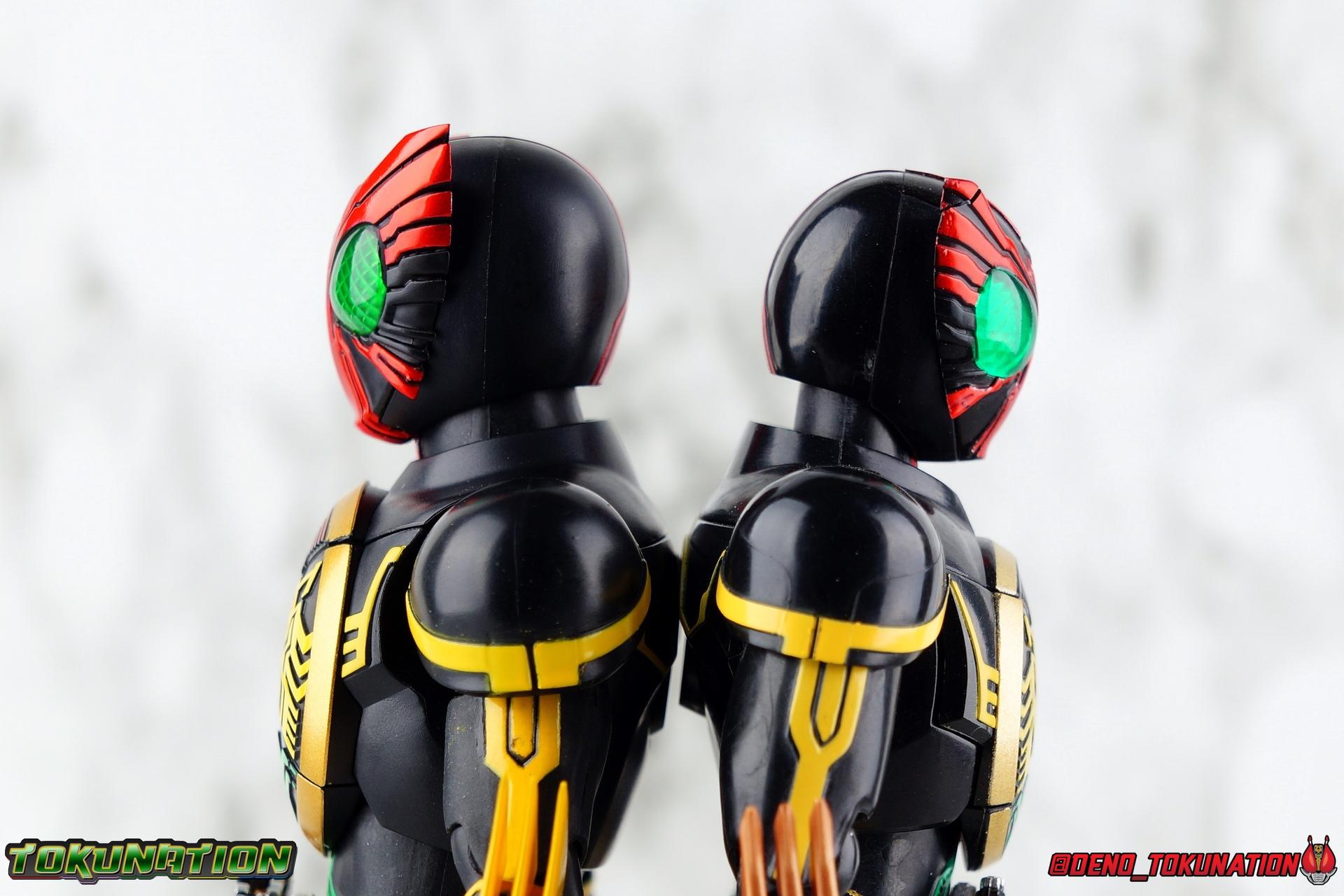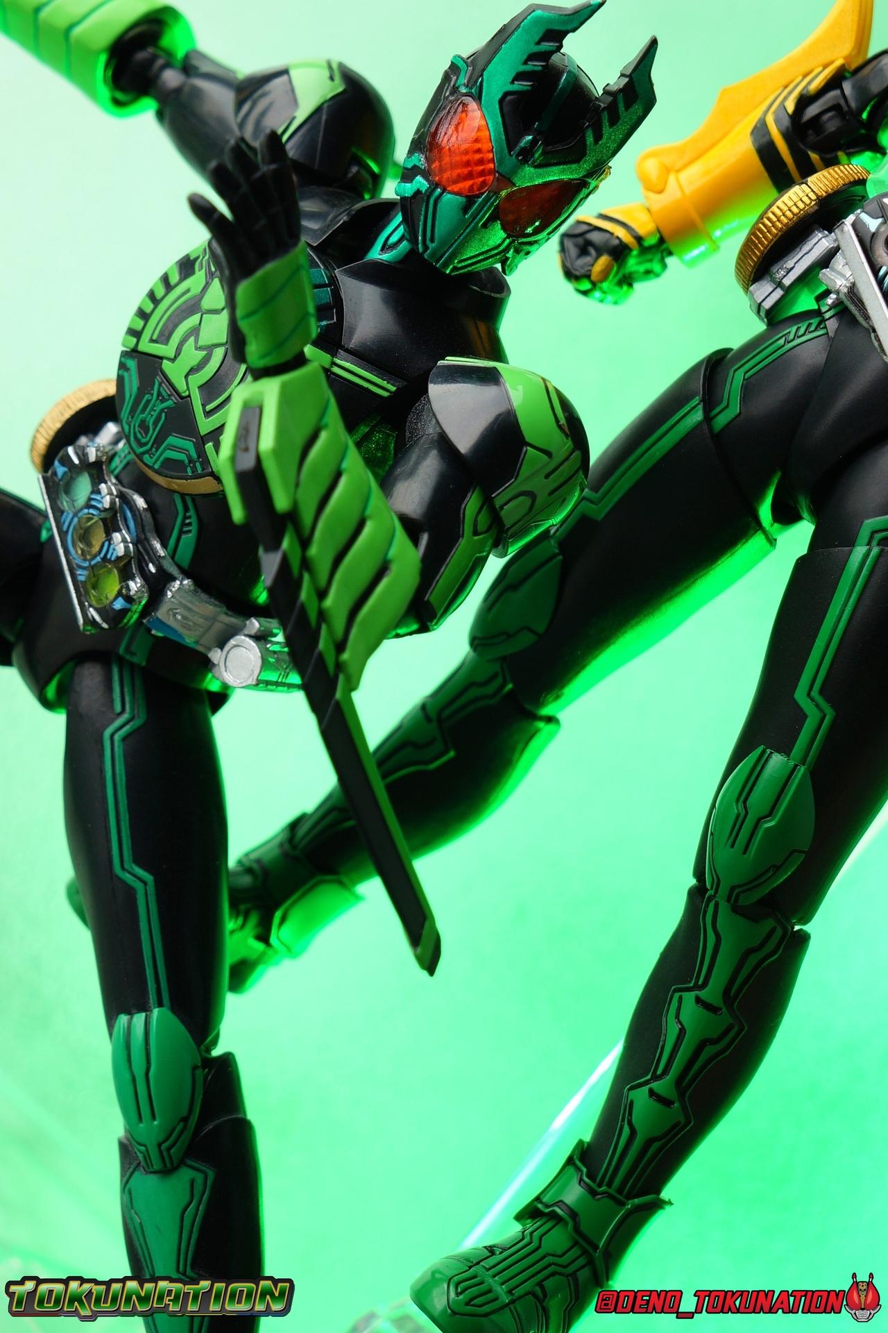 Long ago the King, the first OOO, instructed 4 alchemists to create life. Made from Core Medals these creatures, the Greeed, were filled with immense craving, unable to fill the voids within. Incapable of processing human emotions and senses, the Greeeds sought to consume the world of man to fill their sense of craving, but before they could they were sealed away by OOO. 800 years later, Eiji Hino was minding his own business as a part time security guard when the seal on the Greeed was broken, releasing them once more into the human world. Still craving to be whole, nothing could stand in their way without the power of the King. But one of their number, Ankh, took it upon himself to steal the Core Medals of his kind. Intending to find a human pawn, Ankh stumbles upon Eiji and a bond is born. Handing the Driver of the king and the Core Medals over, Ankh allows Eiji to become Kamen Rider OOO! What began as a begrudging alliance would spawn one of the greatest and truest friendships in Kamen Rider history, as the Greeed Ankh supported Eiji in his quest to save people wherever he could. Anything goes it's coming up OOO! Packaging Obviously, Seihou OOO comes in that familiar and collector friendly packaging this line has come to be known for. And it's quite the departure from what the original OOO line featured. It's much more subdued, which bothers me slightly, but it feels much sturdier and fits right in with an ever growing collection of Shinkocchou Seihou releases. As you can see in the gallery below, the two packaging types are very different, each with it's merits, but I welcome the change. Main Figure It's been quite a journey from the early days of the S.H. Figuarts toyline. Back in the day (2011) the original SHF Kamen Rider OOO TaToBa Combo was released, followed along eventually by every one of OOO other combos, and a variety of his mixed combo forms as well. Honestly it's astonishing how many OOO forms got Figuarts, but the mere fact that the 10 Main Combos from TV & Films happened is incredible. Flash forward to 2019 (though I'm getting to this review in 2020) and we're back to square one. Tamashii is finally treating us to a do-over for OOO, and giving us the figure we always hoped for. The original line was plagued by loose joints, gummy parts, inaccuracies, and more. Now, the Shinkocchou Seihou line is here to set things right. At a glance, there's no question, Shinkocchou Seihou OOO is absolutely an improvement in every single facet over the original figure. Let's start with the composition of the body. Seihou OOO goes the extra mile compared to the original by incorporating a Combo Change gimmick, hearkening back to the gimmick line of the show's day, aptly named Combo Change. Separating into Taka, Tora and Batta sections that means you'll be able to swap around the 3 components of the body between any of the current and future Seihou OOO releases. This is revolutionary, something I've always wanted to see Figuarts try more of. Though not as extensive as OOO, other recent releases have also begun to take on the form change aspect like Kamen Riders' Evol & Geiz Revive. What's really striking about the general look of the figure is it's proper proportions compared to the lanky and thin look of the original. Seihou OOO has all the beef of the actual suit, and so much more articulation than the previous release could have dreamed of. Each ankle has all the range necessary for OOO to get into his trademark wide stances, but it's really the double jointed knees that do a ton of the work. It's all about flexibility in the legs to make a figure feel dynamic, and no rider should feel more like that than OOO. The hips have that same genius sort of in set design type that Seihou's tend to have. The difference with OOO is that the Batta green markings extend up from the thigh across the separated hip joint and onto the waist. Each part can move independently so they may not always line up perfectly, but the attention to detail here is glorious, and the functionality far exceeds the limited range of the original figure's drop down hips. The black detailing on the green parts of the legs is crisp as well, but just rough enough to give it that ancient look that feels appropriate enough to be something from 800 years ago. And of course I'm a sucker for properly sculpted butt plates on riders, so I appreciate how the leg design doesn't take away from some correct anatomy. Around Eiji's waist, is the OOO Driver & Belt. I know the OOO Driver looks like it has a lot going on, but it's an incredibly well designed driver for this scale, even more so than some of my favorites like the Build Driver. The Driver in the center can accept the included 3 Core Medals or any other medals in the Seihou line, allowing you to fully and accurately recreate combo changes. A tool is included to remove and insert medals as you wish as well. The Driver can also tilt down to the figure's left accurately. On the left hip is a Cell Medal container, while the right hip has a holster for the included O Scanner. It's a bulky belt set up but one that feels undeniably perfect on a bulky body like OOO. Above the belt, at the point where OOO's chest emblem covers the torso, is where the figure can be taken apart. A firm plug holds the upper and lower torso together, but it's honestly the ingenious way the OOO emblem comes apart and un-pegs from the torso that blows my mind. While the head and neck can detached from the shoulders as one chunk. Even more astonishingly this entire gimmick doesn't impact the figure's design or articulation. Even the bottom section of the chest is hinged to move. It's just so satisfying all around. The emblem itself is exquisitely sculpted and painted as well. The arms are also a big attraction this go around for OOO. Far less gummy than the originals, these feel solid and extremely flexible. And that's in large part thanks to the hybrid shoulder pad design that incorporates them onto the arms