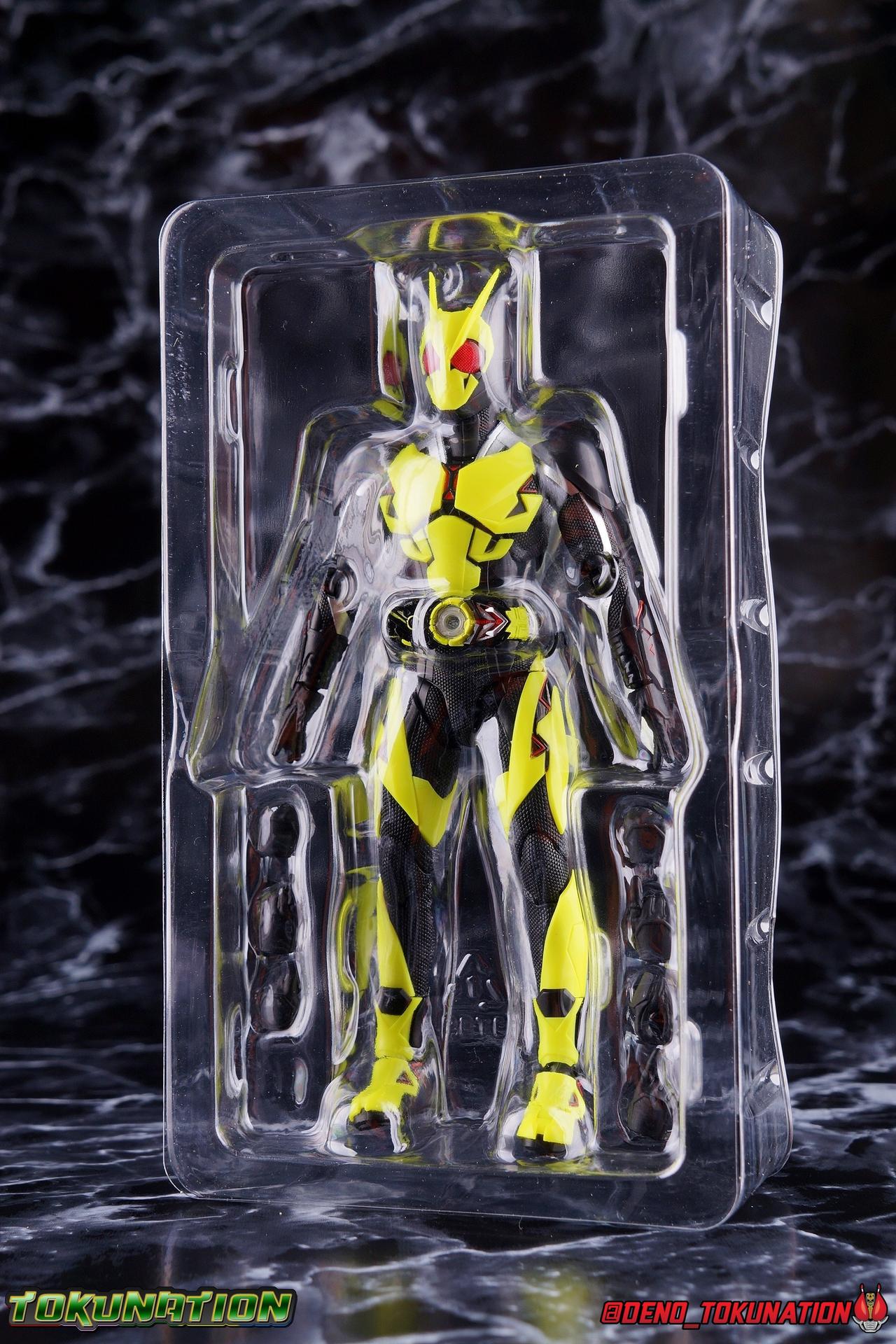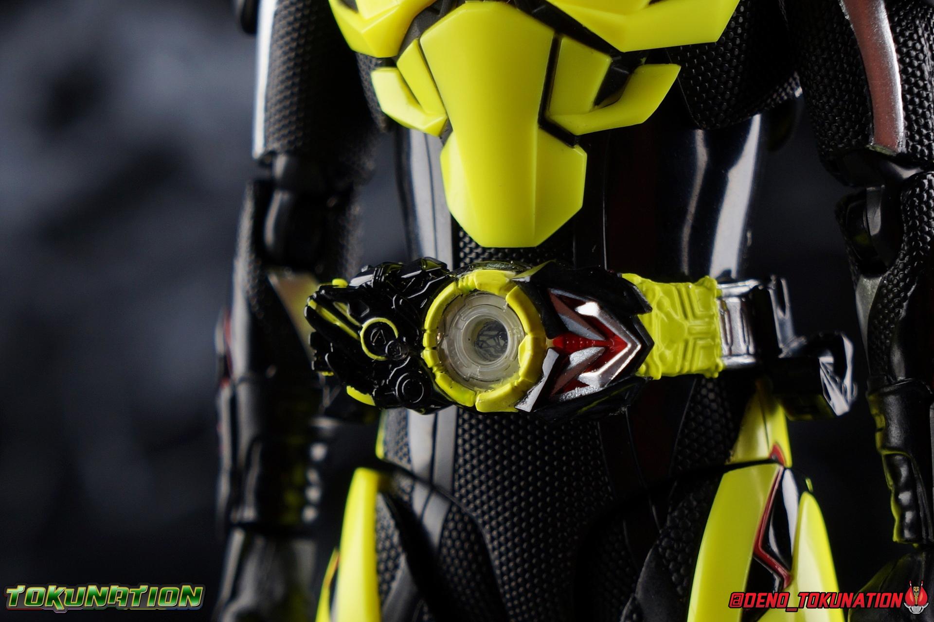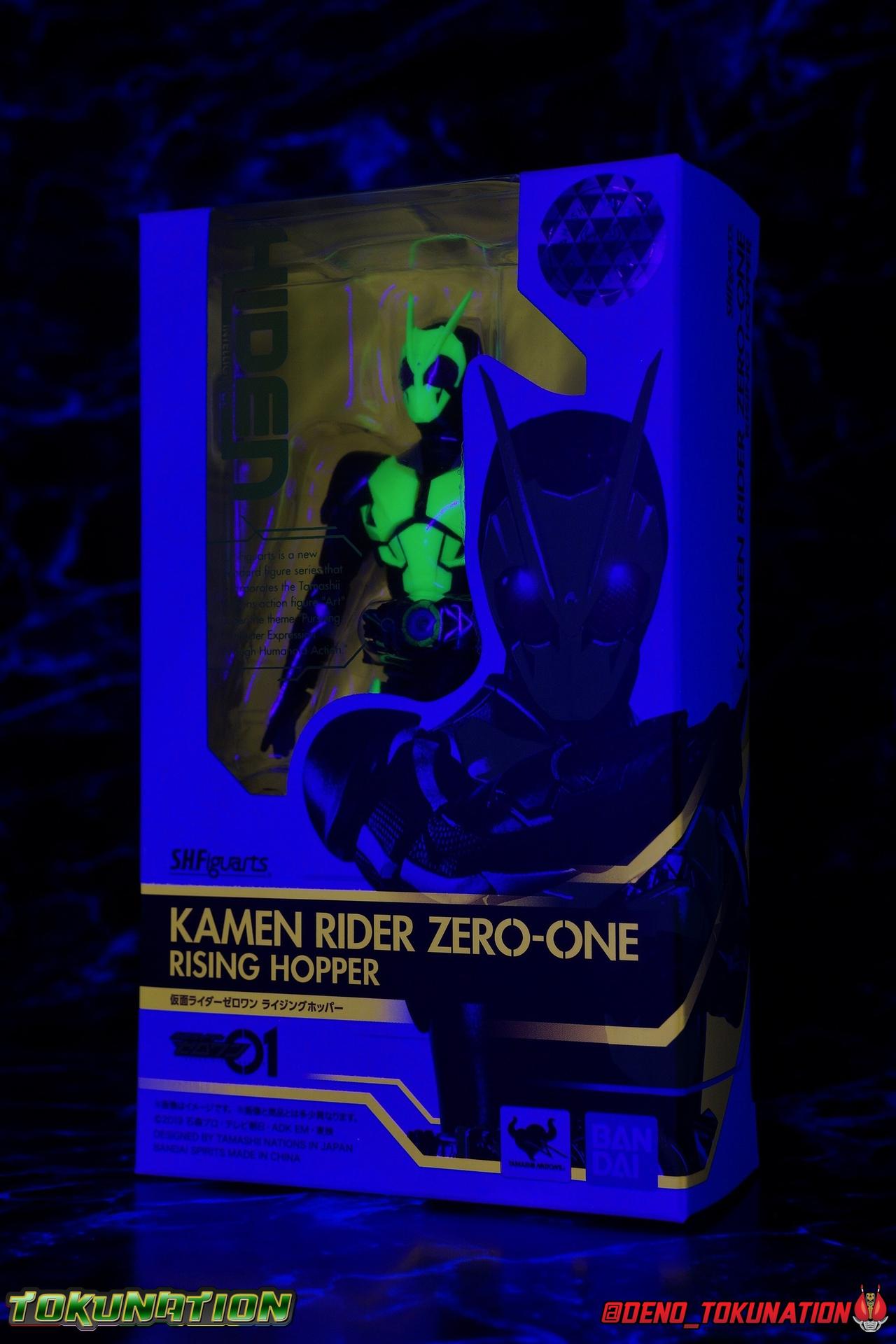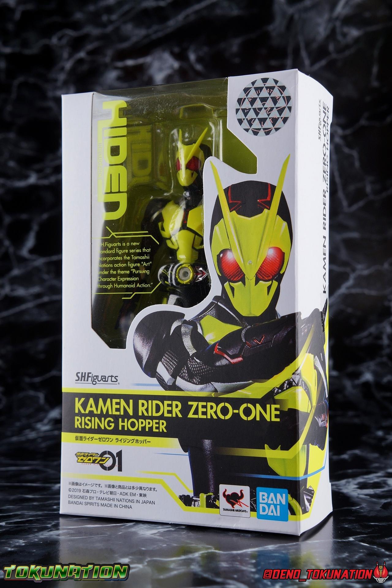 In a world where the life of the average human has been made easier by robotic helpers called Humagears, Hiden Intelligence is at the forefront of technological advancement. But with the passing of their founder, Korenosuke Hiden, the duties & responsibilities of president have passed on to his grandson, Aruto. Authorized to use the Progrise Keys & Zero-One Driver, this young man will fight to build a world where Humans & Humagers can coexist and smile together, as Kamen Rider Zero-One! "A jump to the sky turns to a rider kick." Packaging While it's hard to say that there have been any real innovations in Kamen Rider Figuart packaging in recent years physically, Zero-One's box does do something that's cosmetically pretty awesome. Emulating a feature present on the actual figure, the packaging features some black light reactive stripes that really glow brightly. It's a small touch but it ties in brilliantly with the actual figure. The box design itself is very reminiscent of Zero-One's own Rising Impact attack. And I always welcome the annual change in rider box designs, and this is no different. I'm super into it, and the blacklight lines are just an added bonus. Main Figure It's time once again to kick off a new line of Kamen Rider S.H. Figuarts! The Reiwa Era and the era of Zero-One himself have begun, and I must say that both are off to a stellar start. In terms of the television series, Zero-One has been a superb watch so far. While the show has been on a bit of a hiatus because of recent world events, I have to say I've been incredibly pleased watching it up to this point. I came onto this series a bit late, letting a backlog of episodes build up so I could marathon them later. If you haven't watched Zero-One yet I sincerely recommend it for it's optimistic view of the future and earnest protagonist as well as it's more than a little quirky and endearing villains. As for the figuart, I'm gonna start off by saying I give it my seal of approval as well. As with any new sub-line of rider figuarts, there's a certain level of expectation I have and depending on whether those expectations are met, it often frames how I'll feel about that series line of figures for years to come. Last year with Kamen Rider Zi-O I felt that while the figure was solid, it came up a bit short of what I would have liked, and the flaws of the mold carried through the rest of the line as well, dulling my impression of them subsequently. What Zero-One manages to do, is feel (from a sculpt perspective at the very least) like a Shinkocchou Seihou that's been tucked into the main series line. The entire sculpt rigorously recreates every detail of the actual suit as it appears in series. While I'm often floored by how good Kamen Rider figures can look at this scale and price point, Zero-One sets a new standard for his era. Zero-One's body is decked out in minute details. From the ground up it's a splendid recreation of the show costume. Starting with the feet, Zero-One has shoes that look an awful lot like actual sporty sneakers and function much the same, leaving the ankles from to fully rotate and angle pretty freely back and forth. While toe bends can be easily overlooked, in Zero-One's case it's a big solid joint with plenty of surface coverage for support. For the legs we get a magnificent backward bend in the knees giving us the ability to nearly lay the legs back parallel on itself. I really want to give a shout out to the textured details on the black parts of the legs, which also carry over to the waist upper body and arms. This detail is something that say in the early days of figuarts could have easily been overlooked and just done as glossy black plastic. And I adore that the knee joints and thigh swivels carry the detail over inside the joints making them appear seamless when posing. The thighs and hips themselves are also fantastically designed. While the hips are of the drop down variety, a kind I don't always like, these really are fantastic and and leave plenty of leeway for posing particularly with that thick raised thigh armor. Around the waist is the eponymous Hiden Zero-One Driver! About as functional as driver's of recent years, the Zero-One Driver is molded into the open position, ready to accept an open Progrise Key. On the right side of the driver is the Rise Slot where we get the Rising Hopper Progrise Key and it is removable, though it can't be folded shut. It's a bit sparsely detailed but what is present is quite nice. The middle of the driver has a small window within the reactor center that shows the Progrise Key currently inserted, another nice detail. Both the left & right hips feature Progrise Holders, which may seem a bit odd given that so far we don't actually have any closed Progrise Keys in the line to use with them. I'm almost certain we'll see some included with future releases. The upper body is another wonderful design. We get a complete 360 degree rotating waist joint, a floating upper body that can lean about 45 degrees to either side, and lots of room to arch the back though forward bends are slightly limited. Zero-One also features some stellar arms. Despite the low rounded shoulder pads, we get plenty of play in this joint thanks to the slide mechanism underneath. You can take advantage of it to angle the armor up over the main body and stretch the arms outward. There's a full 360 rotating bicep swivel, double jointed elbows and a great set of wrist ball joints. The arms may not do anything particularly new, but what they do accomplish makes them incredibly solid. This finally brings us to Zero-One's head. Not only is the sculpt dead on, but dare I say it, it's one of the best articulated rider SHF heads I've ever seen. The neck (itself ball jointed) is set into the chest between the silver clavicle parts. While this piece may not have full movement side to side, it can move, more importantly it can angle forward and back very well. The best part of this design is the tha