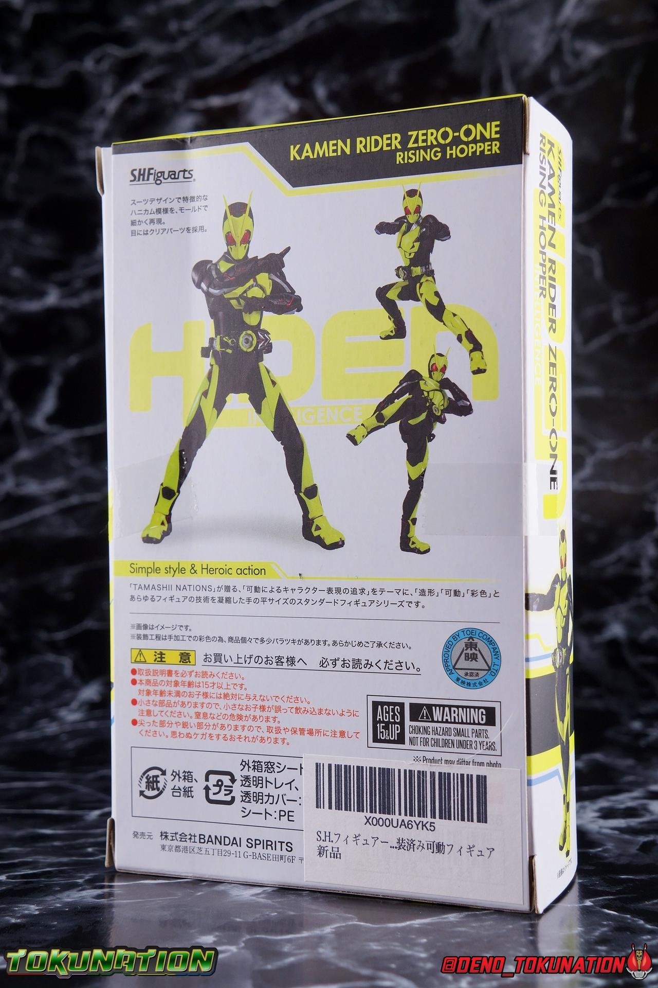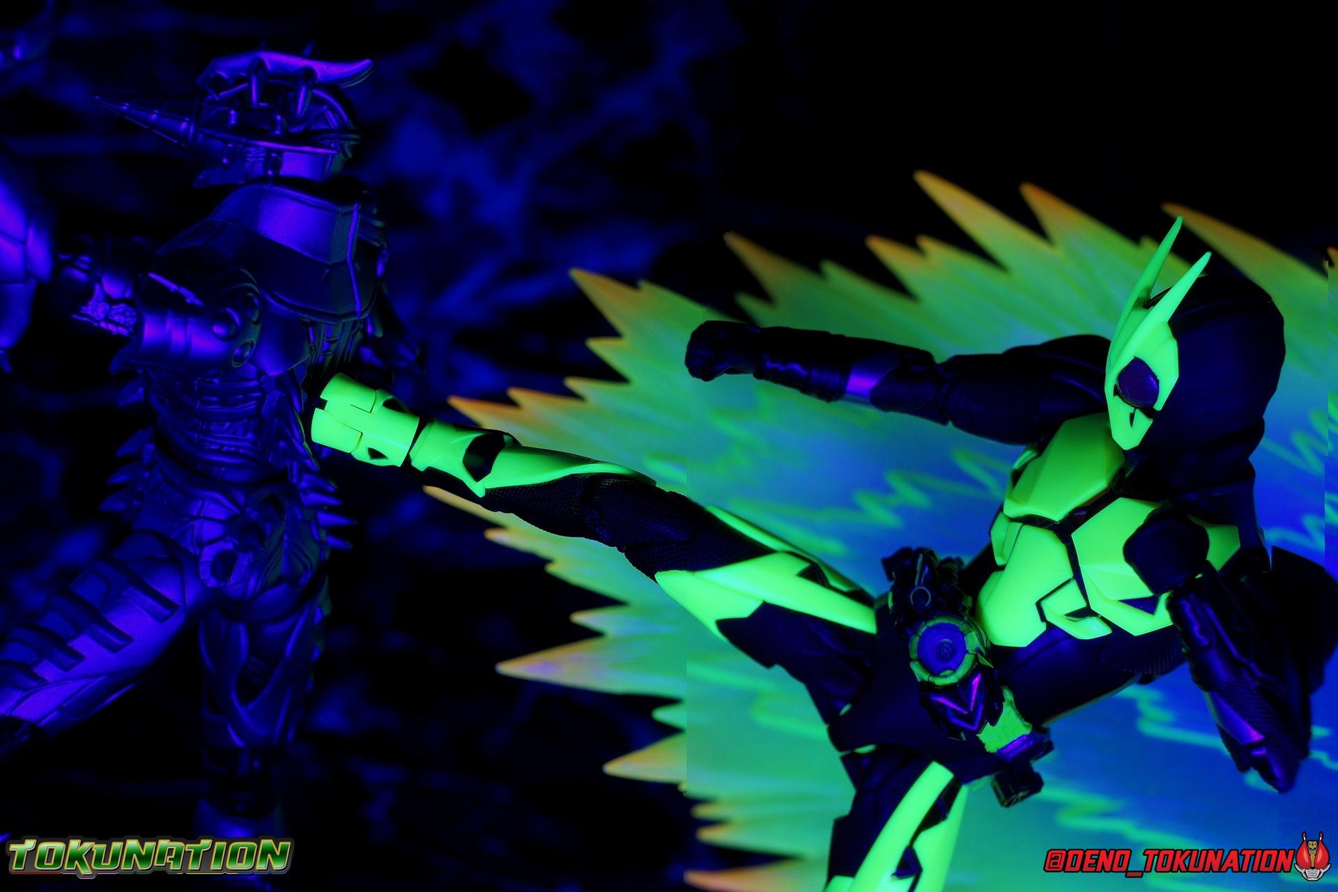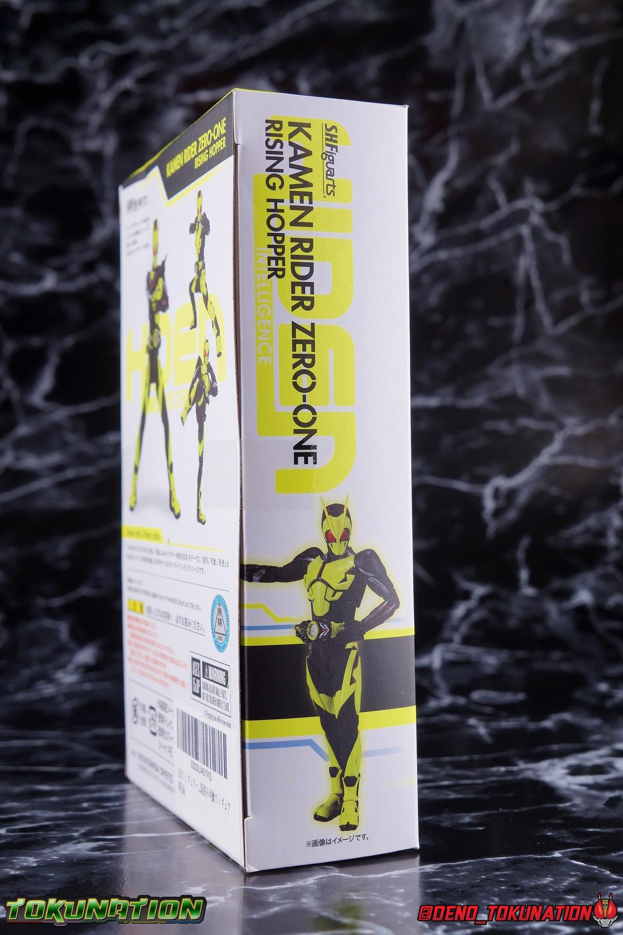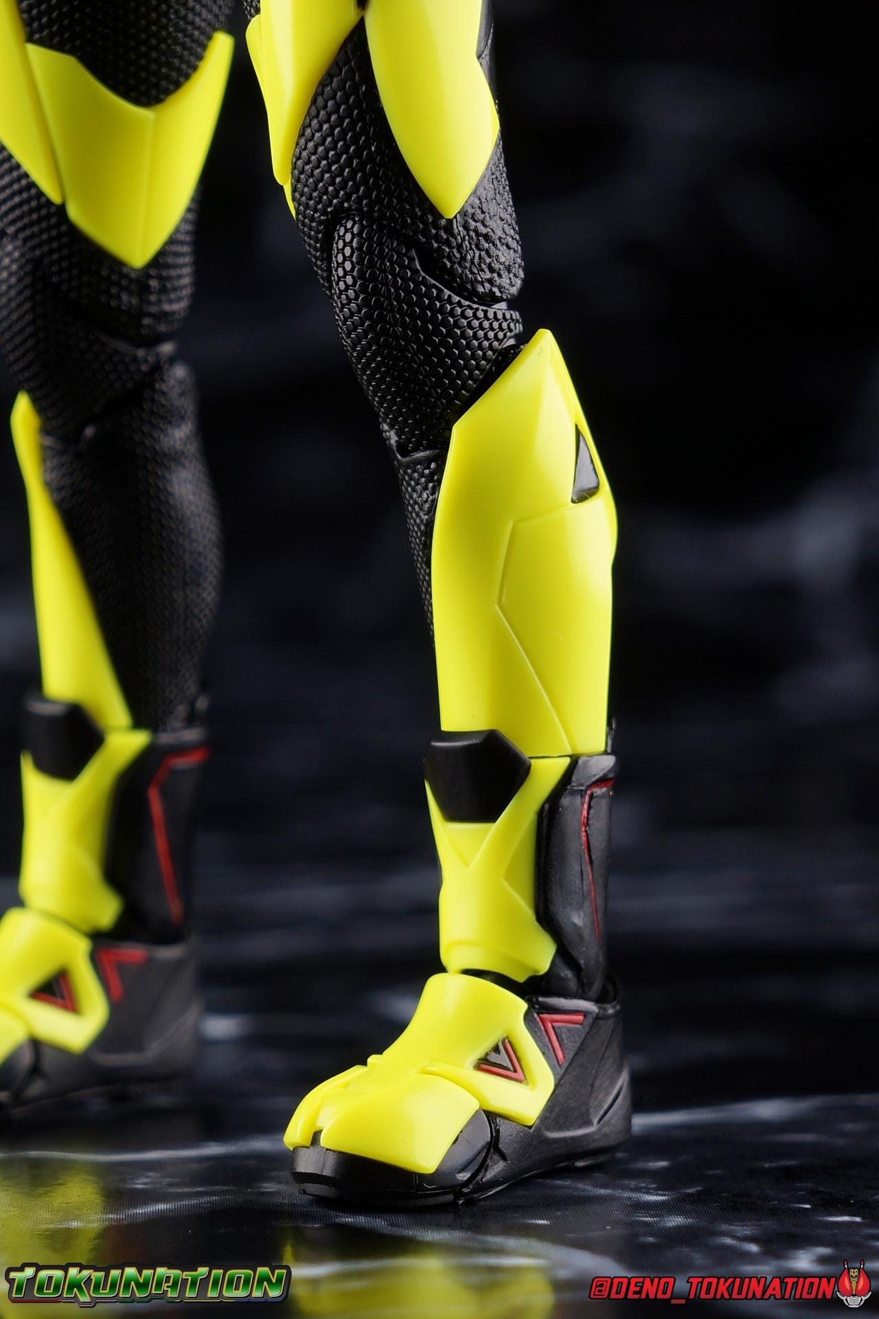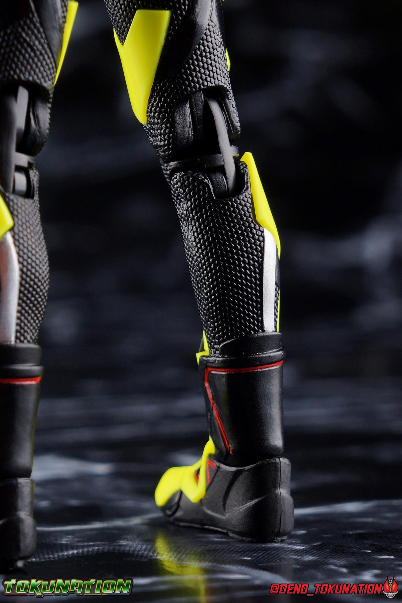 In a world where the life of the average human has been made easier by robotic helpers called Humagears, Hiden Intelligence is at the forefront of technological advancement. But with the passing of their founder, Korenosuke Hiden, the duties & responsibilities of president have passed on to his grandson, Aruto. Authorized to use the Progrise Keys & Zero-One Driver, this young man will fight to build a world where Humans & Humagers can coexist and smile together, as Kamen Rider Zero-One! "A jump to the sky turns to a rider kick." Packaging While it's hard to say that there have been any real innovations in Kamen Rider Figuart packaging in recent years physically, Zero-One's box does do something that's cosmetically pretty awesome. Emulating a feature present on the actual figure, the packaging features some black light reactive stripes that really glow brightly. It's a small touch but it ties in brilliantly with the actual figure. The box design itself is very reminiscent of Zero-One's own Rising Impact attack. And I always welcome the annual change in rider box designs, and this is no different. I'm super into it, and the blacklight lines are just an added bonus. Main Figure It's time once again to kick off a new line of Kamen Rider S.H. Figuarts! The Reiwa Era and the era of Zero-One himself have begun, and I must say that both are off to a stellar start. In terms of the television series, Zero-One has been a superb watch so far. While the show has been on a bit of a hiatus because of recent world events, I have to say I've been incredibly pleased watching it up to this point. I came onto this series a bit late, letting a backlog of episodes build up so I could marathon them later. If you haven't watched Zero-One yet I sincerely recommend it for it's optimistic view of the future and earnest protagonist as well as it's more than a little quirky and endearing villains. As for the figuart, I'm gonna start off by saying I give it my seal of approval as well. As with any new sub-line of rider figuarts, there's a certain level of expectation I have and depending on whether those expectations are met, it often frames how I'll feel about that series line of figures for years to come. Last year with Kamen Rider Zi-O I felt that while the figure was solid, it came up a bit short of what I would have liked, and the flaws of the mold carried through the rest of the line as well, dulling my impression of them subsequently. What Zero-One manages to do, is feel (from a sculpt perspective at the very least) like a Shinkocchou Seihou that's been tucked into the main series line. The entire sculpt rigorously recreates every detail of the actual suit as it appears in series. While I'm often floored by how good Kamen Rider figures can look at this scale and price point, Zero-One sets a new standard for his era. Zero-One's body is decked out in minute details. From the ground up it's a splendid recreation of the show costume. Starting with the feet, Zero-One has shoes that look an awful lot like actual sporty sneakers and function much the same, leaving the ankles from to fully rotate and angle pretty freely back and forth. While toe bends can be easily overlooked, in Zero-One's case it's a big solid joint with plenty of surface coverage for support. For the legs we get a magnificent backward bend in the knees giving us the ability to nearly lay the legs back parallel on itself. I really want to give a shout out to the textured details on the black parts of the legs, which also carry over to the waist upper body and arms. This detail is something that say in the early days of figuarts could have easily been overlooked and just done as glossy black plastic. And I adore that the knee joints and thigh swivels carry the detail over inside the joints making them appear seamless when posing. The thighs and hips themselves are also fantastically designed. While the hips are of the drop down variety, a kind I don't always like, these really are fantastic and and leave plenty of leeway for posing particularly with that thick raised thigh armor. Around the waist is the eponymous Hiden Zero-One Driver! About as functional as driver's of recent years, the Zero-One Driver is molded into the open position, ready to accept an open Progrise Key. On the right side of the driver is the Rise Slot where we get the Rising Hopper Progrise Key and it is removable, though it can't be folded shut. It's a bit sparsely detailed but what is present is quite nice. The middle of the driver has a small window within the reactor center that shows the Progrise Key currently inserted, another nice detail. Both the left & right hips feature Progrise Holders, which may seem a bit odd given that so far we don't actually have any closed Progrise Keys in the line to use with them. I'm almost certain we'll see some included with future releases. The upper body is another wonderful design. We get a complete 360 degree rotating waist joint, a floating upper body that can lean about 45 degrees to either side, and lots of room to arch the back though forward bends are slightly limited. Zero-One also features some stellar arms. Despite the low rounded shoulder pads, we get plenty of play in this joint thanks to the slide mechanism underneath. You can take advantage of it to angle the armor up over the main body and stretch the arms outward. There's a full 360 rotating bicep swivel, double jointed elbows and a great set of wrist ball joints. The arms may not do anything particularly new, but what they do accomplish makes them incredibly solid. This finally brings us to Zero-One's head. Not only is the sculpt dead on, but dare I say it, it's one of the best articulated rider SHF heads I've ever seen. The neck (itself ball jointed) is set into the chest between the silver clavicle parts. While this piece may not have full movement side to side, it can move, more importantly it can angle forward and back very well. The best part of this design is the tha