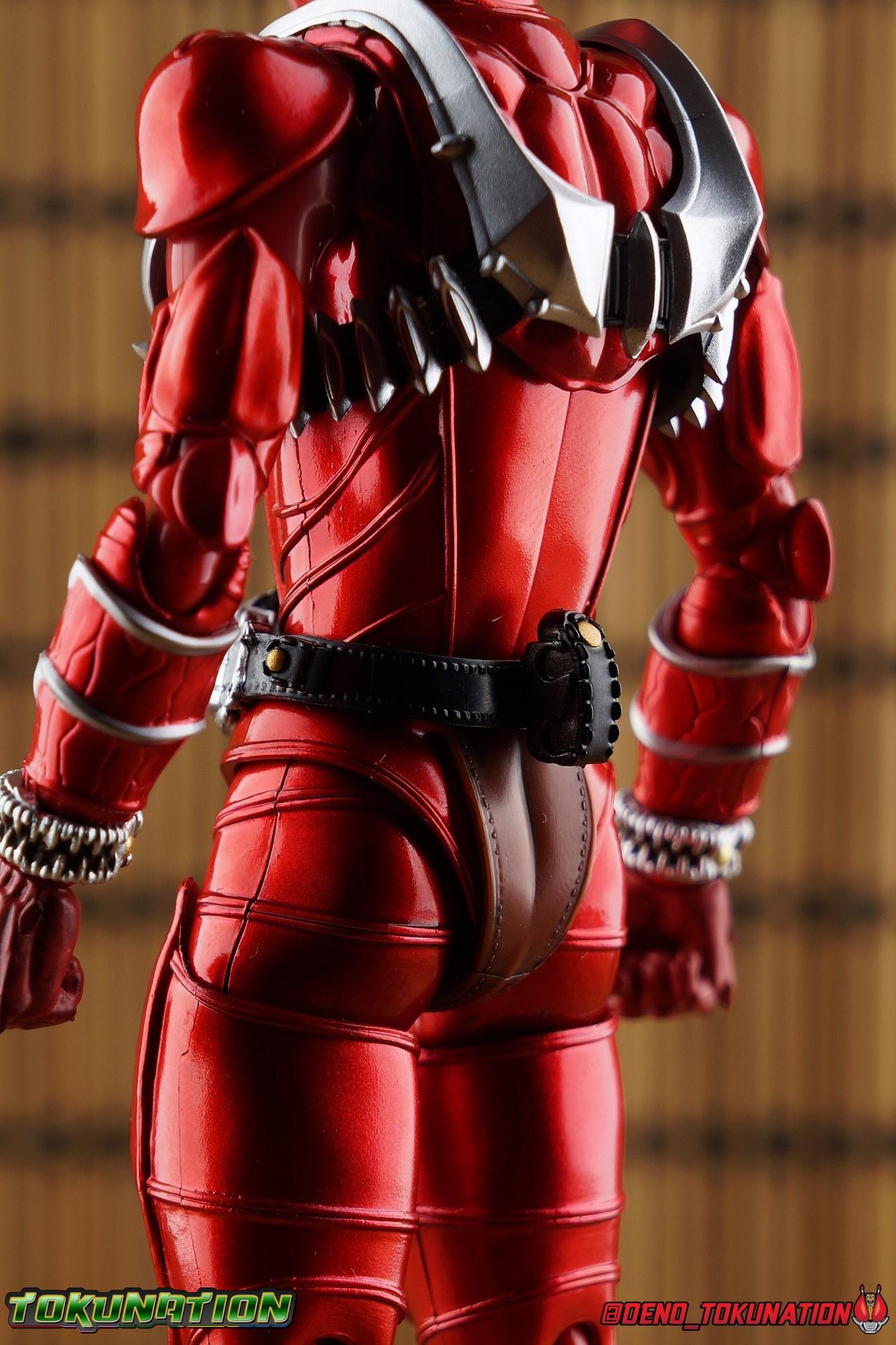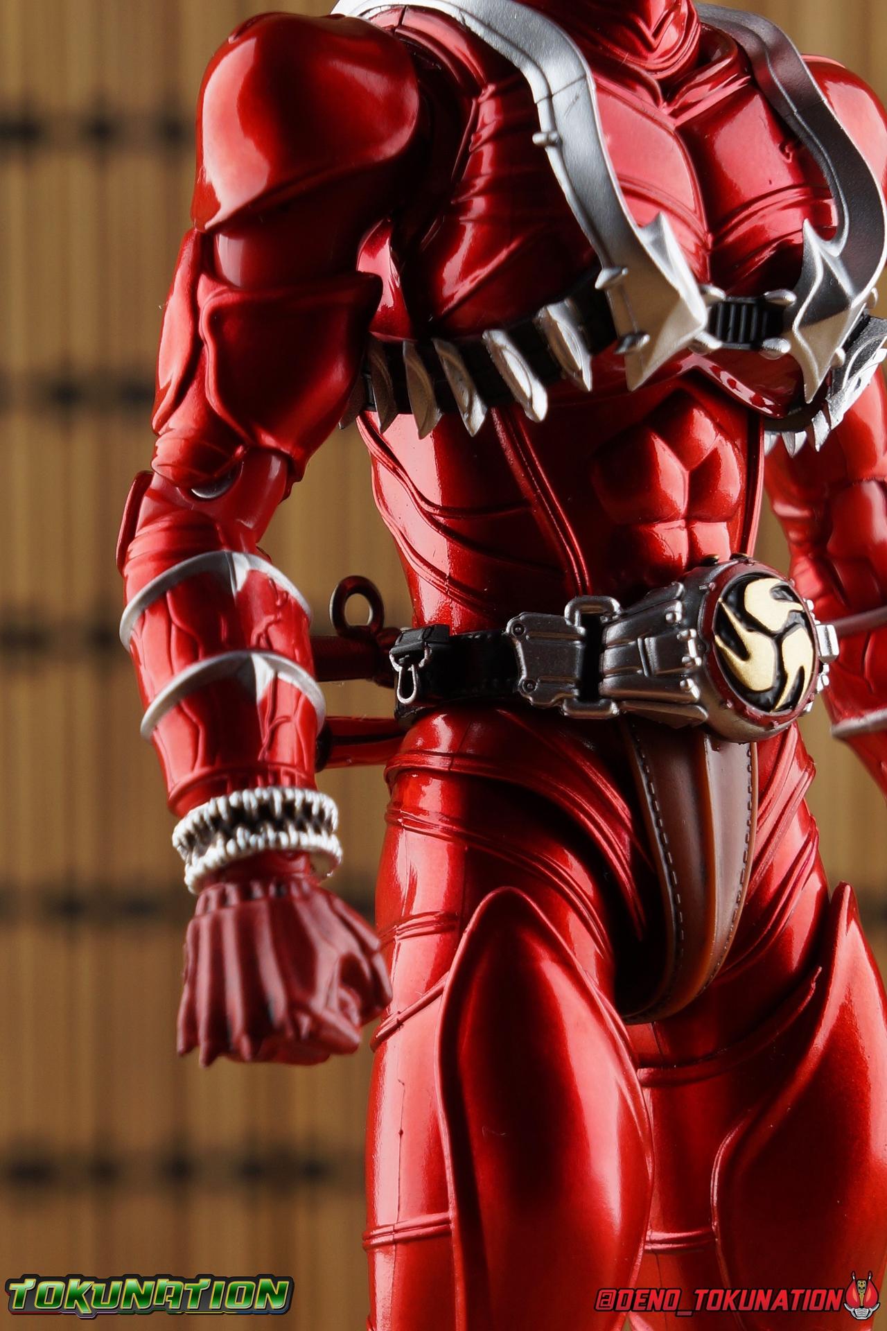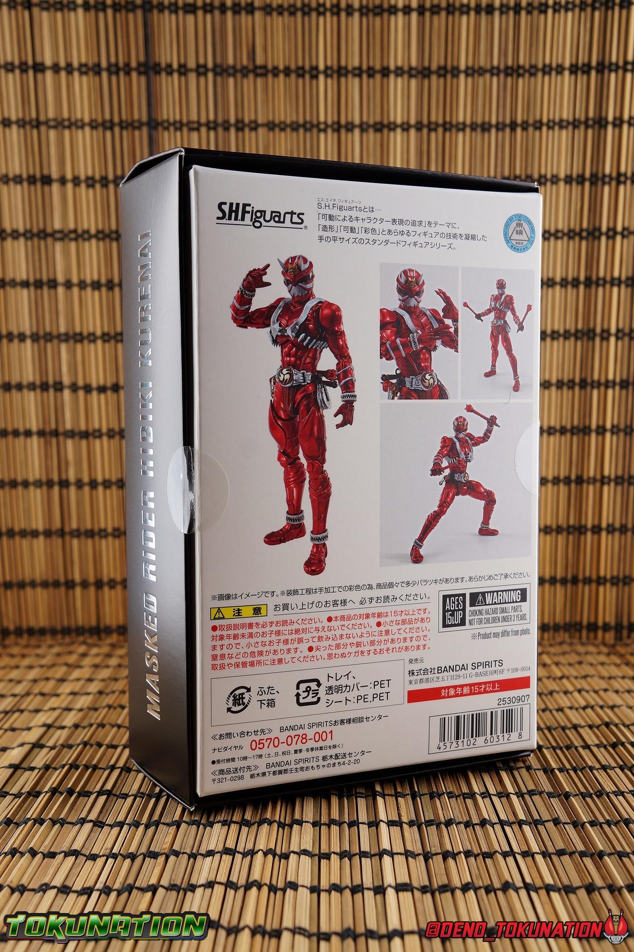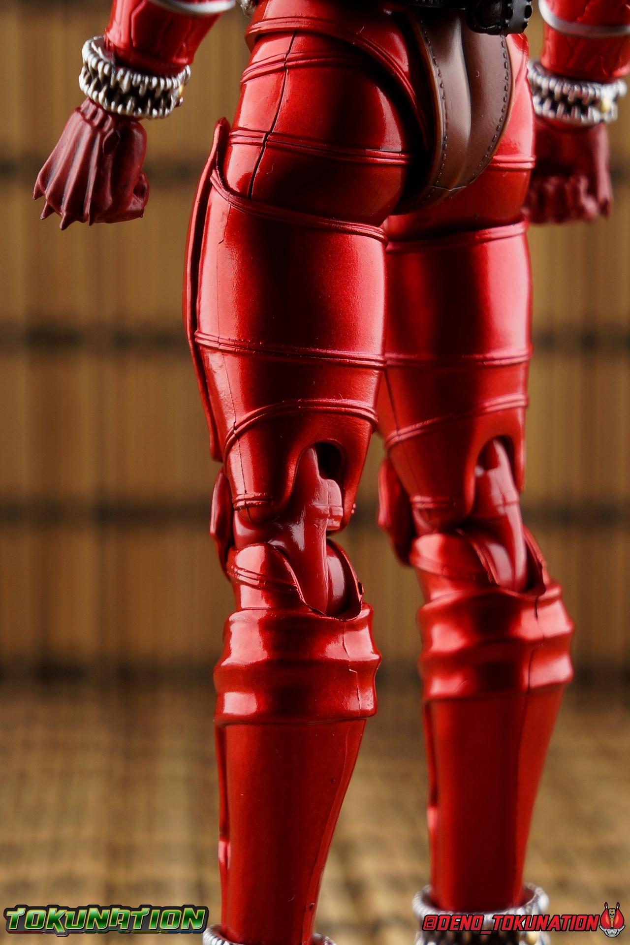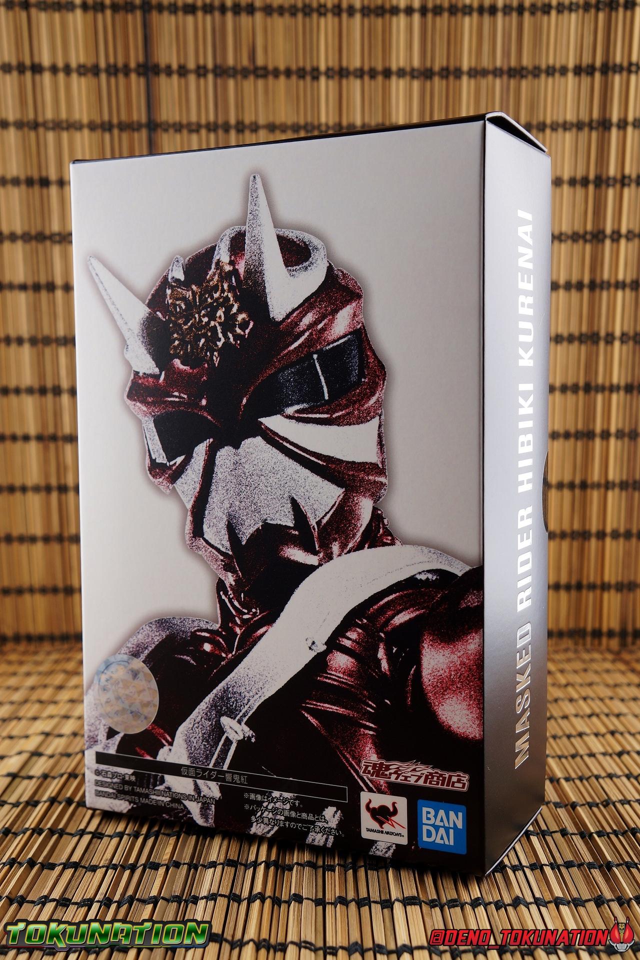 It is the Summer of Training. And while mentoring Todoroki's inconsistent practice of the Taiko drum, and even bestowing the Ongekibou to both Todoroki & Ibuki, Kamen Rider Hibiki furiously trains himself. Faster, stronger, hotter. Burning brighter than he ever has before, Hibiki must master the rhythm of his core once again and draw out the full potential of his Ongekibou. Without this strength, the deadly Dorotabou will continue to multiply, wreaking havoc on the local villages. With a fire of strength raging in his heart, Hibiki explodes into a new form, Kamen Rider Hibiki Kurenai! Packaging Hibiki Kurenai comes in that familiar and collector friendly packaging this line has come to be known for. No massive changes here even from the first Seihou Hibiki release from 6 years ago, the only differenes here being the stock imagery and the front facing portrait. It's a stylish box type even if it feels a little bit more stale each time. I do appreciate when they change things up more with releases like Ankh, Den-O, & Kiba. Main Figure Obviously, Shinkocchou Seihou Hibiki was one of the first figures of the entire Seihou line, predated only by Kabuto. So it's great to see that just over 6 years later, that this fantastic mold has returned to the line with this explosive form. The 3 previous releases in the Hibiki line, Ibuki Todoroki & Zanki, were all magnificent and brought something new and unique to this body type. At their core each shares the basic body structure that Hibiki pioneered. With Hibiki Kurenai though, we finally circle back around the to original tooling of the mold. It's hard to say anything new about the mold itself. As I've gone into on 4 occasions now reviewing Hibiki releases, this is a stellar figure. Each iteration of the mold looks like a suit that's just walked off screen. Of the entire Seihou line, I think the Oni Riders by far look the most gorgeous and lifelike. I'll get into the usual in's and out's of the articulation scheme soon, but first I want to focus on the stunning paint apps on this beauty. The entire figure is decked out in a gorgeous metallic red in the same fashion as that metallic purple of the original release. The paint apps to the core body are largely the only change we see as well, though there are some additional red paint apps on the upper forearms giving them a uniform red look, and some new apps on the head giving Hibiki a much needed visor and mouth plate that really bring the design together. As always Tamashii's attention to detail is jaw dropping. Below we'll get into the articulation this mold has always boasted, but it won't be terribly different from my previous breakdowns of the Hibiki Riders. Feel free to skip down if you wish. The sculpt of this body type really brings to life these unique Oni Rider suits. In every way imaginable it captures the look of the on screen suit right down to the textured musculature, and the gloss of the armor really gives in that pleather/vinyl feel of an actual suit. The design process Seihou's go through has always been much much more involved than that of the standard figuarts line and the best examples of this were the special booklets included with Kabuto & the original Hibiki. When the design begins with a sort of skeletal inner frame, and builds out what would be like a suit over a real human body like this, you get a much more realistic application of articulation and proportion to the body as a result. Now despite the obvious color shift to red, Hibiki Kurenai is physically identical to the original release. When Bandai nails the basic design of the body, it can be truly astounding how outer level cosmetic changes can create a vastly different experience though. Even so, some of my minor gripes still exist. I've always found the legs to be odd. To me, they look really long and at odds with the torso, especially when bent for crouching poses. Something about them looks off. They function well enough, though I've always thought this mold had one of the more strange figuarts hip joints out there. While the part separation undoubtedly gives them great range, the hips look very small by the time you angle them out fully, making the thigh seem huge by comparison. And while the knees function just fine, the feet could have slightly more range. The only unchanged part of the legs color wise, is the silver bands which adorn Kurenai's ankles. Hibiki Kurenai's belt is really loaded up with accessories like his predecessors as well. This figure comes with a lot and luckily you can store some of it on his belt given the display options you've chosen. When loaded out for static poses, the left hip can be outfitted with a Disc Animal holster with 3 non-removable discs sculpted in. Or you can keep the out of box standard part attached which is an empty holster for when you want him to hold the discs in hand. At the center of the belt is the same Ongekiko Kaentsuzumi the original Hibiki had. This circular piece is removable to simulate how how Hibiki uses it like a taiko drum for Ongeki Da finishers. It can be used with any Oni Rider that has a similarly designed belt. The right hip features Hibiki's signature transformation tuning fork, the Henshin Onsa Onkaku in it's collapsed form, though a standard open one is included for use with the figure as well. The back side of the belt can either feature an empty Ongekibou holster or a part is included showing them stored away. If you're paying attention you'll see that in a few photos below I forgot to remove them until well after this shoot was over. Once again the upper body is identical to classic Hibiki. The torso is a beautiful glossy read offset by that magnificently sculpted chest harness that goes around the back as well. The upper and lower halves of the torso move independent of one another, though it's a tight fit to get either to move very far. I've always felt this body type was a bit stiff, but it gets the job done very nicely still. Kurenai's arms 