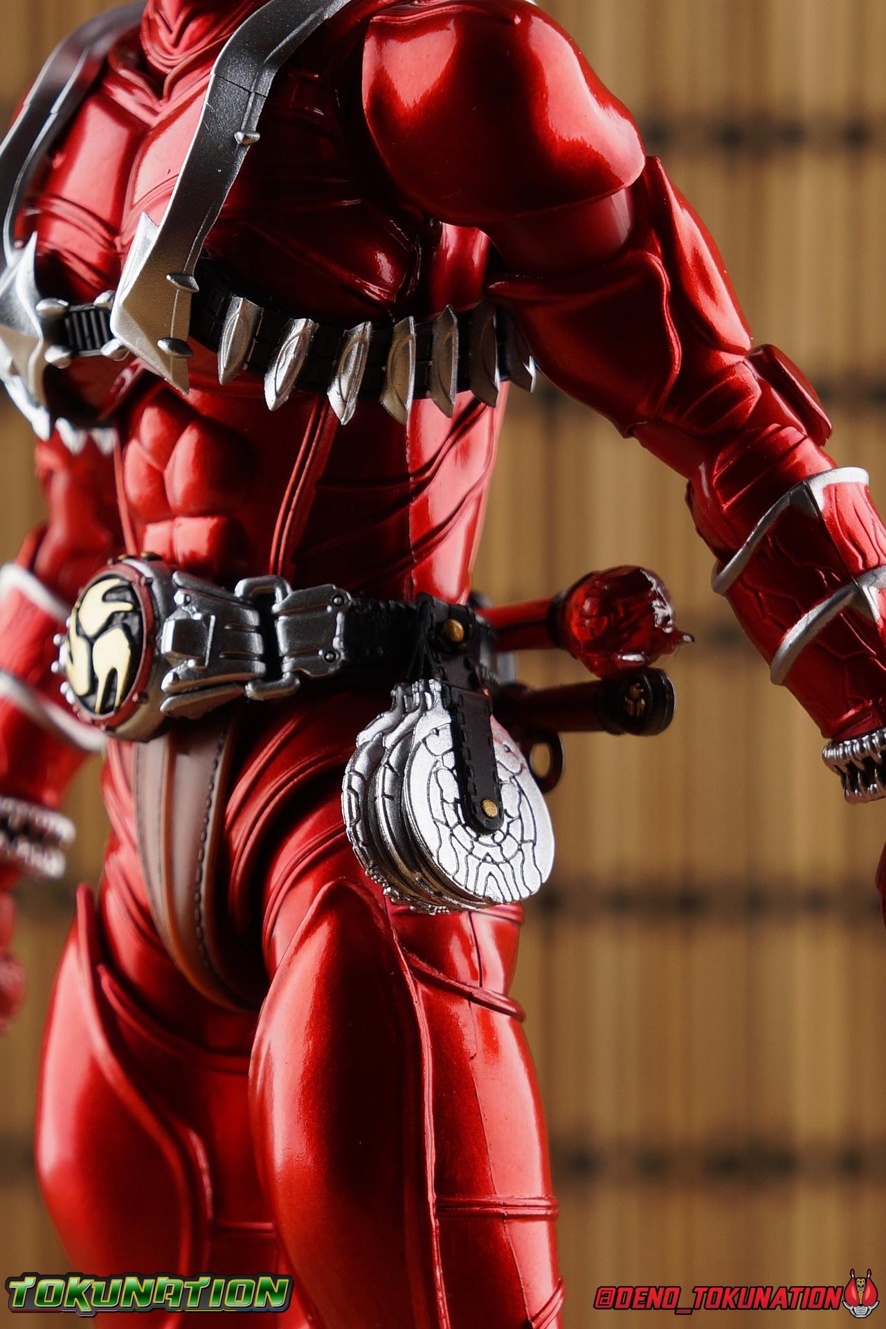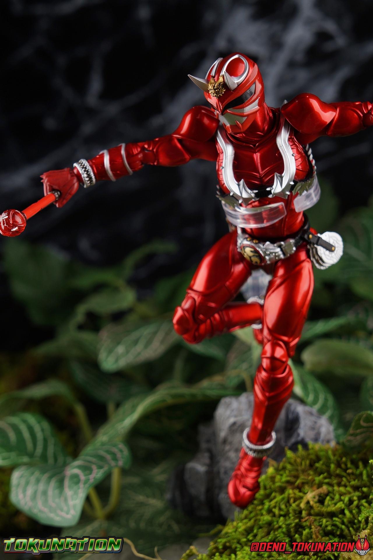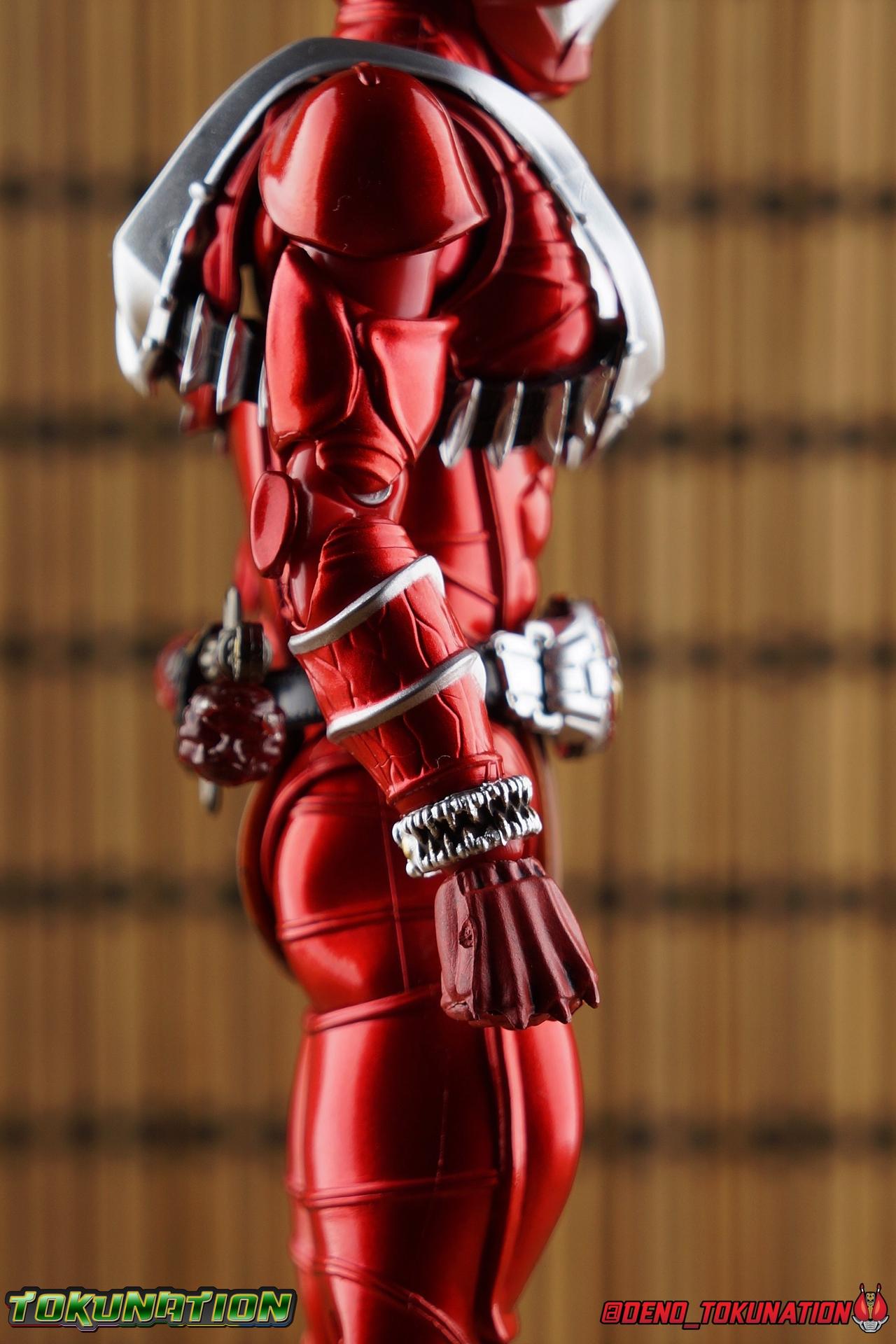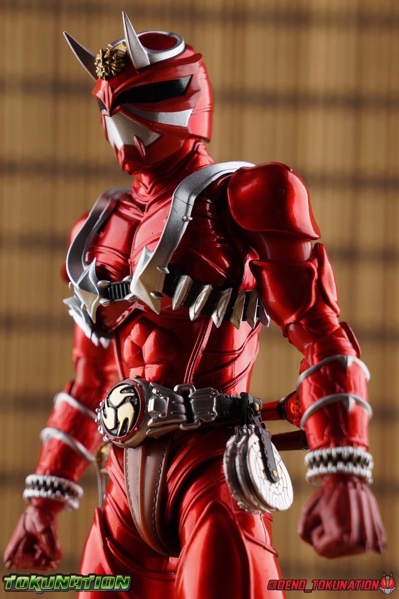 It is the Summer of Training. And while mentoring Todoroki's inconsistent practice of the Taiko drum, and even bestowing the Ongekibou to both Todoroki & Ibuki, Kamen Rider Hibiki furiously trains himself. Faster, stronger, hotter. Burning brighter than he ever has before, Hibiki must master the rhythm of his core once again and draw out the full potential of his Ongekibou. Without this strength, the deadly Dorotabou will continue to multiply, wreaking havoc on the local villages. With a fire of strength raging in his heart, Hibiki explodes into a new form, Kamen Rider Hibiki Kurenai! Packaging Hibiki Kurenai comes in that familiar and collector friendly packaging this line has come to be known for. No massive changes here even from the first Seihou Hibiki release from 6 years ago, the only differenes here being the stock imagery and the front facing portrait. It's a stylish box type even if it feels a little bit more stale each time. I do appreciate when they change things up more with releases like Ankh, Den-O, & Kiba. Main Figure Obviously, Shinkocchou Seihou Hibiki was one of the first figures of the entire Seihou line, predated only by Kabuto. So it's great to see that just over 6 years later, that this fantastic mold has returned to the line with this explosive form. The 3 previous releases in the Hibiki line, Ibuki Todoroki & Zanki, were all magnificent and brought something new and unique to this body type. At their core each shares the basic body structure that Hibiki pioneered. With Hibiki Kurenai though, we finally circle back around the to original tooling of the mold. It's hard to say anything new about the mold itself. As I've gone into on 4 occasions now reviewing Hibiki releases, this is a stellar figure. Each iteration of the mold looks like a suit that's just walked off screen. Of the entire Seihou line, I think the Oni Riders by far look the most gorgeous and lifelike. I'll get into the usual in's and out's of the articulation scheme soon, but first I want to focus on the stunning paint apps on this beauty. The entire figure is decked out in a gorgeous metallic red in the same fashion as that metallic purple of the original release. The paint apps to the core body are largely the only change we see as well, though there are some additional red paint apps on the upper forearms giving them a uniform red look, and some new apps on the head giving Hibiki a much needed visor and mouth plate that really bring the design together. As always Tamashii's attention to detail is jaw dropping. Below we'll get into the articulation this mold has always boasted, but it won't be terribly different from my previous breakdowns of the Hibiki Riders. Feel free to skip down if you wish. The sculpt of this body type really brings to life these unique Oni Rider suits. In every way imaginable it captures the look of the on screen suit right down to the textured musculature, and the gloss of the armor really gives in that pleather/vinyl feel of an actual suit. The design process Seihou's go through has always been much much more involved than that of the standard figuarts line and the best examples of this were the special booklets included with Kabuto & the original Hibiki. When the design begins with a sort of skeletal inner frame, and builds out what would be like a suit over a real human body like this, you get a much more realistic application of articulation and proportion to the body as a result. Now despite the obvious color shift to red, Hibiki Kurenai is physically identical to the original release. When Bandai nails the basic design of the body, it can be truly astounding how outer level cosmetic changes can create a vastly different experience though. Even so, some of my minor gripes still exist. I've always found the legs to be odd. To me, they look really long and at odds with the torso, especially when bent for crouching poses. Something about them looks off. They function well enough, though I've always thought this mold had one of the more strange figuarts hip joints out there. While the part separation undoubtedly gives them great range, the hips look very small by the time you angle them out fully, making the thigh seem huge by comparison. And while the knees function just fine, the feet could have slightly more range. The only unchanged part of the legs color wise, is the silver bands which adorn Kurenai's ankles. Hibiki Kurenai's belt is really loaded up with accessories like his predecessors as well. This figure comes with a lot and luckily you can store some of it on his belt given the display options you've chosen. When loaded out for static poses, the left hip can be outfitted with a Disc Animal holster with 3 non-removable discs sculpted in. Or you can keep the out of box standard part attached which is an empty holster for when you want him to hold the discs in hand. At the center of the belt is the same Ongekiko Kaentsuzumi the original Hibiki had. This circular piece is removable to simulate how how Hibiki uses it like a taiko drum for Ongeki Da finishers. It can be used with any Oni Rider that has a similarly designed belt. The right hip features Hibiki's signature transformation tuning fork, the Henshin Onsa Onkaku in it's collapsed form, though a standard open one is included for use with the figure as well. The back side of the belt can either feature an empty Ongekibou holster or a part is included showing them stored away. If you're paying attention you'll see that in a few photos below I forgot to remove them until well after this shoot was over. Once again the upper body is identical to classic Hibiki. The torso is a beautiful glossy read offset by that magnificently sculpted chest harness that goes around the back as well. The upper and lower halves of the torso move independent of one another, though it's a tight fit to get either to move very far. I've always felt this body type was a bit stiff, but it gets the job done very nicely still. Kurenai's arms 