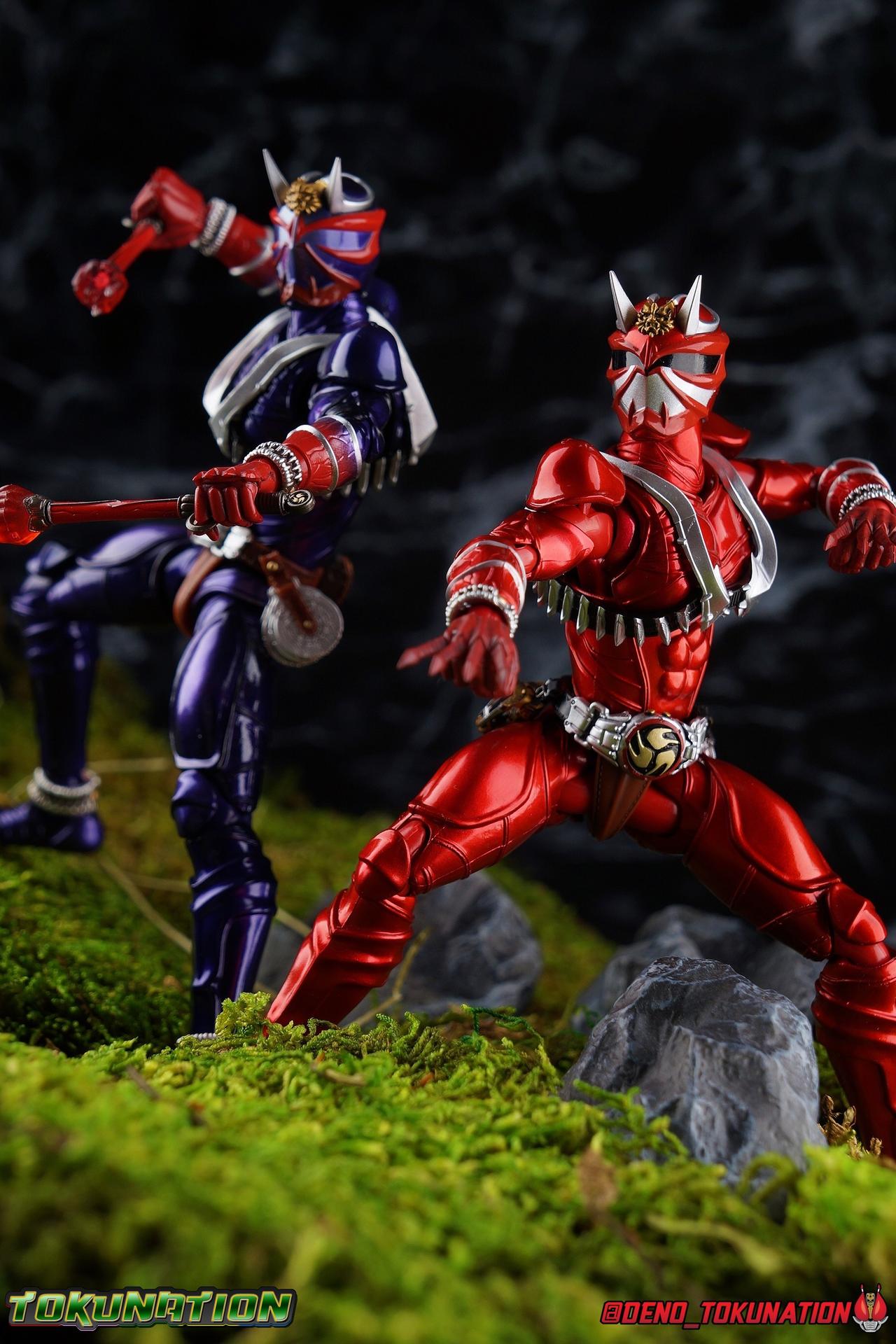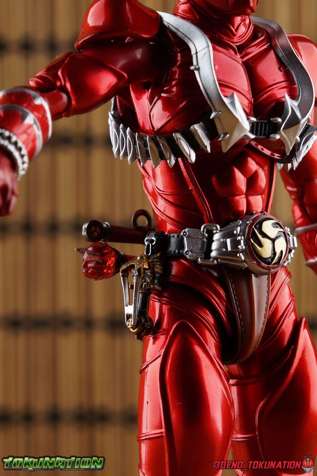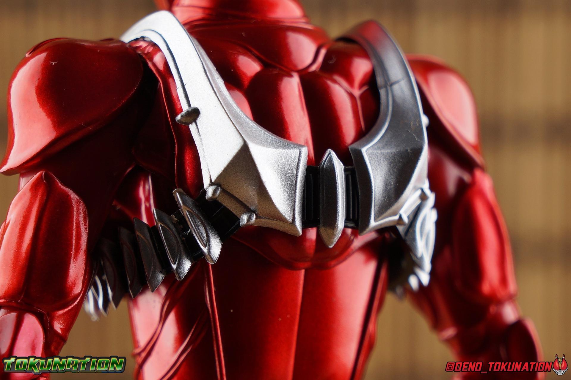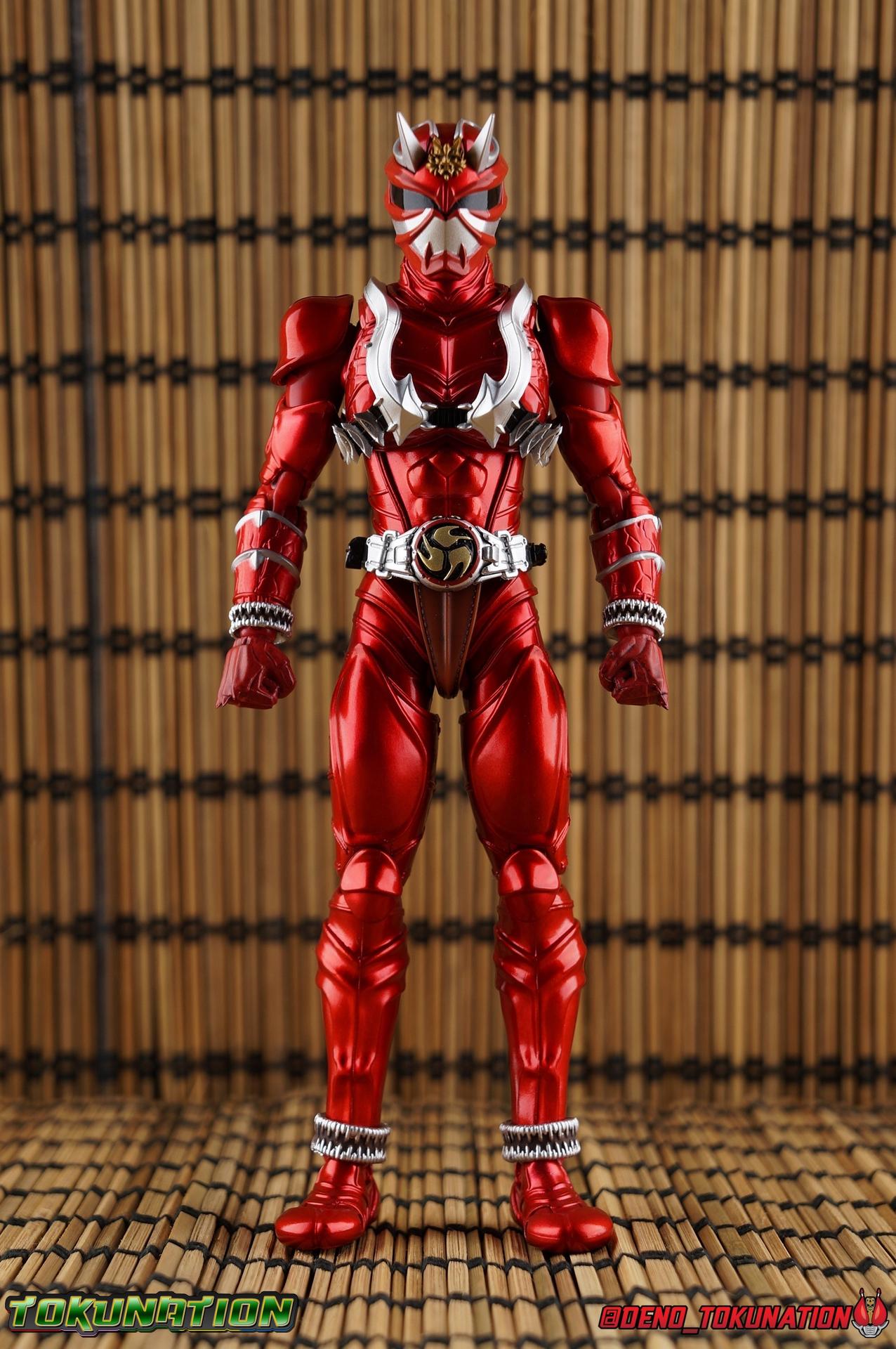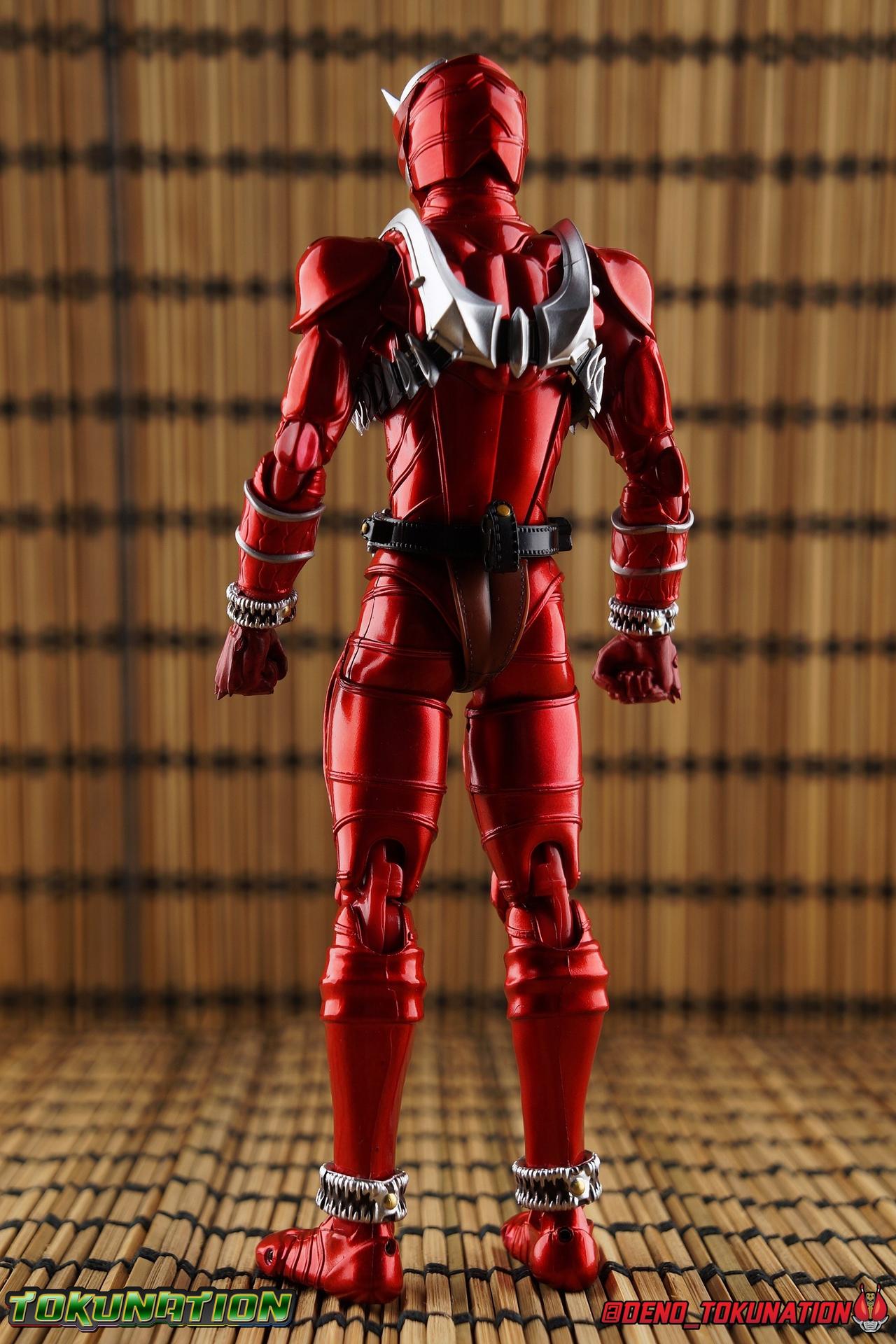 It is the Summer of Training. And while mentoring Todoroki's inconsistent practice of the Taiko drum, and even bestowing the Ongekibou to both Todoroki & Ibuki, Kamen Rider Hibiki furiously trains himself. Faster, stronger, hotter. Burning brighter than he ever has before, Hibiki must master the rhythm of his core once again and draw out the full potential of his Ongekibou. Without this strength, the deadly Dorotabou will continue to multiply, wreaking havoc on the local villages. With a fire of strength raging in his heart, Hibiki explodes into a new form, Kamen Rider Hibiki Kurenai! Packaging Hibiki Kurenai comes in that familiar and collector friendly packaging this line has come to be known for. No massive changes here even from the first Seihou Hibiki release from 6 years ago, the only differenes here being the stock imagery and the front facing portrait. It's a stylish box type even if it feels a little bit more stale each time. I do appreciate when they change things up more with releases like Ankh, Den-O, & Kiba. Main Figure Obviously, Shinkocchou Seihou Hibiki was one of the first figures of the entire Seihou line, predated only by Kabuto. So it's great to see that just over 6 years later, that this fantastic mold has returned to the line with this explosive form. The 3 previous releases in the Hibiki line, Ibuki Todoroki & Zanki, were all magnificent and brought something new and unique to this body type. At their core each shares the basic body structure that Hibiki pioneered. With Hibiki Kurenai though, we finally circle back around the to original tooling of the mold. It's hard to say anything new about the mold itself. As I've gone into on 4 occasions now reviewing Hibiki releases, this is a stellar figure. Each iteration of the mold looks like a suit that's just walked off screen. Of the entire Seihou line, I think the Oni Riders by far look the most gorgeous and lifelike. I'll get into the usual in's and out's of the articulation scheme soon, but first I want to focus on the stunning paint apps on this beauty. The entire figure is decked out in a gorgeous metallic red in the same fashion as that metallic purple of the original release. The paint apps to the core body are largely the only change we see as well, though there are some additional red paint apps on the upper forearms giving them a uniform red look, and some new apps on the head giving Hibiki a much needed visor and mouth plate that really bring the design together. As always Tamashii's attention to detail is jaw dropping. Below we'll get into the articulation this mold has always boasted, but it won't be terribly different from my previous breakdowns of the Hibiki Riders. Feel free to skip down if you wish. The sculpt of this body type really brings to life these unique Oni Rider suits. In every way imaginable it captures the look of the on screen suit right down to the textured musculature, and the gloss of the armor really gives in that pleather/vinyl feel of an actual suit. The design process Seihou's go through has always been much much more involved than that of the standard figuarts line and the best examples of this were the special booklets included with Kabuto & the original Hibiki. When the design begins with a sort of skeletal inner frame, and builds out what would be like a suit over a real human body like this, you get a much more realistic application of articulation and proportion to the body as a result. Now despite the obvious color shift to red, Hibiki Kurenai is physically identical to the original release. When Bandai nails the basic design of the body, it can be truly astounding how outer level cosmetic changes can create a vastly different experience though. Even so, some of my minor gripes still exist. I've always found the legs to be odd. To me, they look really long and at odds with the torso, especially when bent for crouching poses. Something about them looks off. They function well enough, though I've always thought this mold had one of the more strange figuarts hip joints out there. While the part separation undoubtedly gives them great range, the hips look very small by the time you angle them out fully, making the thigh seem huge by comparison. And while the knees function just fine, the feet could have slightly more range. The only unchanged part of the legs color wise, is the silver bands which adorn Kurenai's ankles. Hibiki Kurenai's belt is really loaded up with accessories like his predecessors as well. This figure comes with a lot and luckily you can store some of it on his belt given the display options you've chosen. When loaded out for static poses, the left hip can be outfitted with a Disc Animal holster with 3 non-removable discs sculpted in. Or you can keep the out of box standard part attached which is an empty holster for when you want him to hold the discs in hand. At the center of the belt is the same Ongekiko Kaentsuzumi the original Hibiki had. This circular piece is removable to simulate how how Hibiki uses it like a taiko drum for Ongeki Da finishers. It can be used with any Oni Rider that has a similarly designed belt. The right hip features Hibiki's signature transformation tuning fork, the Henshin Onsa Onkaku in it's collapsed form, though a standard open one is included for use with the figure as well. The back side of the belt can either feature an empty Ongekibou holster or a part is included showing them stored away. If you're paying attention you'll see that in a few photos below I forgot to remove them until well after this shoot was over. Once again the upper body is identical to classic Hibiki. The torso is a beautiful glossy read offset by that magnificently sculpted chest harness that goes around the back as well. The upper and lower halves of the torso move independent of one another, though it's a tight fit to get either to move very far. I've always felt this body type was a bit stiff, but it gets the job done very nicely still. Kurenai's arms 