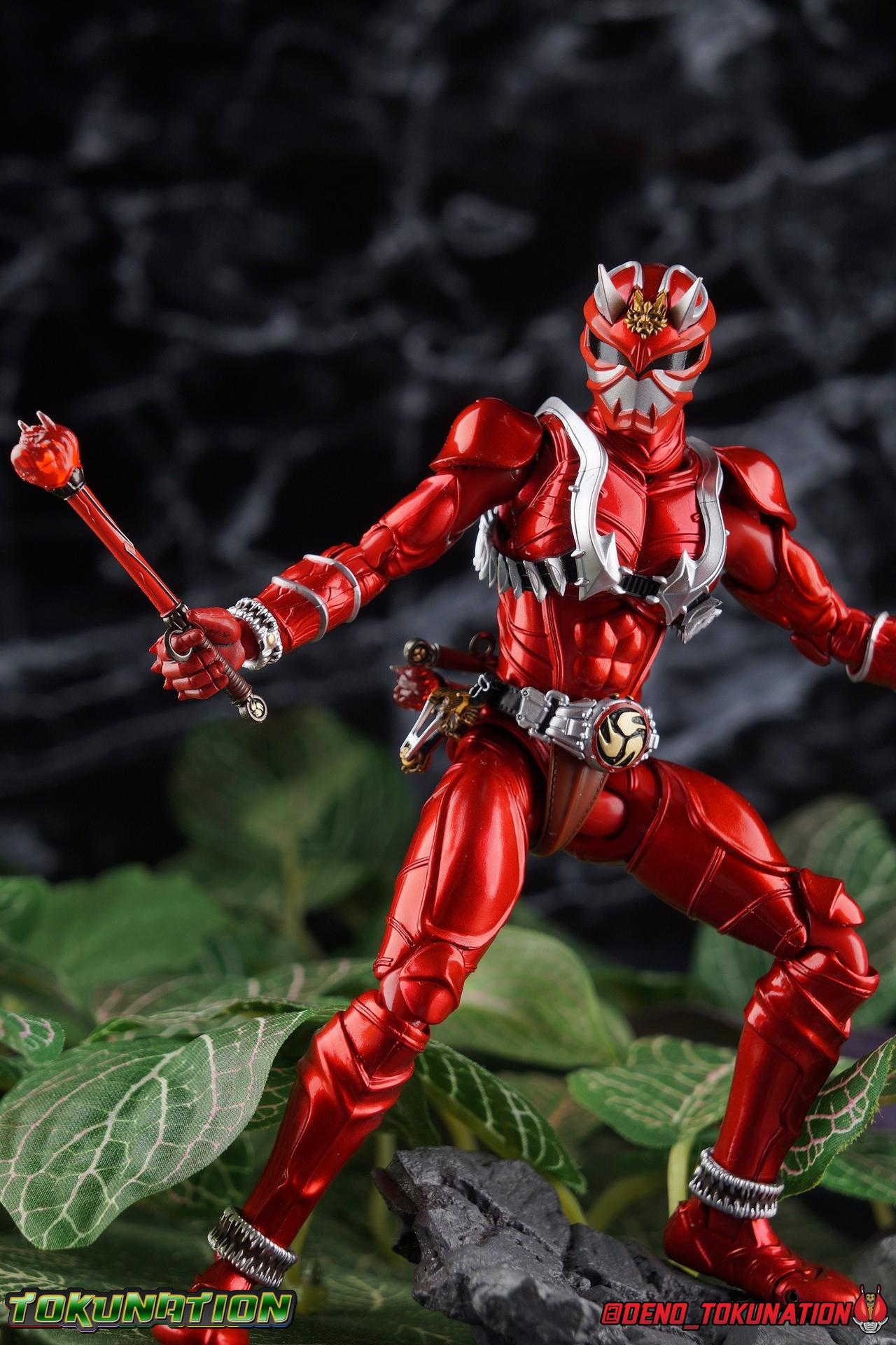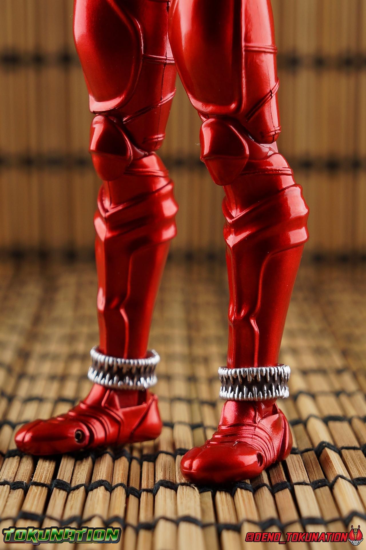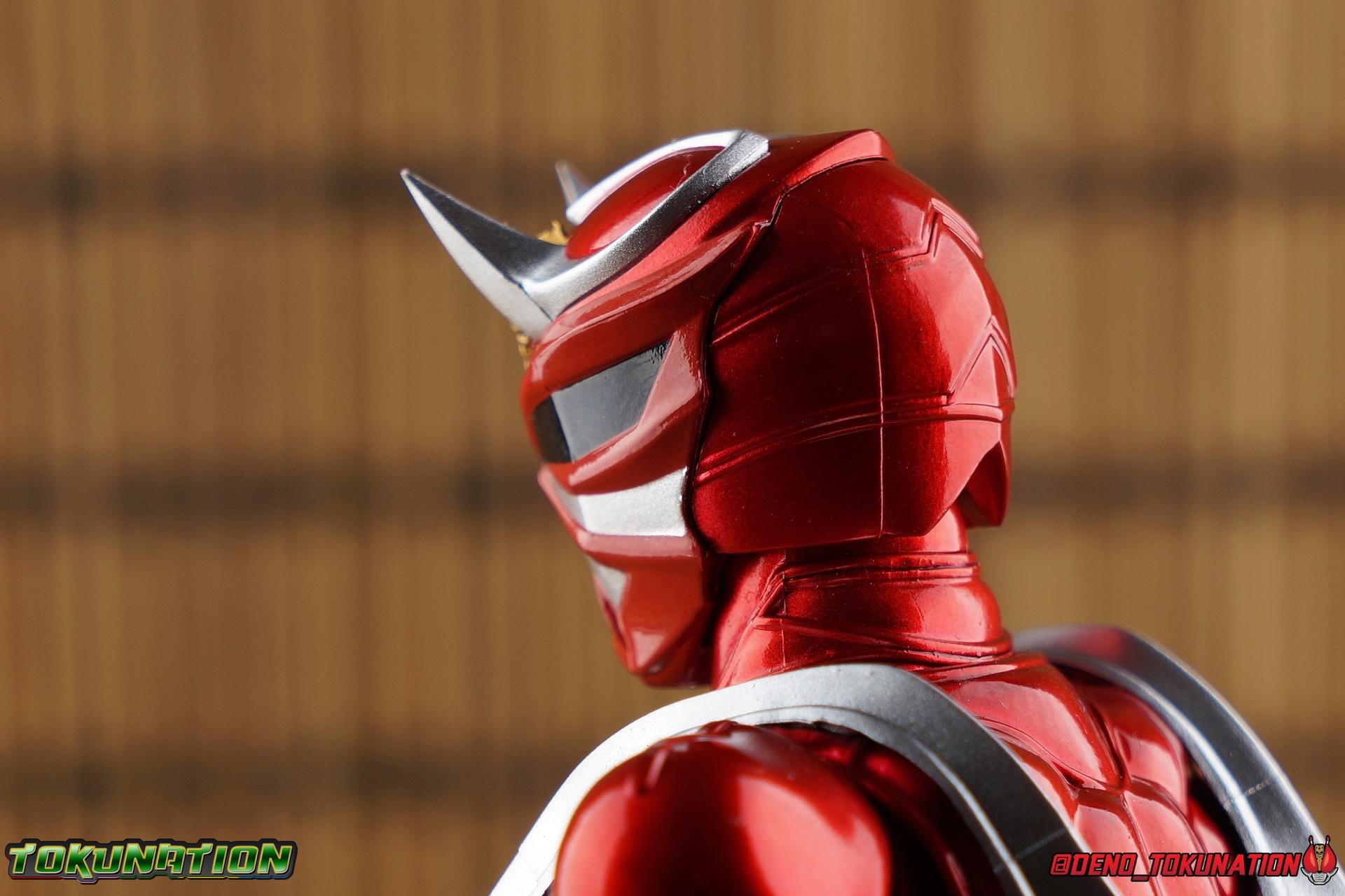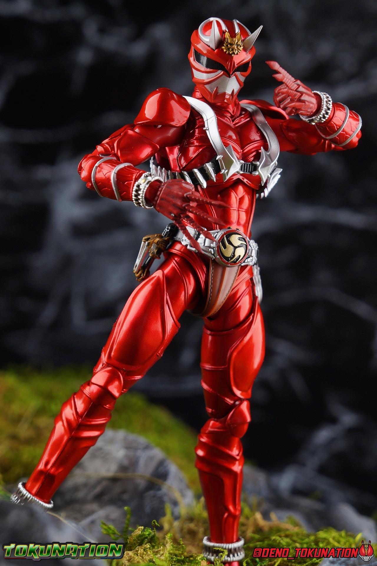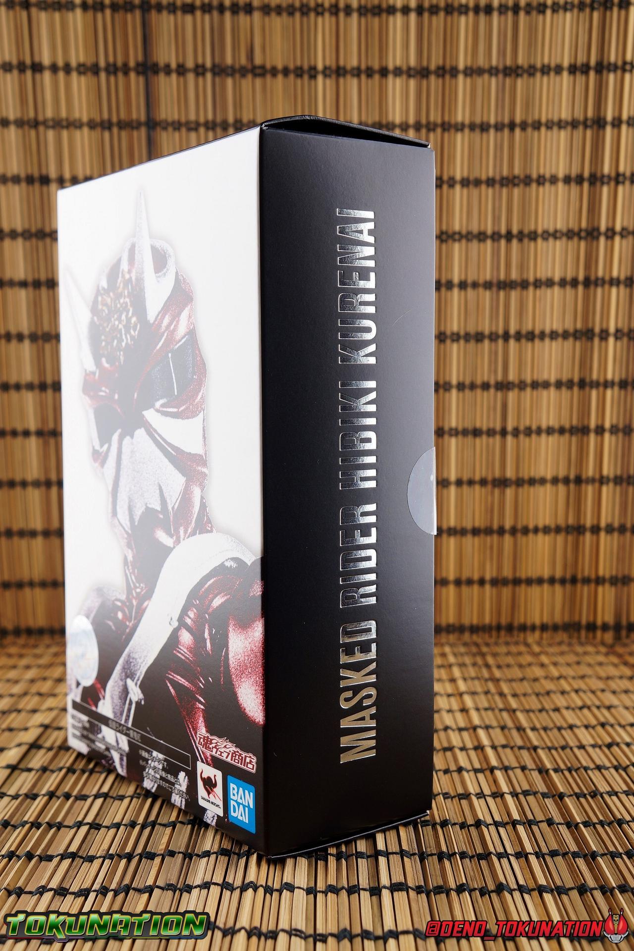 It is the Summer of Training. And while mentoring Todoroki's inconsistent practice of the Taiko drum, and even bestowing the Ongekibou to both Todoroki & Ibuki, Kamen Rider Hibiki furiously trains himself. Faster, stronger, hotter. Burning brighter than he ever has before, Hibiki must master the rhythm of his core once again and draw out the full potential of his Ongekibou. Without this strength, the deadly Dorotabou will continue to multiply, wreaking havoc on the local villages. With a fire of strength raging in his heart, Hibiki explodes into a new form, Kamen Rider Hibiki Kurenai! Packaging Hibiki Kurenai comes in that familiar and collector friendly packaging this line has come to be known for. No massive changes here even from the first Seihou Hibiki release from 6 years ago, the only differenes here being the stock imagery and the front facing portrait. It's a stylish box type even if it feels a little bit more stale each time. I do appreciate when they change things up more with releases like Ankh, Den-O, & Kiba. Main Figure Obviously, Shinkocchou Seihou Hibiki was one of the first figures of the entire Seihou line, predated only by Kabuto. So it's great to see that just over 6 years later, that this fantastic mold has returned to the line with this explosive form. The 3 previous releases in the Hibiki line, Ibuki Todoroki & Zanki, were all magnificent and brought something new and unique to this body type. At their core each shares the basic body structure that Hibiki pioneered. With Hibiki Kurenai though, we finally circle back around the to original tooling of the mold. It's hard to say anything new about the mold itself. As I've gone into on 4 occasions now reviewing Hibiki releases, this is a stellar figure. Each iteration of the mold looks like a suit that's just walked off screen. Of the entire Seihou line, I think the Oni Riders by far look the most gorgeous and lifelike. I'll get into the usual in's and out's of the articulation scheme soon, but first I want to focus on the stunning paint apps on this beauty. The entire figure is decked out in a gorgeous metallic red in the same fashion as that metallic purple of the original release. The paint apps to the core body are largely the only change we see as well, though there are some additional red paint apps on the upper forearms giving them a uniform red look, and some new apps on the head giving Hibiki a much needed visor and mouth plate that really bring the design together. As always Tamashii's attention to detail is jaw dropping. Below we'll get into the articulation this mold has always boasted, but it won't be terribly different from my previous breakdowns of the Hibiki Riders. Feel free to skip down if you wish. The sculpt of this body type really brings to life these unique Oni Rider suits. In every way imaginable it captures the look of the on screen suit right down to the textured musculature, and the gloss of the armor really gives in that pleather/vinyl feel of an actual suit. The design process Seihou's go through has always been much much more involved than that of the standard figuarts line and the best examples of this were the special booklets included with Kabuto & the original Hibiki. When the design begins with a sort of skeletal inner frame, and builds out what would be like a suit over a real human body like this, you get a much more realistic application of articulation and proportion to the body as a result. Now despite the obvious color shift to red, Hibiki Kurenai is physically identical to the original release. When Bandai nails the basic design of the body, it can be truly astounding how outer level cosmetic changes can create a vastly different experience though. Even so, some of my minor gripes still exist. I've always found the legs to be odd. To me, they look really long and at odds with the torso, especially when bent for crouching poses. Something about them looks off. They function well enough, though I've always thought this mold had one of the more strange figuarts hip joints out there. While the part separation undoubtedly gives them great range, the hips look very small by the time you angle them out fully, making the thigh seem huge by comparison. And while the knees function just fine, the feet could have slightly more range. The only unchanged part of the legs color wise, is the silver bands which adorn Kurenai's ankles. Hibiki Kurenai's belt is really loaded up with accessories like his predecessors as well. This figure comes with a lot and luckily you can store some of it on his belt given the display options you've chosen. When loaded out for static poses, the left hip can be outfitted with a Disc Animal holster with 3 non-removable discs sculpted in. Or you can keep the out of box standard part attached which is an empty holster for when you want him to hold the discs in hand. At the center of the belt is the same Ongekiko Kaentsuzumi the original Hibiki had. This circular piece is removable to simulate how how Hibiki uses it like a taiko drum for Ongeki Da finishers. It can be used with any Oni Rider that has a similarly designed belt. The right hip features Hibiki's signature transformation tuning fork, the Henshin Onsa Onkaku in it's collapsed form, though a standard open one is included for use with the figure as well. The back side of the belt can either feature an empty Ongekibou holster or a part is included showing them stored away. If you're paying attention you'll see that in a few photos below I forgot to remove them until well after this shoot was over. Once again the upper body is identical to classic Hibiki. The torso is a beautiful glossy read offset by that magnificently sculpted chest harness that goes around the back as well. The upper and lower halves of the torso move independent of one another, though it's a tight fit to get either to move very far. I've always felt this body type was a bit stiff, but it gets the job done very nicely still. Kurenai's arms 