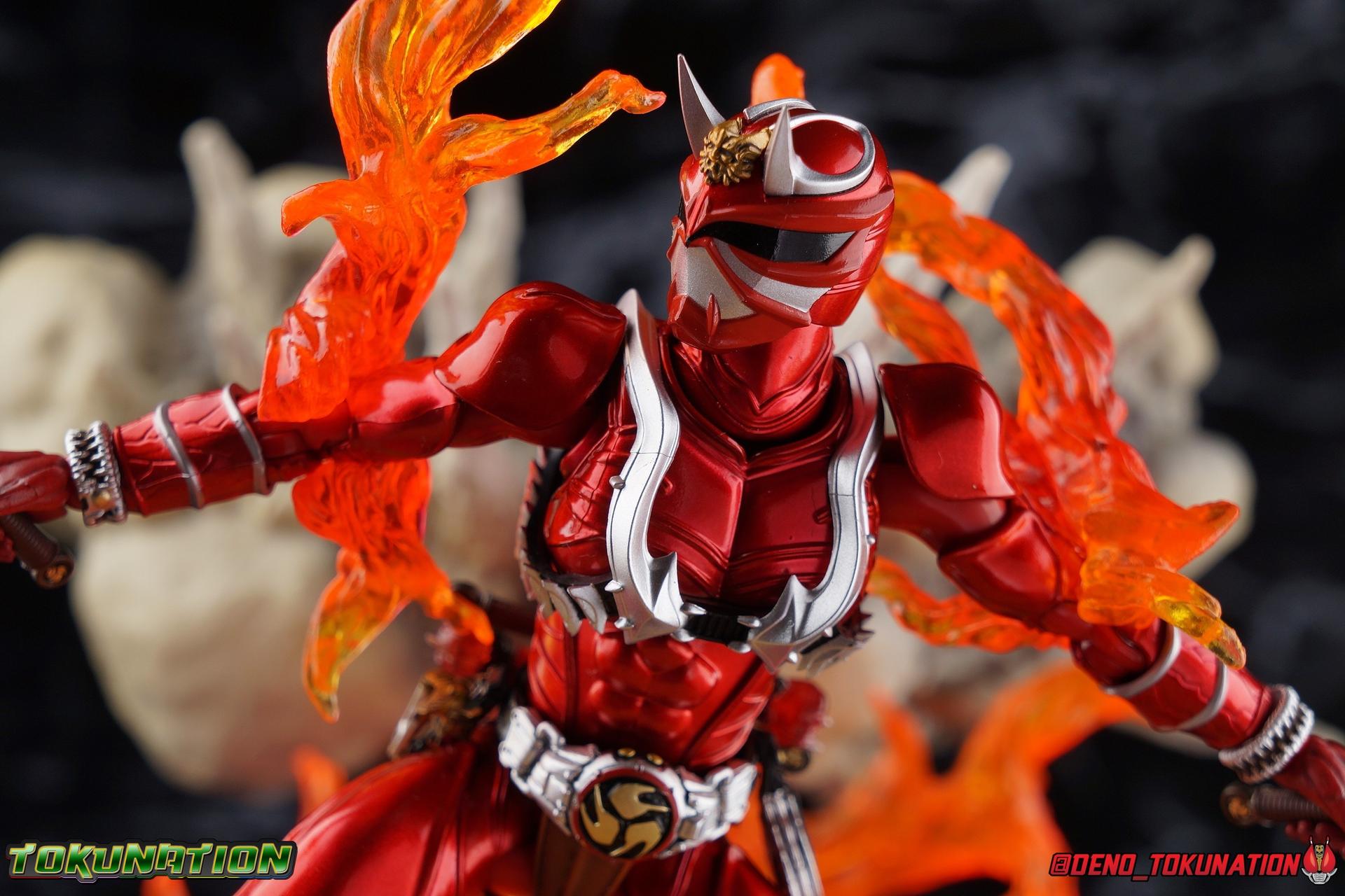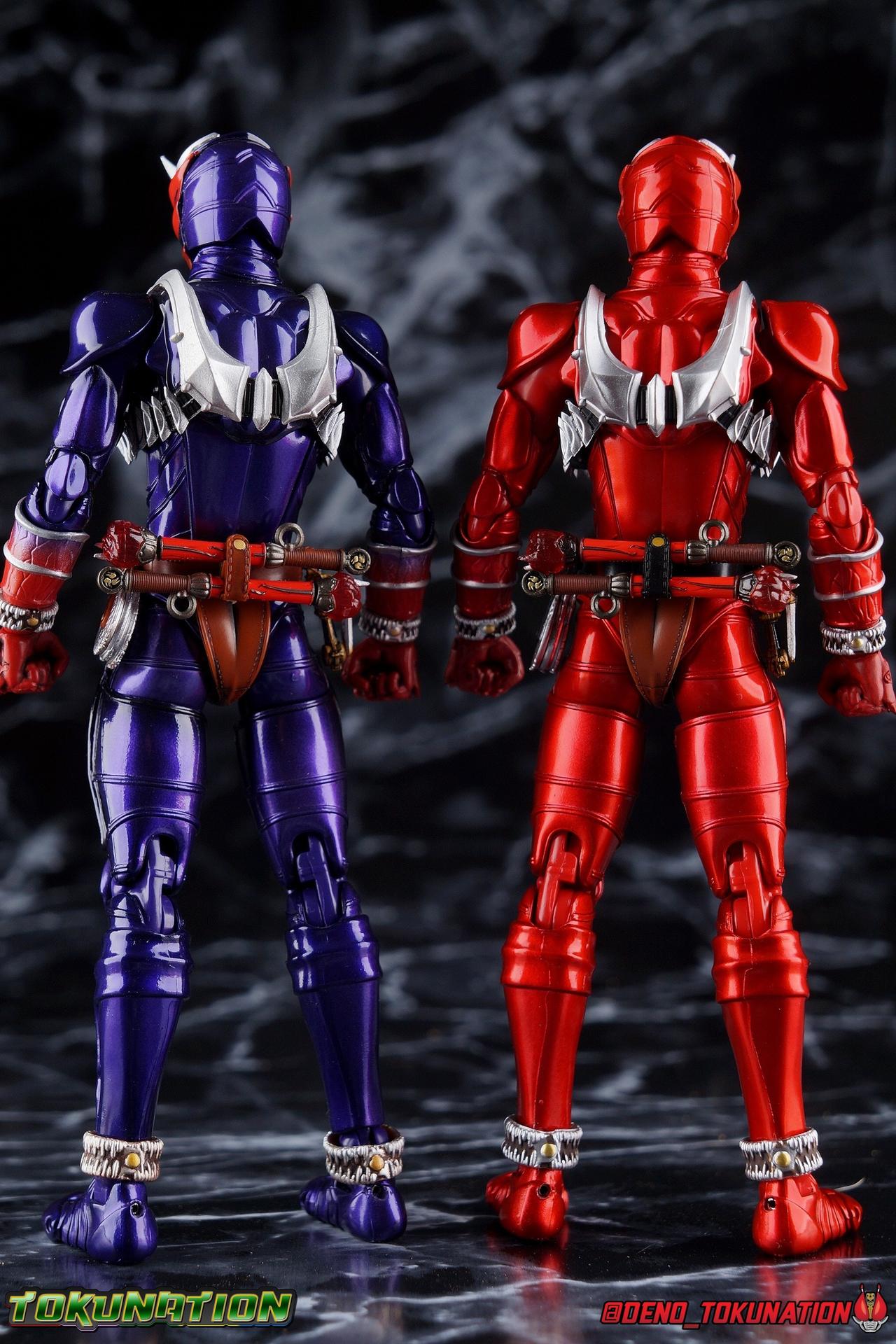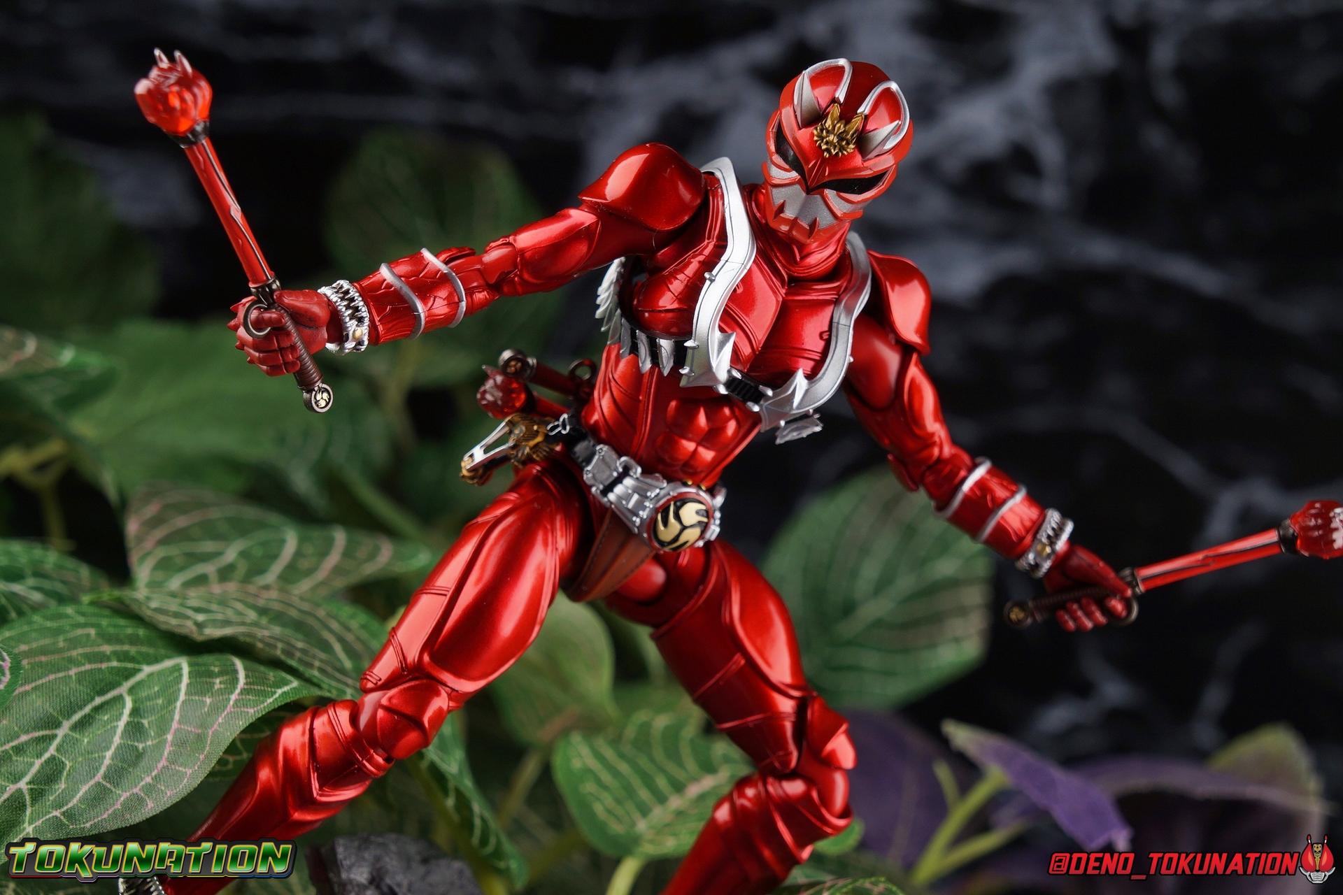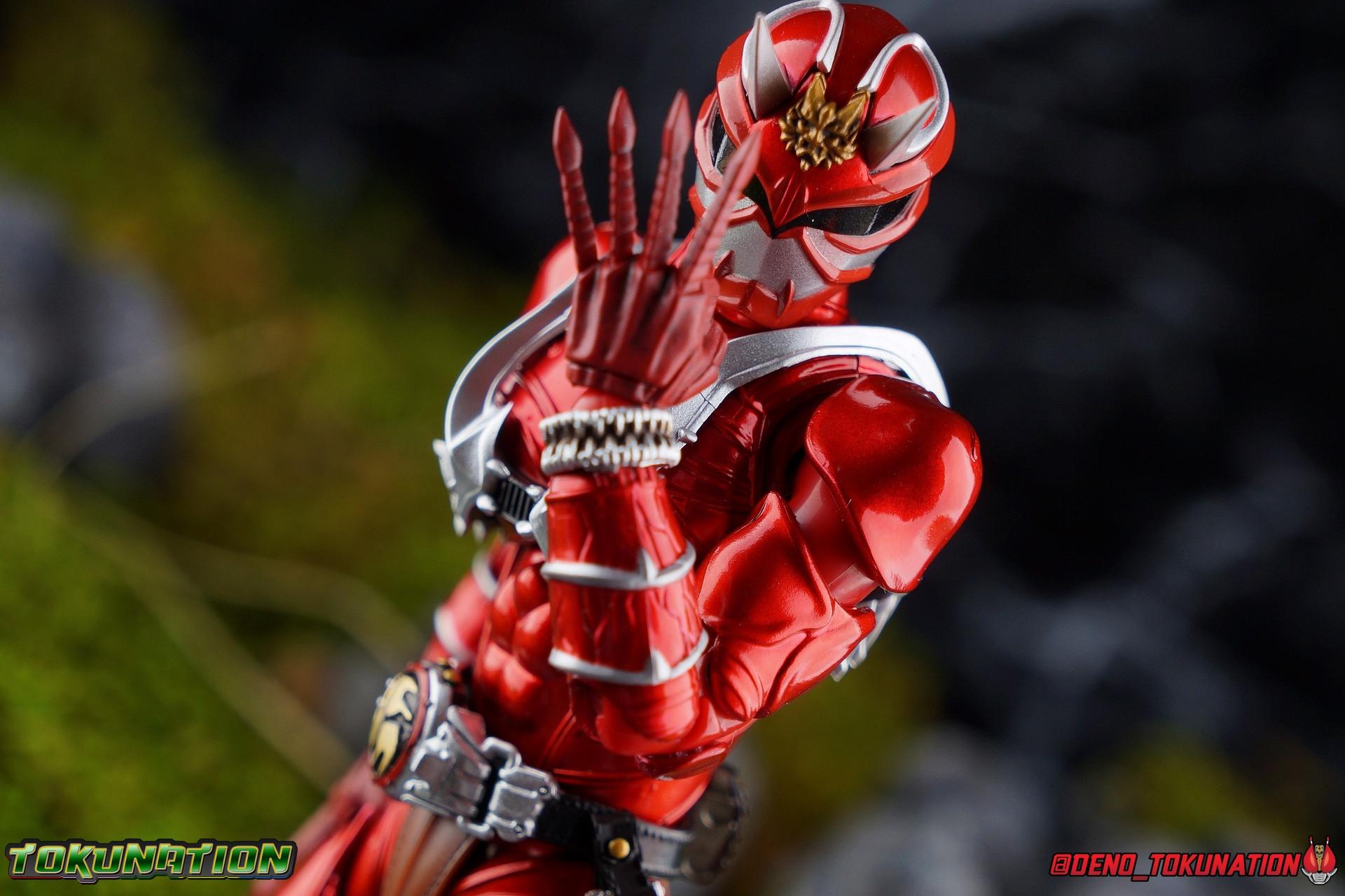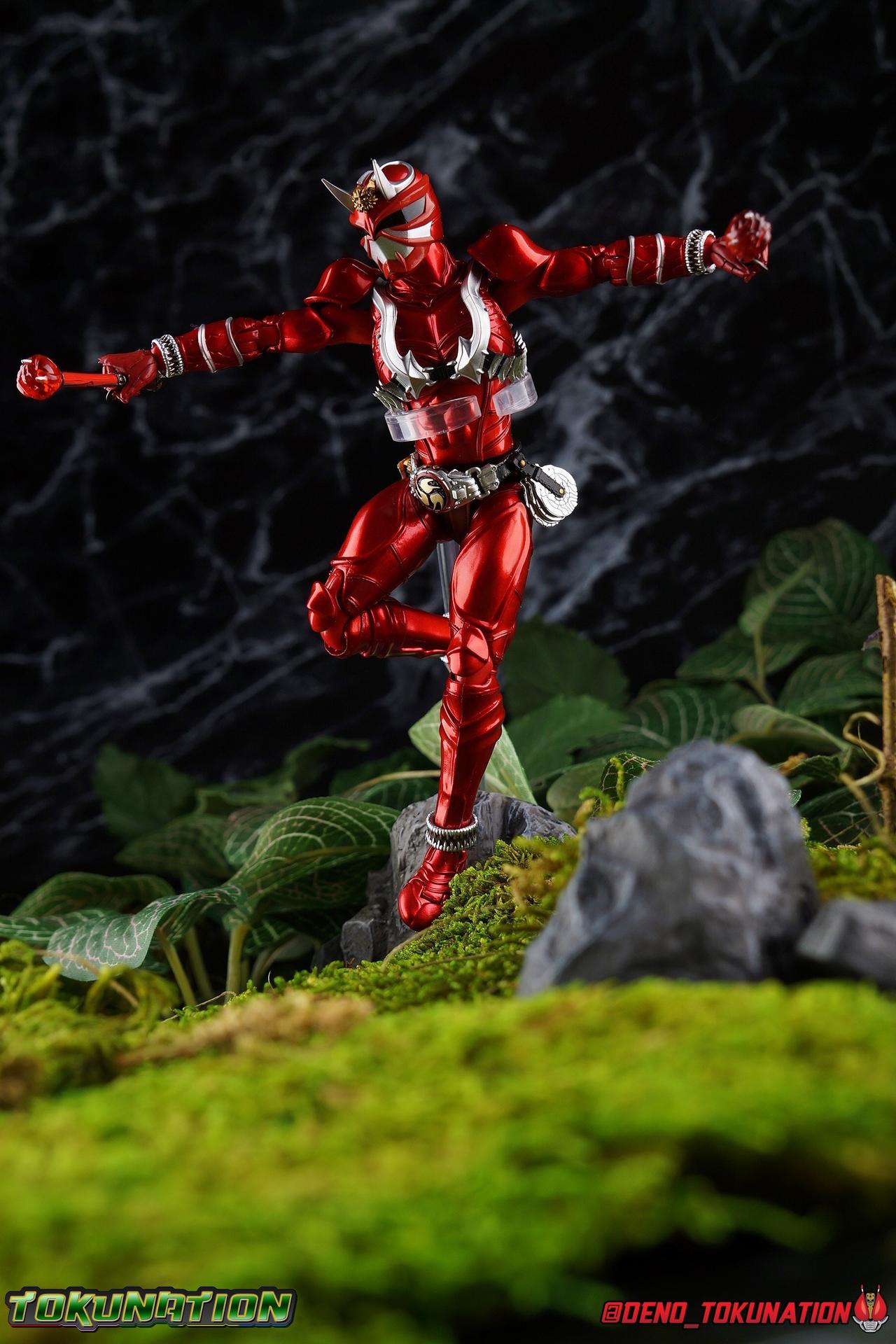 It is the Summer of Training. And while mentoring Todoroki's inconsistent practice of the Taiko drum, and even bestowing the Ongekibou to both Todoroki & Ibuki, Kamen Rider Hibiki furiously trains himself. Faster, stronger, hotter. Burning brighter than he ever has before, Hibiki must master the rhythm of his core once again and draw out the full potential of his Ongekibou. Without this strength, the deadly Dorotabou will continue to multiply, wreaking havoc on the local villages. With a fire of strength raging in his heart, Hibiki explodes into a new form, Kamen Rider Hibiki Kurenai! Packaging Hibiki Kurenai comes in that familiar and collector friendly packaging this line has come to be known for. No massive changes here even from the first Seihou Hibiki release from 6 years ago, the only differenes here being the stock imagery and the front facing portrait. It's a stylish box type even if it feels a little bit more stale each time. I do appreciate when they change things up more with releases like Ankh, Den-O, & Kiba. Main Figure Obviously, Shinkocchou Seihou Hibiki was one of the first figures of the entire Seihou line, predated only by Kabuto. So it's great to see that just over 6 years later, that this fantastic mold has returned to the line with this explosive form. The 3 previous releases in the Hibiki line, Ibuki Todoroki & Zanki, were all magnificent and brought something new and unique to this body type. At their core each shares the basic body structure that Hibiki pioneered. With Hibiki Kurenai though, we finally circle back around the to original tooling of the mold. It's hard to say anything new about the mold itself. As I've gone into on 4 occasions now reviewing Hibiki releases, this is a stellar figure. Each iteration of the mold looks like a suit that's just walked off screen. Of the entire Seihou line, I think the Oni Riders by far look the most gorgeous and lifelike. I'll get into the usual in's and out's of the articulation scheme soon, but first I want to focus on the stunning paint apps on this beauty. The entire figure is decked out in a gorgeous metallic red in the same fashion as that metallic purple of the original release. The paint apps to the core body are largely the only change we see as well, though there are some additional red paint apps on the upper forearms giving them a uniform red look, and some new apps on the head giving Hibiki a much needed visor and mouth plate that really bring the design together. As always Tamashii's attention to detail is jaw dropping. Below we'll get into the articulation this mold has always boasted, but it won't be terribly different from my previous breakdowns of the Hibiki Riders. Feel free to skip down if you wish. The sculpt of this body type really brings to life these unique Oni Rider suits. In every way imaginable it captures the look of the on screen suit right down to the textured musculature, and the gloss of the armor really gives in that pleather/vinyl feel of an actual suit. The design process Seihou's go through has always been much much more involved than that of the standard figuarts line and the best examples of this were the special booklets included with Kabuto & the original Hibiki. When the design begins with a sort of skeletal inner frame, and builds out what would be like a suit over a real human body like this, you get a much more realistic application of articulation and proportion to the body as a result. Now despite the obvious color shift to red, Hibiki Kurenai is physically identical to the original release. When Bandai nails the basic design of the body, it can be truly astounding how outer level cosmetic changes can create a vastly different experience though. Even so, some of my minor gripes still exist. I've always found the legs to be odd. To me, they look really long and at odds with the torso, especially when bent for crouching poses. Something about them looks off. They function well enough, though I've always thought this mold had one of the more strange figuarts hip joints out there. While the part separation undoubtedly gives them great range, the hips look very small by the time you angle them out fully, making the thigh seem huge by comparison. And while the knees function just fine, the feet could have slightly more range. The only unchanged part of the legs color wise, is the silver bands which adorn Kurenai's ankles. Hibiki Kurenai's belt is really loaded up with accessories like his predecessors as well. This figure comes with a lot and luckily you can store some of it on his belt given the display options you've chosen. When loaded out for static poses, the left hip can be outfitted with a Disc Animal holster with 3 non-removable discs sculpted in. Or you can keep the out of box standard part attached which is an empty holster for when you want him to hold the discs in hand. At the center of the belt is the same Ongekiko Kaentsuzumi the original Hibiki had. This circular piece is removable to simulate how how Hibiki uses it like a taiko drum for Ongeki Da finishers. It can be used with any Oni Rider that has a similarly designed belt. The right hip features Hibiki's signature transformation tuning fork, the Henshin Onsa Onkaku in it's collapsed form, though a standard open one is included for use with the figure as well. The back side of the belt can either feature an empty Ongekibou holster or a part is included showing them stored away. If you're paying attention you'll see that in a few photos below I forgot to remove them until well after this shoot was over. Once again the upper body is identical to classic Hibiki. The torso is a beautiful glossy read offset by that magnificently sculpted chest harness that goes around the back as well. The upper and lower halves of the torso move independent of one another, though it's a tight fit to get either to move very far. I've always felt this body type was a bit stiff, but it gets the job done very nicely still. Kurenai's arms 