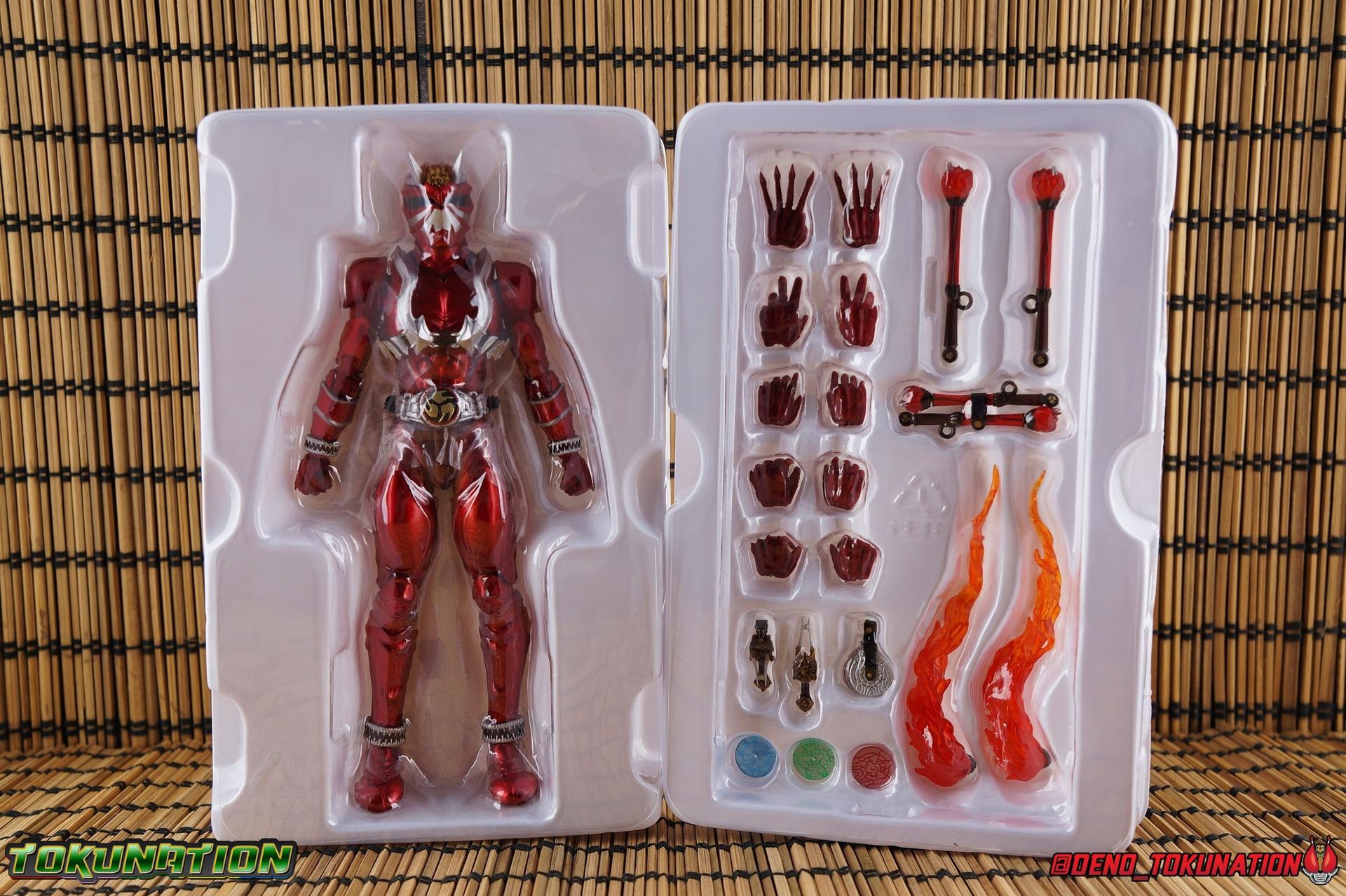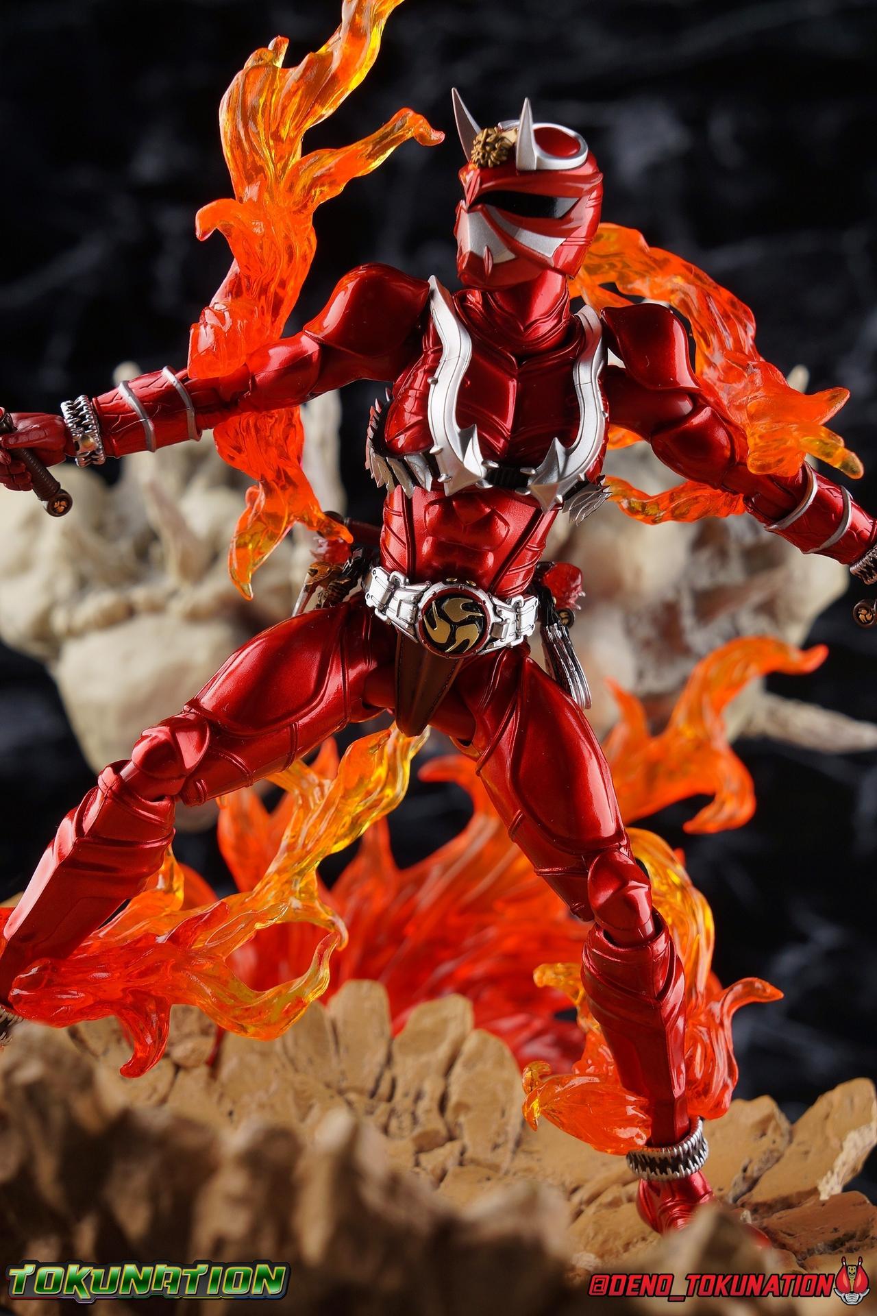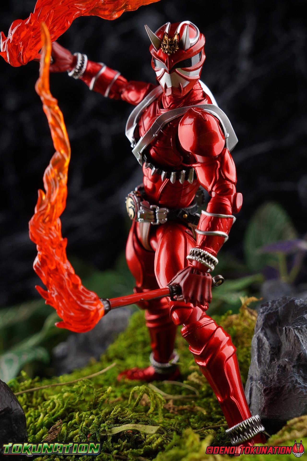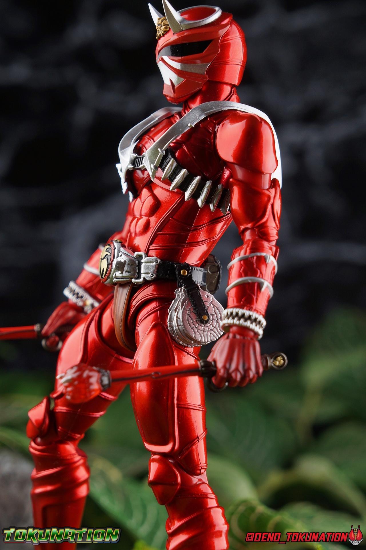 It is the Summer of Training. And while mentoring Todoroki's inconsistent practice of the Taiko drum, and even bestowing the Ongekibou to both Todoroki & Ibuki, Kamen Rider Hibiki furiously trains himself. Faster, stronger, hotter. Burning brighter than he ever has before, Hibiki must master the rhythm of his core once again and draw out the full potential of his Ongekibou. Without this strength, the deadly Dorotabou will continue to multiply, wreaking havoc on the local villages. With a fire of strength raging in his heart, Hibiki explodes into a new form, Kamen Rider Hibiki Kurenai! Packaging Hibiki Kurenai comes in that familiar and collector friendly packaging this line has come to be known for. No massive changes here even from the first Seihou Hibiki release from 6 years ago, the only differenes here being the stock imagery and the front facing portrait. It's a stylish box type even if it feels a little bit more stale each time. I do appreciate when they change things up more with releases like Ankh, Den-O, & Kiba. Main Figure Obviously, Shinkocchou Seihou Hibiki was one of the first figures of the entire Seihou line, predated only by Kabuto. So it's great to see that just over 6 years later, that this fantastic mold has returned to the line with this explosive form. The 3 previous releases in the Hibiki line, Ibuki Todoroki & Zanki, were all magnificent and brought something new and unique to this body type. At their core each shares the basic body structure that Hibiki pioneered. With Hibiki Kurenai though, we finally circle back around the to original tooling of the mold. It's hard to say anything new about the mold itself. As I've gone into on 4 occasions now reviewing Hibiki releases, this is a stellar figure. Each iteration of the mold looks like a suit that's just walked off screen. Of the entire Seihou line, I think the Oni Riders by far look the most gorgeous and lifelike. I'll get into the usual in's and out's of the articulation scheme soon, but first I want to focus on the stunning paint apps on this beauty. The entire figure is decked out in a gorgeous metallic red in the same fashion as that metallic purple of the original release. The paint apps to the core body are largely the only change we see as well, though there are some additional red paint apps on the upper forearms giving them a uniform red look, and some new apps on the head giving Hibiki a much needed visor and mouth plate that really bring the design together. As always Tamashii's attention to detail is jaw dropping. Below we'll get into the articulation this mold has always boasted, but it won't be terribly different from my previous breakdowns of the Hibiki Riders. Feel free to skip down if you wish. The sculpt of this body type really brings to life these unique Oni Rider suits. In every way imaginable it captures the look of the on screen suit right down to the textured musculature, and the gloss of the armor really gives in that pleather/vinyl feel of an actual suit. The design process Seihou's go through has always been much much more involved than that of the standard figuarts line and the best examples of this were the special booklets included with Kabuto & the original Hibiki. When the design begins with a sort of skeletal inner frame, and builds out what would be like a suit over a real human body like this, you get a much more realistic application of articulation and proportion to the body as a result. Now despite the obvious color shift to red, Hibiki Kurenai is physically identical to the original release. When Bandai nails the basic design of the body, it can be truly astounding how outer level cosmetic changes can create a vastly different experience though. Even so, some of my minor gripes still exist. I've always found the legs to be odd. To me, they look really long and at odds with the torso, especially when bent for crouching poses. Something about them looks off. They function well enough, though I've always thought this mold had one of the more strange figuarts hip joints out there. While the part separation undoubtedly gives them great range, the hips look very small by the time you angle them out fully, making the thigh seem huge by comparison. And while the knees function just fine, the feet could have slightly more range. The only unchanged part of the legs color wise, is the silver bands which adorn Kurenai's ankles. Hibiki Kurenai's belt is really loaded up with accessories like his predecessors as well. This figure comes with a lot and luckily you can store some of it on his belt given the display options you've chosen. When loaded out for static poses, the left hip can be outfitted with a Disc Animal holster with 3 non-removable discs sculpted in. Or you can keep the out of box standard part attached which is an empty holster for when you want him to hold the discs in hand. At the center of the belt is the same Ongekiko Kaentsuzumi the original Hibiki had. This circular piece is removable to simulate how how Hibiki uses it like a taiko drum for Ongeki Da finishers. It can be used with any Oni Rider that has a similarly designed belt. The right hip features Hibiki's signature transformation tuning fork, the Henshin Onsa Onkaku in it's collapsed form, though a standard open one is included for use with the figure as well. The back side of the belt can either feature an empty Ongekibou holster or a part is included showing them stored away. If you're paying attention you'll see that in a few photos below I forgot to remove them until well after this shoot was over. Once again the upper body is identical to classic Hibiki. The torso is a beautiful glossy read offset by that magnificently sculpted chest harness that goes around the back as well. The upper and lower halves of the torso move independent of one another, though it's a tight fit to get either to move very far. I've always felt this body type was a bit stiff, but it gets the job done very nicely still. Kurenai's arms 