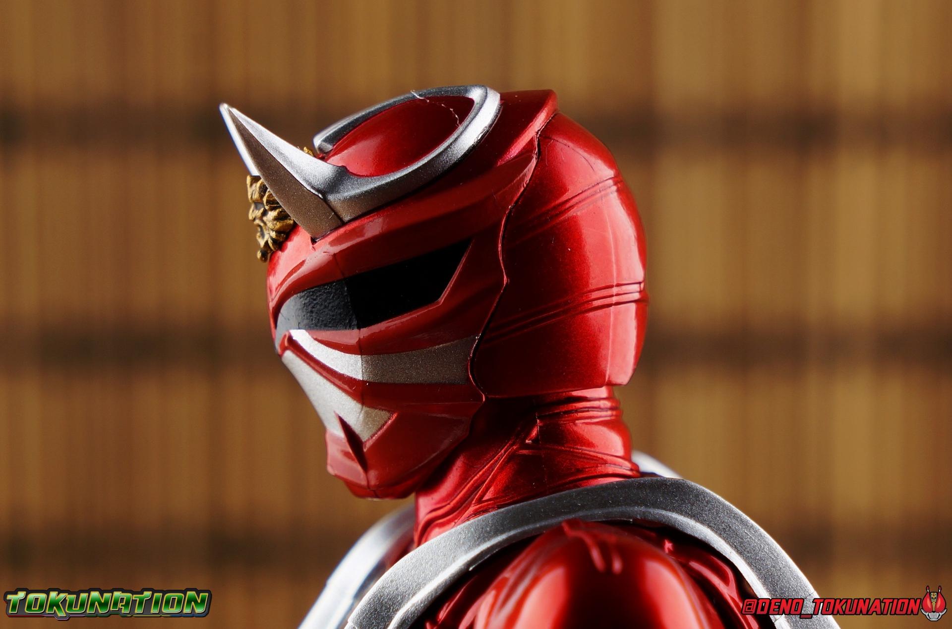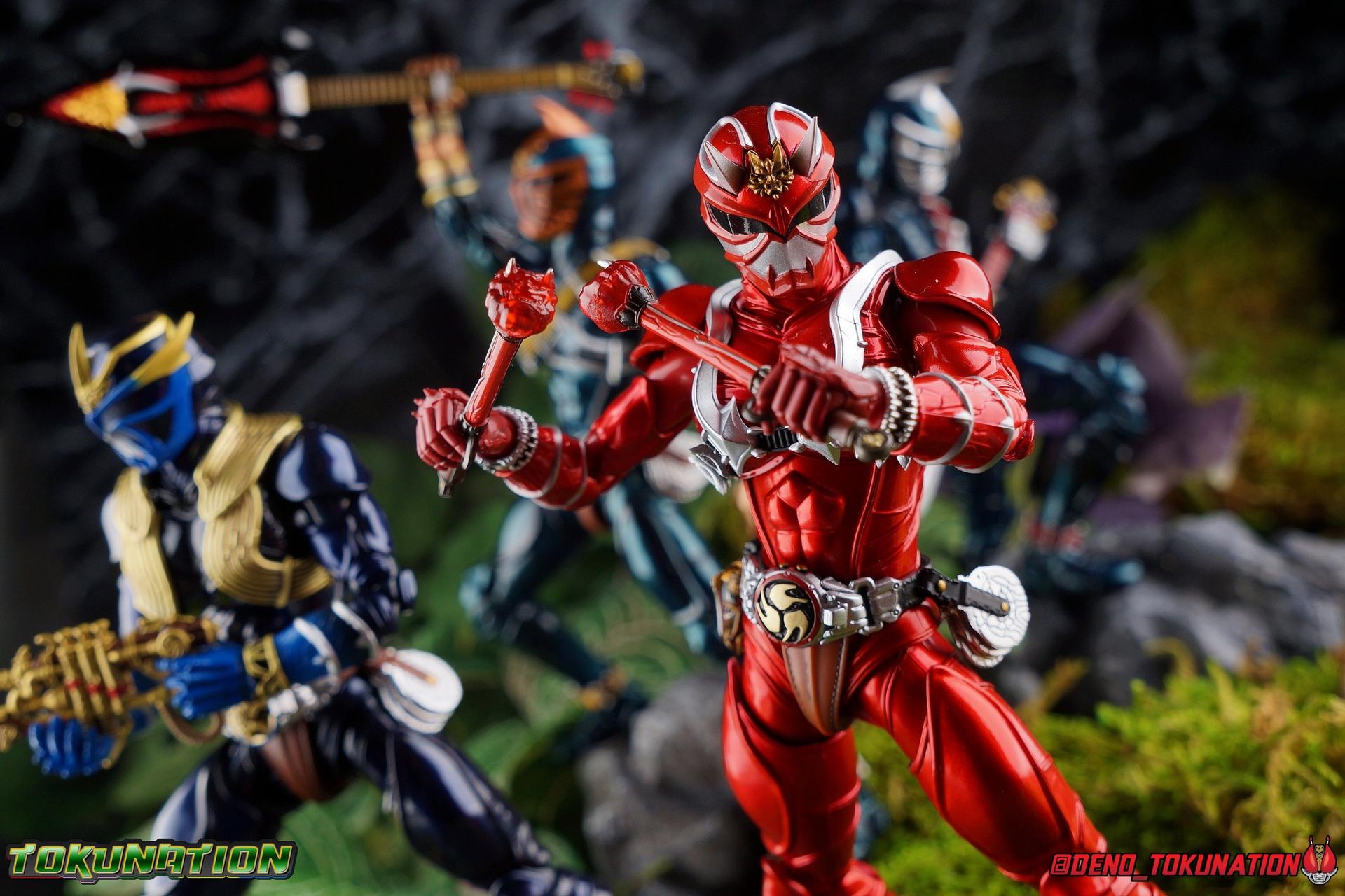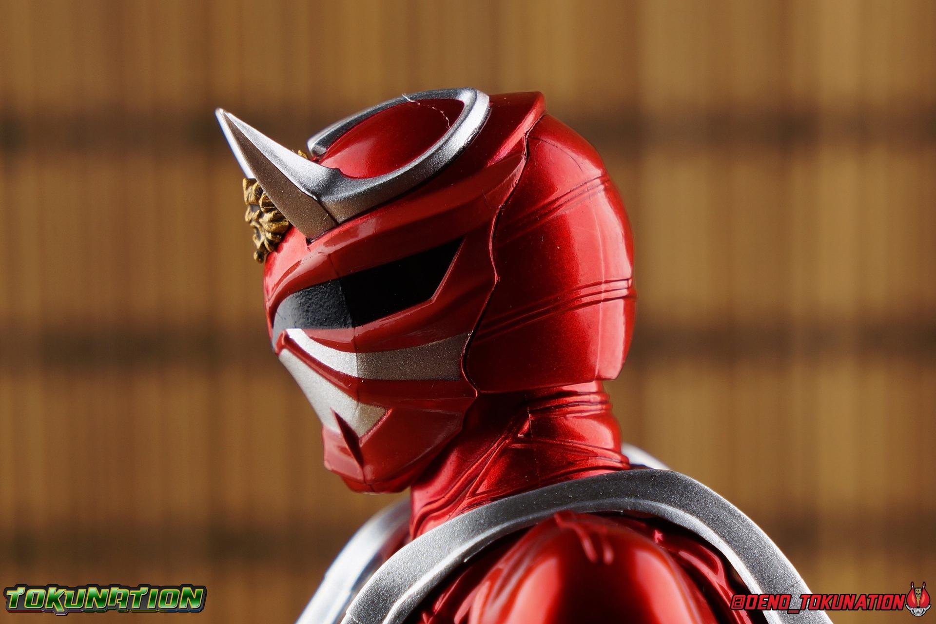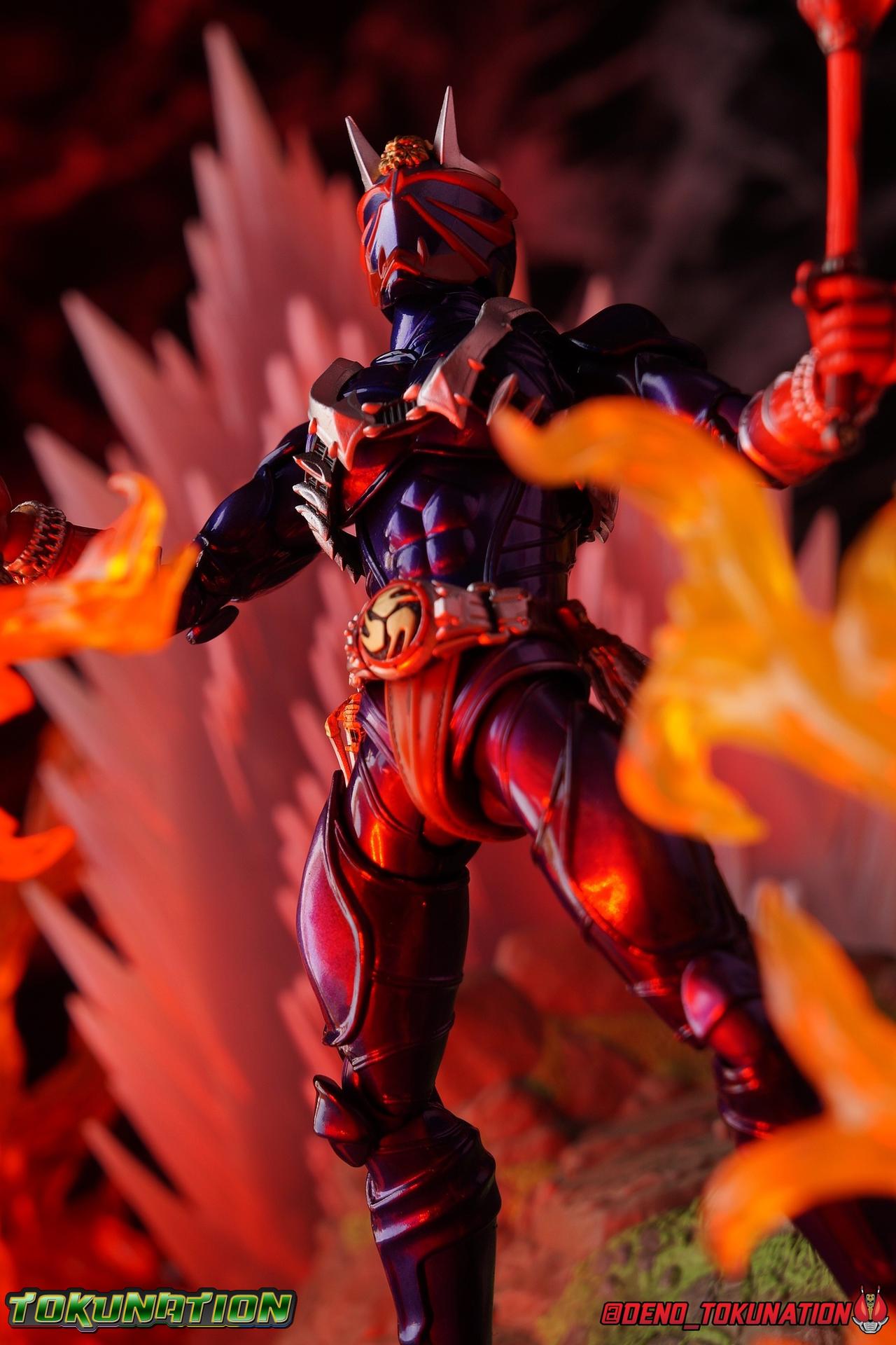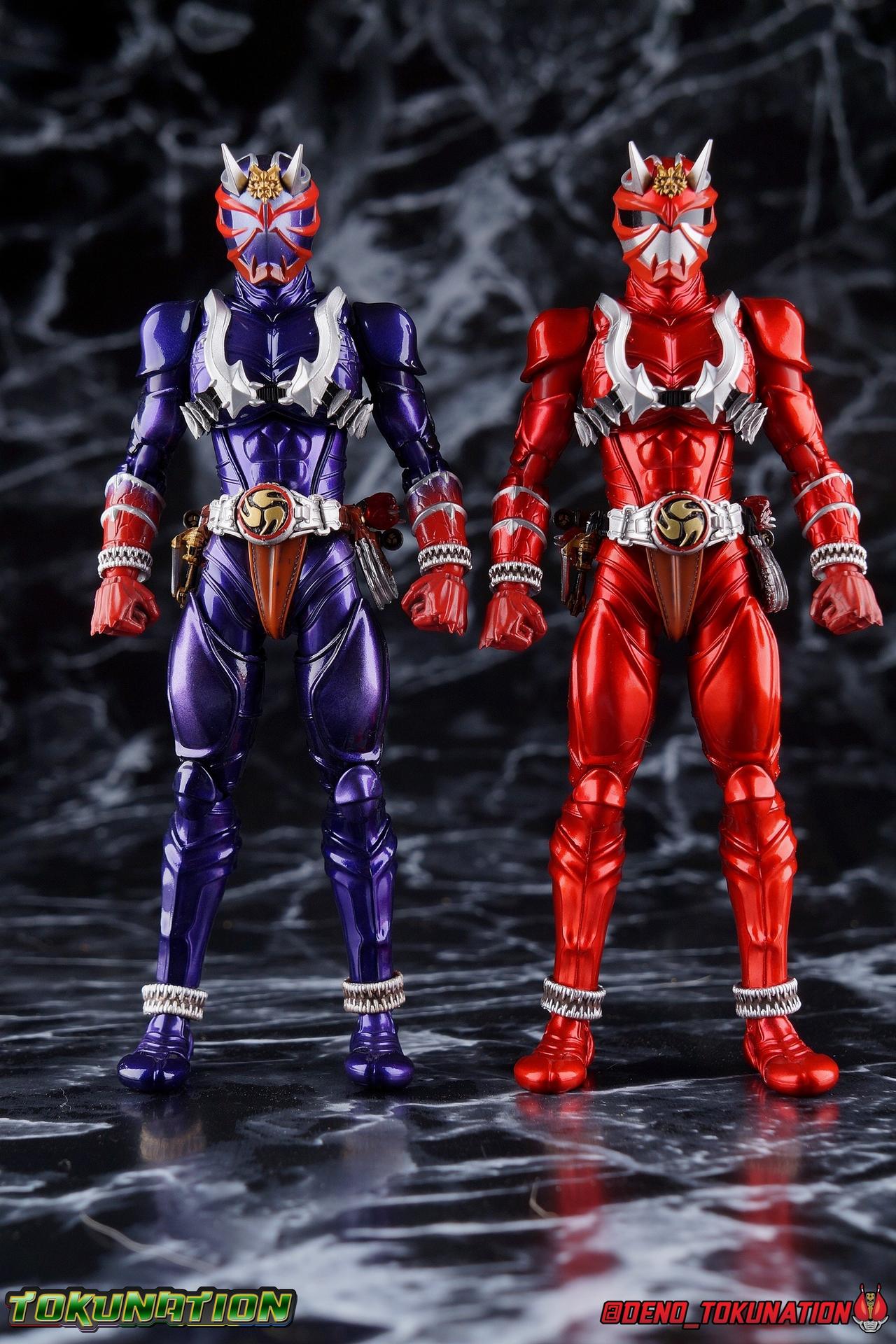 It is the Summer of Training. And while mentoring Todoroki's inconsistent practice of the Taiko drum, and even bestowing the Ongekibou to both Todoroki & Ibuki, Kamen Rider Hibiki furiously trains himself. Faster, stronger, hotter. Burning brighter than he ever has before, Hibiki must master the rhythm of his core once again and draw out the full potential of his Ongekibou. Without this strength, the deadly Dorotabou will continue to multiply, wreaking havoc on the local villages. With a fire of strength raging in his heart, Hibiki explodes into a new form, Kamen Rider Hibiki Kurenai! Packaging Hibiki Kurenai comes in that familiar and collector friendly packaging this line has come to be known for. No massive changes here even from the first Seihou Hibiki release from 6 years ago, the only differenes here being the stock imagery and the front facing portrait. It's a stylish box type even if it feels a little bit more stale each time. I do appreciate when they change things up more with releases like Ankh, Den-O, & Kiba. Main Figure Obviously, Shinkocchou Seihou Hibiki was one of the first figures of the entire Seihou line, predated only by Kabuto. So it's great to see that just over 6 years later, that this fantastic mold has returned to the line with this explosive form. The 3 previous releases in the Hibiki line, Ibuki Todoroki & Zanki, were all magnificent and brought something new and unique to this body type. At their core each shares the basic body structure that Hibiki pioneered. With Hibiki Kurenai though, we finally circle back around the to original tooling of the mold. It's hard to say anything new about the mold itself. As I've gone into on 4 occasions now reviewing Hibiki releases, this is a stellar figure. Each iteration of the mold looks like a suit that's just walked off screen. Of the entire Seihou line, I think the Oni Riders by far look the most gorgeous and lifelike. I'll get into the usual in's and out's of the articulation scheme soon, but first I want to focus on the stunning paint apps on this beauty. The entire figure is decked out in a gorgeous metallic red in the same fashion as that metallic purple of the original release. The paint apps to the core body are largely the only change we see as well, though there are some additional red paint apps on the upper forearms giving them a uniform red look, and some new apps on the head giving Hibiki a much needed visor and mouth plate that really bring the design together. As always Tamashii's attention to detail is jaw dropping. Below we'll get into the articulation this mold has always boasted, but it won't be terribly different from my previous breakdowns of the Hibiki Riders. Feel free to skip down if you wish. The sculpt of this body type really brings to life these unique Oni Rider suits. In every way imaginable it captures the look of the on screen suit right down to the textured musculature, and the gloss of the armor really gives in that pleather/vinyl feel of an actual suit. The design process Seihou's go through has always been much much more involved than that of the standard figuarts line and the best examples of this were the special booklets included with Kabuto & the original Hibiki. When the design begins with a sort of skeletal inner frame, and builds out what would be like a suit over a real human body like this, you get a much more realistic application of articulation and proportion to the body as a result. Now despite the obvious color shift to red, Hibiki Kurenai is physically identical to the original release. When Bandai nails the basic design of the body, it can be truly astounding how outer level cosmetic changes can create a vastly different experience though. Even so, some of my minor gripes still exist. I've always found the legs to be odd. To me, they look really long and at odds with the torso, especially when bent for crouching poses. Something about them looks off. They function well enough, though I've always thought this mold had one of the more strange figuarts hip joints out there. While the part separation undoubtedly gives them great range, the hips look very small by the time you angle them out fully, making the thigh seem huge by comparison. And while the knees function just fine, the feet could have slightly more range. The only unchanged part of the legs color wise, is the silver bands which adorn Kurenai's ankles. Hibiki Kurenai's belt is really loaded up with accessories like his predecessors as well. This figure comes with a lot and luckily you can store some of it on his belt given the display options you've chosen. When loaded out for static poses, the left hip can be outfitted with a Disc Animal holster with 3 non-removable discs sculpted in. Or you can keep the out of box standard part attached which is an empty holster for when you want him to hold the discs in hand. At the center of the belt is the same Ongekiko Kaentsuzumi the original Hibiki had. This circular piece is removable to simulate how how Hibiki uses it like a taiko drum for Ongeki Da finishers. It can be used with any Oni Rider that has a similarly designed belt. The right hip features Hibiki's signature transformation tuning fork, the Henshin Onsa Onkaku in it's collapsed form, though a standard open one is included for use with the figure as well. The back side of the belt can either feature an empty Ongekibou holster or a part is included showing them stored away. If you're paying attention you'll see that in a few photos below I forgot to remove them until well after this shoot was over. Once again the upper body is identical to classic Hibiki. The torso is a beautiful glossy read offset by that magnificently sculpted chest harness that goes around the back as well. The upper and lower halves of the torso move independent of one another, though it's a tight fit to get either to move very far. I've always felt this body type was a bit stiff, but it gets the job done very nicely still. Kurenai's arms 