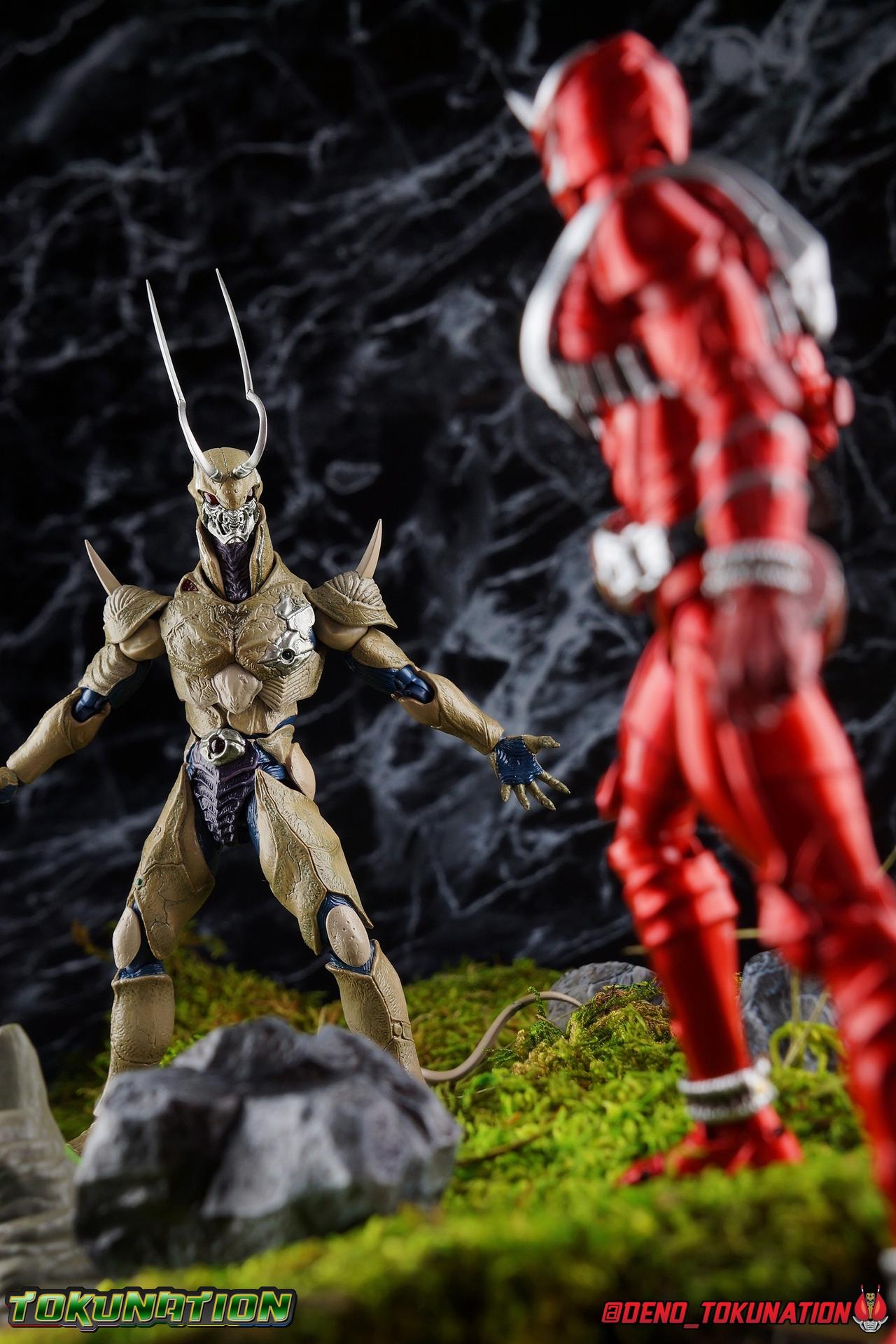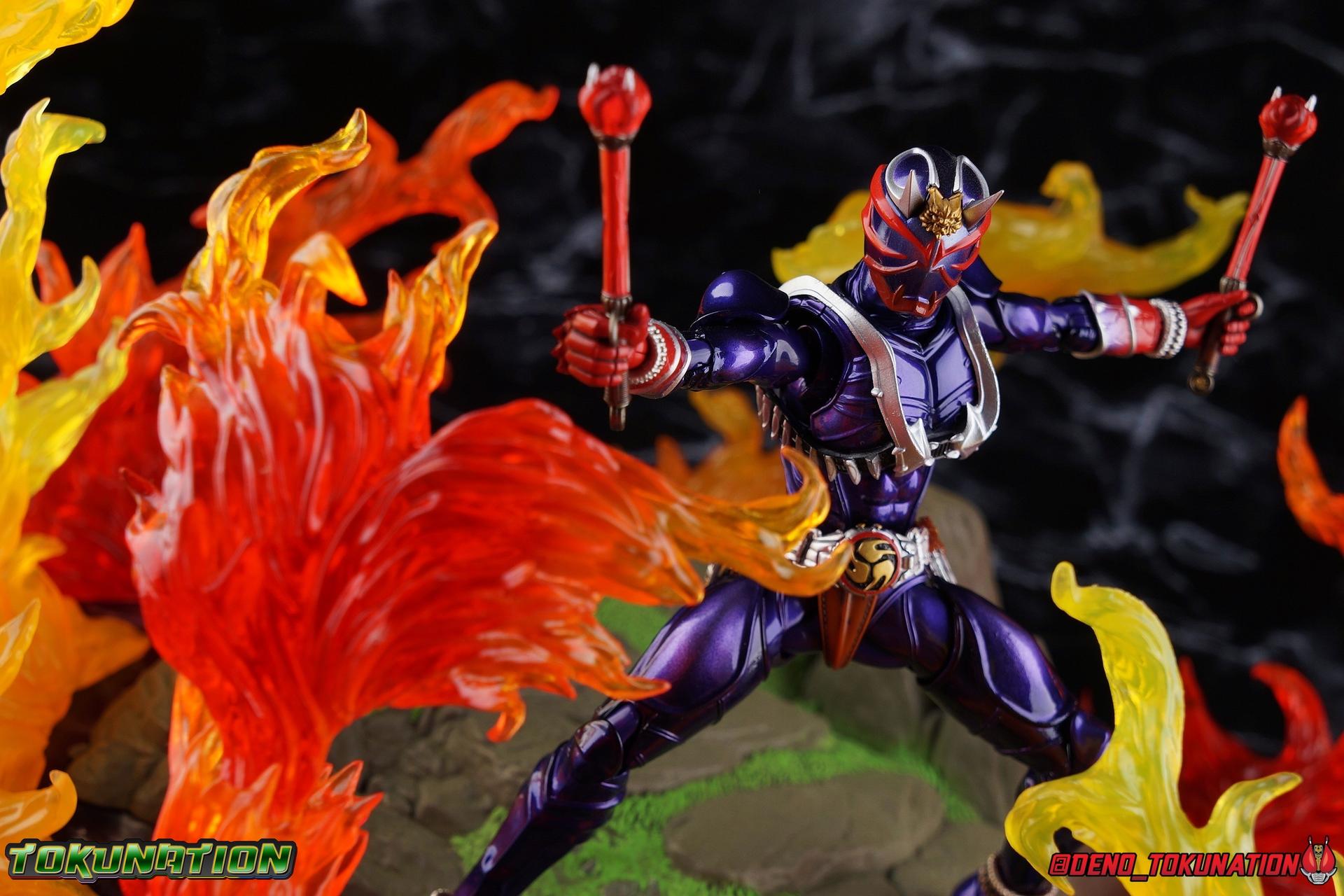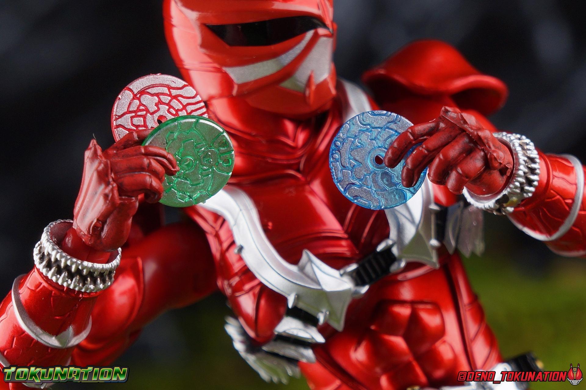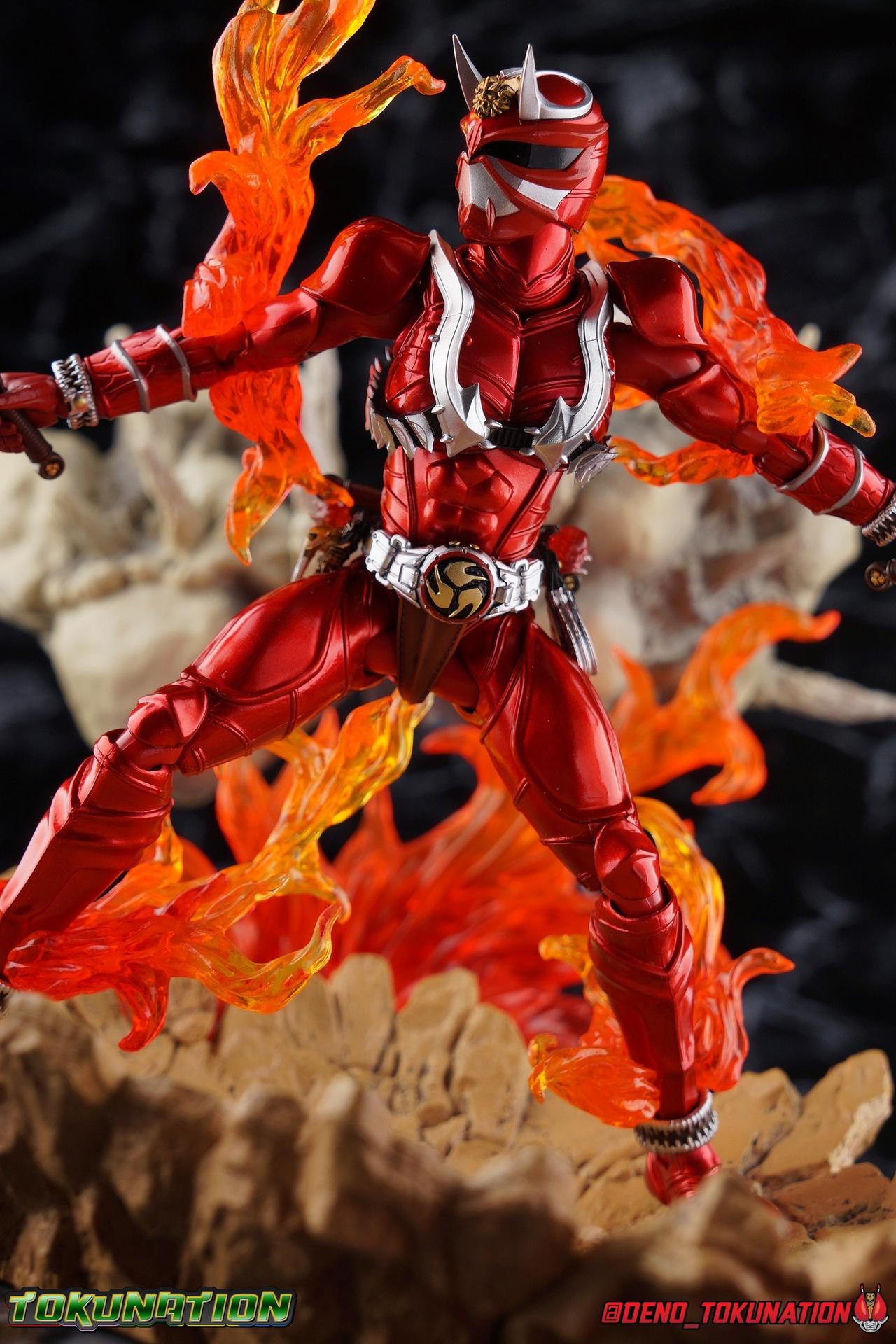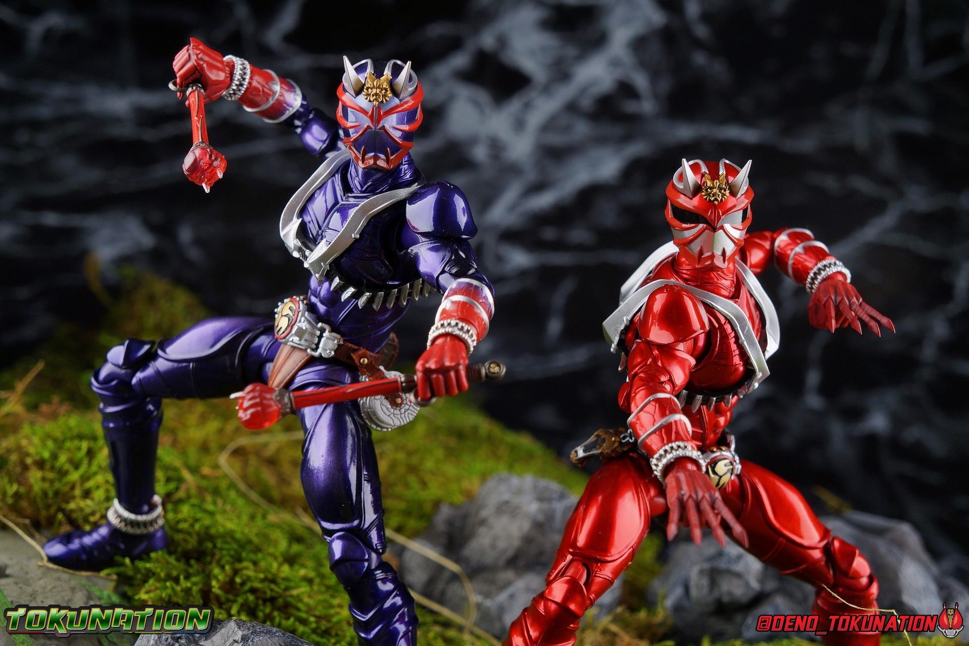 It is the Summer of Training. And while mentoring Todoroki's inconsistent practice of the Taiko drum, and even bestowing the Ongekibou to both Todoroki & Ibuki, Kamen Rider Hibiki furiously trains himself. Faster, stronger, hotter. Burning brighter than he ever has before, Hibiki must master the rhythm of his core once again and draw out the full potential of his Ongekibou. Without this strength, the deadly Dorotabou will continue to multiply, wreaking havoc on the local villages. With a fire of strength raging in his heart, Hibiki explodes into a new form, Kamen Rider Hibiki Kurenai! Packaging Hibiki Kurenai comes in that familiar and collector friendly packaging this line has come to be known for. No massive changes here even from the first Seihou Hibiki release from 6 years ago, the only differenes here being the stock imagery and the front facing portrait. It's a stylish box type even if it feels a little bit more stale each time. I do appreciate when they change things up more with releases like Ankh, Den-O, & Kiba. Main Figure Obviously, Shinkocchou Seihou Hibiki was one of the first figures of the entire Seihou line, predated only by Kabuto. So it's great to see that just over 6 years later, that this fantastic mold has returned to the line with this explosive form. The 3 previous releases in the Hibiki line, Ibuki Todoroki & Zanki, were all magnificent and brought something new and unique to this body type. At their core each shares the basic body structure that Hibiki pioneered. With Hibiki Kurenai though, we finally circle back around the to original tooling of the mold. It's hard to say anything new about the mold itself. As I've gone into on 4 occasions now reviewing Hibiki releases, this is a stellar figure. Each iteration of the mold looks like a suit that's just walked off screen. Of the entire Seihou line, I think the Oni Riders by far look the most gorgeous and lifelike. I'll get into the usual in's and out's of the articulation scheme soon, but first I want to focus on the stunning paint apps on this beauty. The entire figure is decked out in a gorgeous metallic red in the same fashion as that metallic purple of the original release. The paint apps to the core body are largely the only change we see as well, though there are some additional red paint apps on the upper forearms giving them a uniform red look, and some new apps on the head giving Hibiki a much needed visor and mouth plate that really bring the design together. As always Tamashii's attention to detail is jaw dropping. Below we'll get into the articulation this mold has always boasted, but it won't be terribly different from my previous breakdowns of the Hibiki Riders. Feel free to skip down if you wish. The sculpt of this body type really brings to life these unique Oni Rider suits. In every way imaginable it captures the look of the on screen suit right down to the textured musculature, and the gloss of the armor really gives in that pleather/vinyl feel of an actual suit. The design process Seihou's go through has always been much much more involved than that of the standard figuarts line and the best examples of this were the special booklets included with Kabuto & the original Hibiki. When the design begins with a sort of skeletal inner frame, and builds out what would be like a suit over a real human body like this, you get a much more realistic application of articulation and proportion to the body as a result. Now despite the obvious color shift to red, Hibiki Kurenai is physically identical to the original release. When Bandai nails the basic design of the body, it can be truly astounding how outer level cosmetic changes can create a vastly different experience though. Even so, some of my minor gripes still exist. I've always found the legs to be odd. To me, they look really long and at odds with the torso, especially when bent for crouching poses. Something about them looks off. They function well enough, though I've always thought this mold had one of the more strange figuarts hip joints out there. While the part separation undoubtedly gives them great range, the hips look very small by the time you angle them out fully, making the thigh seem huge by comparison. And while the knees function just fine, the feet could have slightly more range. The only unchanged part of the legs color wise, is the silver bands which adorn Kurenai's ankles. Hibiki Kurenai's belt is really loaded up with accessories like his predecessors as well. This figure comes with a lot and luckily you can store some of it on his belt given the display options you've chosen. When loaded out for static poses, the left hip can be outfitted with a Disc Animal holster with 3 non-removable discs sculpted in. Or you can keep the out of box standard part attached which is an empty holster for when you want him to hold the discs in hand. At the center of the belt is the same Ongekiko Kaentsuzumi the original Hibiki had. This circular piece is removable to simulate how how Hibiki uses it like a taiko drum for Ongeki Da finishers. It can be used with any Oni Rider that has a similarly designed belt. The right hip features Hibiki's signature transformation tuning fork, the Henshin Onsa Onkaku in it's collapsed form, though a standard open one is included for use with the figure as well. The back side of the belt can either feature an empty Ongekibou holster or a part is included showing them stored away. If you're paying attention you'll see that in a few photos below I forgot to remove them until well after this shoot was over. Once again the upper body is identical to classic Hibiki. The torso is a beautiful glossy read offset by that magnificently sculpted chest harness that goes around the back as well. The upper and lower halves of the torso move independent of one another, though it's a tight fit to get either to move very far. I've always felt this body type was a bit stiff, but it gets the job done very nicely still. Kurenai's arms 
