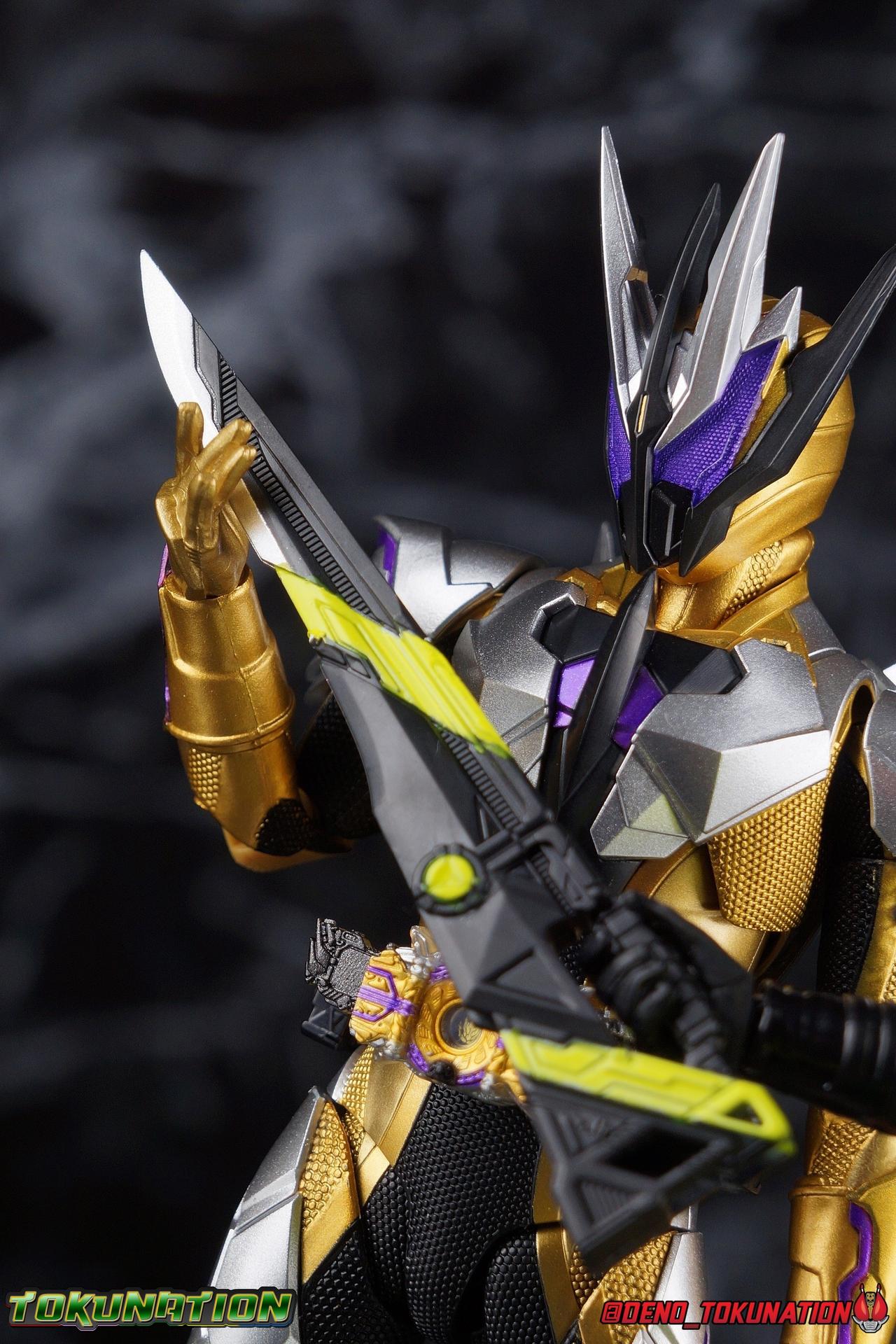 The cruelty of humanity. That is what Gai Amatsu instilled in Satellite Ark. In doing so he instigated not only the Daybreak Town Incident, but also the creation of Metsuboujinrai.net, and all the pain to come for both humans & humagears. For 12 years Gai has manipulated events from the comfortable shadows of ZAIA Enterprise. Now the mysterious man behind A.I.M.S. has his sights set on Hiden Intelligence as well, but can Zero-One keep his grandfather's company safe? Gai Amatsu is a master manipulator, and maybe one day, he could even be a hero. But for now? With strength that's 1000% greater than Zero-One's, the golden solider Kamen Rider Thouser is born! Packaging Keeping in line with the sort of packaging the Zero-One line has had, Thouser arrives in a mostly white box, but with appropriately ostentatious gold details and lettering. There are no fun black light gimmicks or anything like that with Thouser's box. Just some really standard stock photos and a nice portrait of the figure across the front. Nothing special to report this go around. Figure time! Main Figure Unfortunately I've yet to be able to handle all the riders from Zero-One so far. Having missed Horobi, Jin, & Valkyrie, I feel like I need to preface this review. Because I don't feel like I have a complete picture of the Zero-One Figuarts line yet without them. So if my impressions of Thouser are way off base, I apologize. That being said, while he's certainly the most ornately detailed of the Zero-One riders, he has a number of flaws as well that need to be addressed as this line continues. Zero-One really set the standard for this line. An absolutely rock solid release to kick off a new line up of rider figuarts, which doesn't always happen. And while I thought he was fantastic, I did feel Vulcan was a less than perfect follow up. With Thouser much of what we see is new, but there's a lot of familiarity as well. The basic form of the Zero-One mold is there, but Thouser still manages to be very different. In the legs we can see the exact same textured black detailing between the two, but the armor that covers it is entirely different. So these two do share at least some parts. However what they don't share is the same range of articulation. Thouser has very restricted ankles, largely due to the design of the ankle cuff, where it drops down around the back of the foot. This nixes almost all of the outward movement of the foot, so good luck with wide stances. The knee bends are fortunately spared, having been directly carried over from Zero-One, no new armor to get in the way. The hip and thigh are largely identical, with only surface details having been changed for Thouser. However the thigh armor does extend further up toward the waist on him as well. And because the drop down hips on this mold already don't go down very far, rotating the hips up to pose the figure is a dangerous preposition. Be very very careful to angle them correctly or you will damage the silver paint on the thighs. Bot overall I really like the way the legs look, the design is great and paint work magnificent. Around his waist, Thouser has the appropriately named Thousandriver. And much like the Zero-One Driver in this line, I feel like we've been a little cheated. The Zero-One Driver is essentially non-functional because it can't revert to it's closed pre-henshin state, and the Thousandriver is exactly the same. The two halves that cover the window of the driver are permanently molded open. So even if you remove the keys you can't really recreate the closed driver. As for the keys we get the Amazing Caucasus Progrisekey & Awaking Arsino Zetsumerisekey. Only the Caucasus key has any detail and that's just the emblem on the end of the key that winds up being in the driver window. Outside of this both keys are just black plastic. The Driver looks fantastic, but it feels half realized, much like the Forceriser. The belt also has Key holsters on each hip, but considering so far there are no closed Progrise or Zetsumerise Keys in this line that I'm aware of, these holsters are entirely pointless. The ab section of the torso is very very similar to Zero-One, it's possibly the same part, though there are some details sculpted into the surface like fabric folds on Thouser. The upper body is the big difference with Thouser having completely newly sculpted armor and some really bright regal colors. But Thouser's armor is also quite thick? The chest armor sticks out a fair bit further than Zero-One, nearly as far out as the Thousandriver. Luckily the torso's articulation is nearly the same as Zero-One. We get a full rotating waist joint, and a ball jointed upper body that can lean about 45 degrees to either side, with a fair bit of room to arch the back. Thouser also features quite similar arms to Zero-One. They're essentially the same, again with new armor for Thouser. Thankfully this means we get the same basic elbow bend and wrist articulation. However the shoulders are a different story. Largely because of the large new shoulder pads which Thouser sports. Covering a greater portion of the joint, and having less range to move, the pad limits what the arms can do. Leaving us with about a 45 degree bend in straight out and upward movement. This is a bummer but it wasn't unexpected as well. Finally, probably the most interesting thing about the Thouser design, is his helmet. It's a harsh, striking design that certainly looks like the bad guy. Even despite Gai's change of heart later in the series, the design still speaks to it's villainous origins. Early concept art for Thouser had the compound eyes in blue and I think that actually would have gone a long way to making the suit look more heroic overall. As is there's some great royal purple compound eyes set amongst a crown of beetle horns. Luckily all the added bulk of the head itself and the armor of the torso don't really impact how the head can maneuver. While the figure has plenty of areas that should have